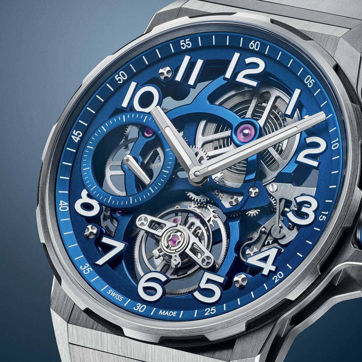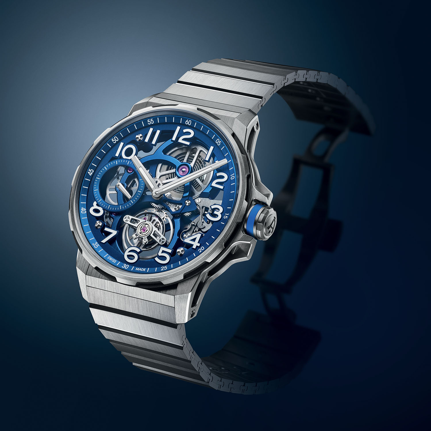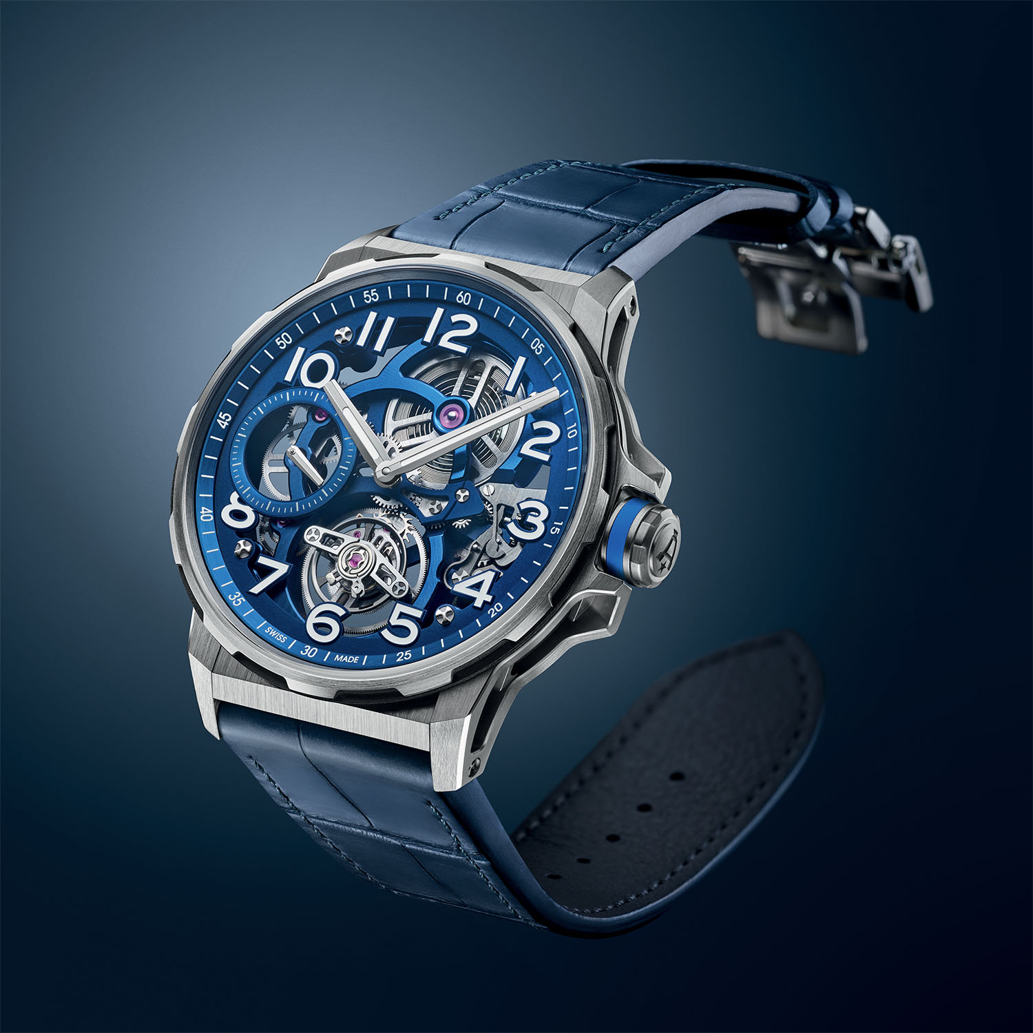 The Angelus Flying Tourbillon Titanium is available either on a single-link titanium brushed bracelet or a blue alligator strap. Both versions also feature an additional blue rubber strap, and all are equipped with a quick-change system. Available as a limited edition of 25 pieces, the Flying Tourbillon Titanium Blue retails at CHF 45,000 on leather strap and CHF 47,000 on titanium bracelet. For more details, please visit angelus-watches.com.