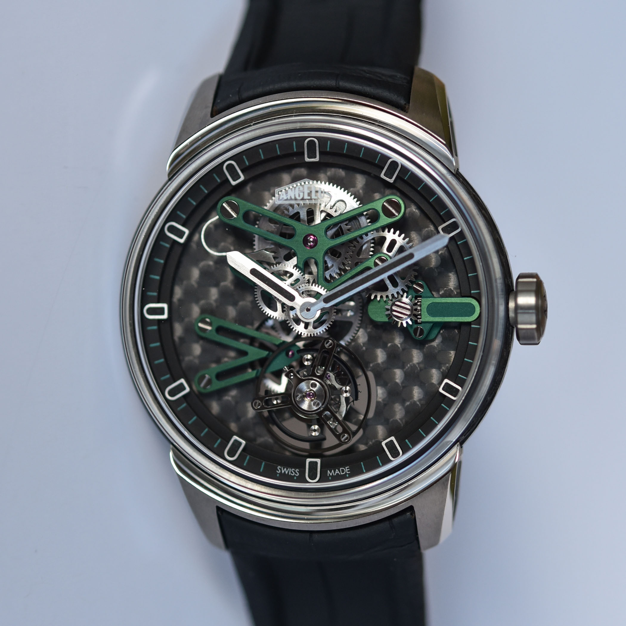 The new Angelus U23 Carbon Cocktail is a sporty, modern flying tourbillon. This attention-grabbing watch is built around a skeletonized movement, the calibre A-250 that reveals its architecture. A CTP carbon mainplate provides the background for the components that are crafted from technical materials and laid bare. The structure of the movement revolves around the symmetry of the barrel at 12 o’clock and the tourbillon at 6 o’clock. A gear train between the two ensures transmission and feels like floating.