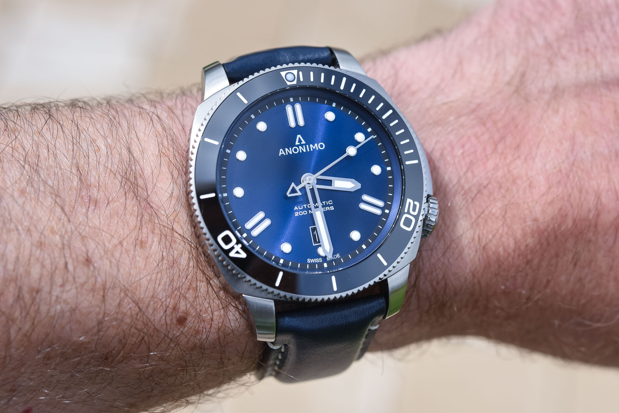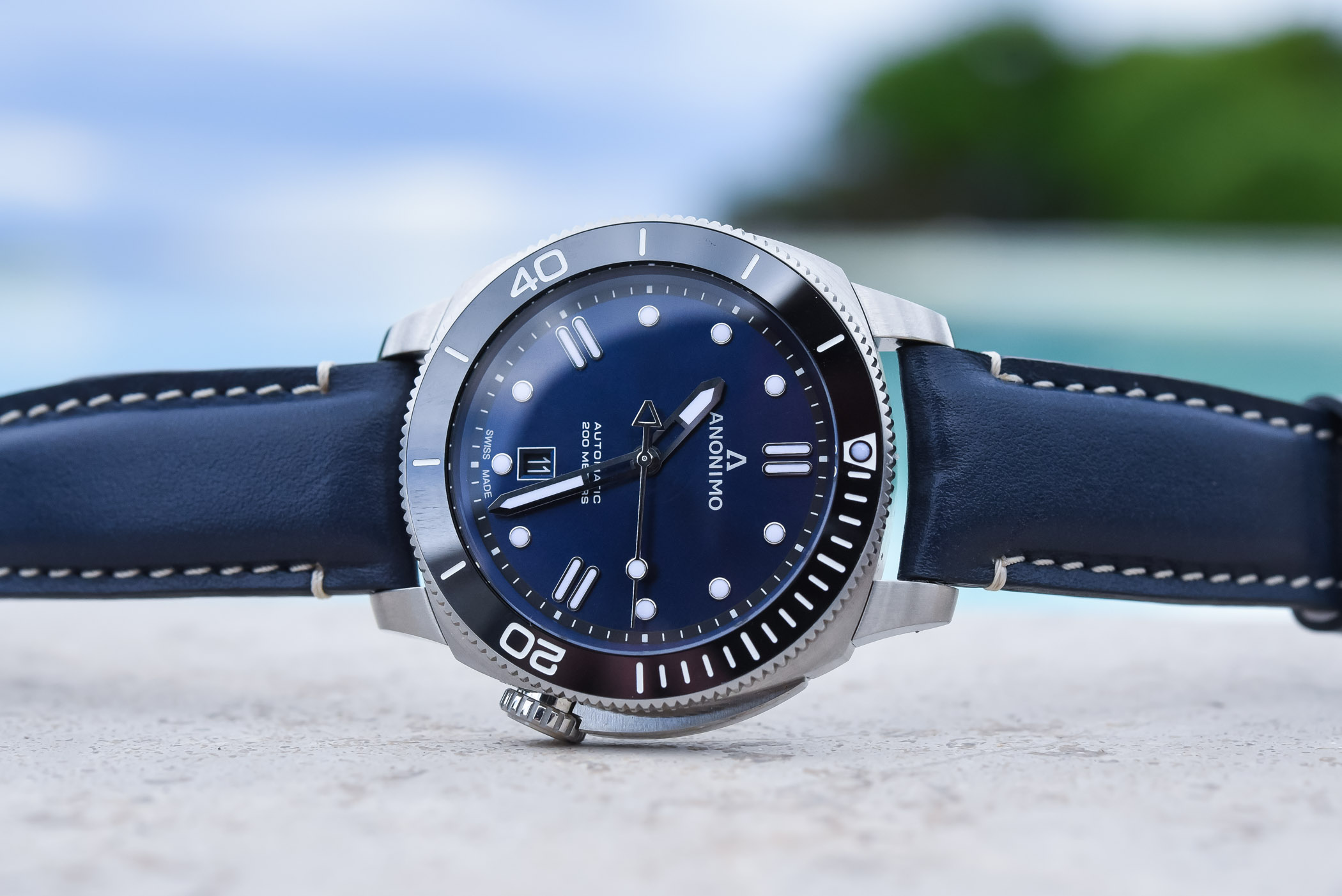 The first new summer edition has a navy-blue sunray dial with a black ceramic insert in the unidirectional, fluted bezel. The dial has the new double markers at 12, 4 and 8 o’clock that form the brand’s signature triangle that we saw last year. The date is again at 6 o’clock and doesn’t interfere with the round marker below. The indices, hour and minute hands are treated with Super-LumiNova®, as is the tip of the seconds hand with Anonimo’s triangle logo as the counterweight. The bezel has a 15-minute detailed scale and the 20 and 40-minute marks have numerals, forming another triangle with the top marker that matches the dial. It’s a nice attention to detail. The second new edition (not photographed here) has a matte blue dial and matching blue bezel. The only other visual difference is a red triangle as the counterweight on the seconds hand. It remains silver on the first.
