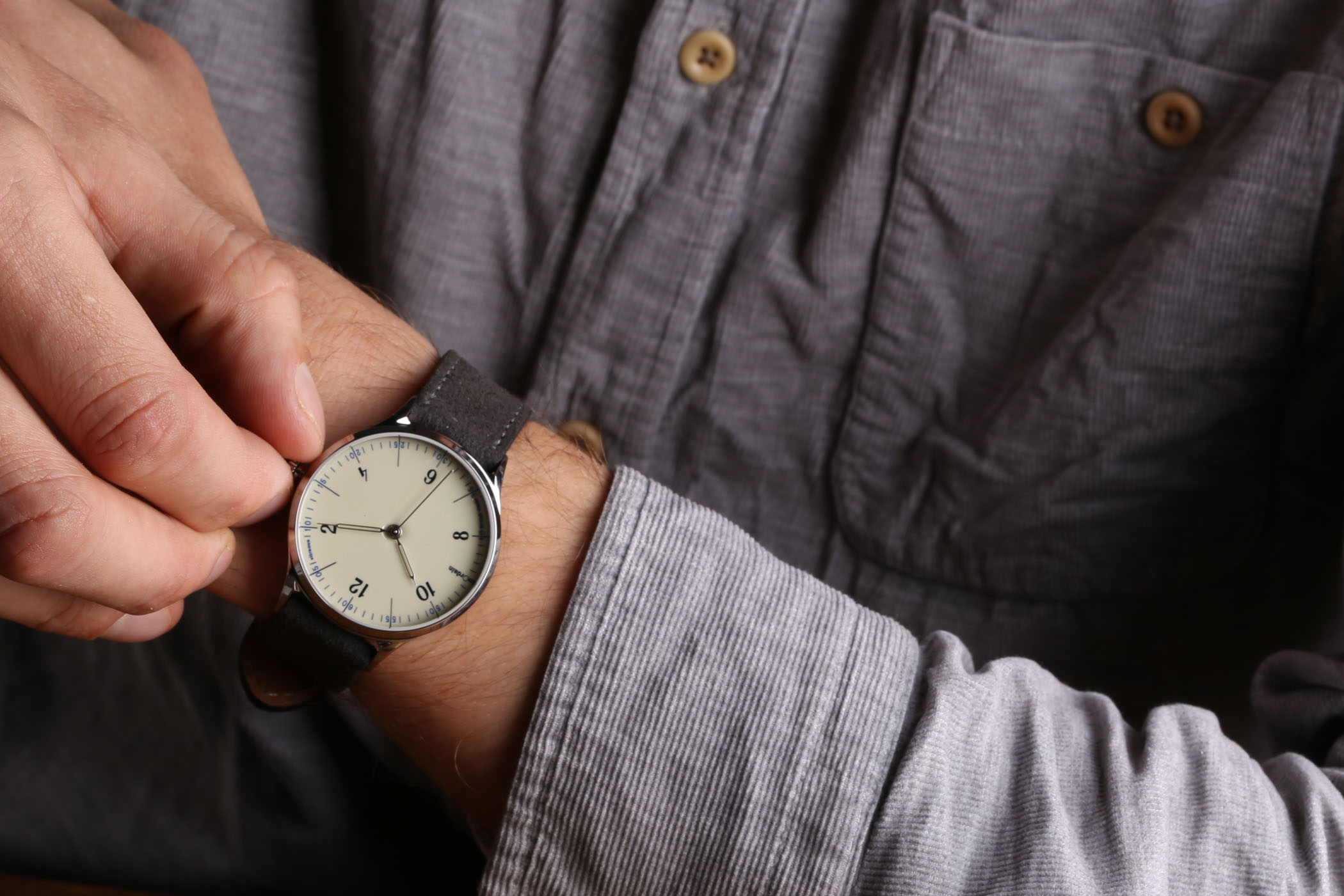 The company’s first watch is called the Model 1. Presented in a 38mm polished steel case hardened to 800 Vickers (about 5 times harder than standard steel), it wears very comfortably on the wrist. The lugs curve slightly downwards to ensure a snug fit and pair nicely with an Italian shell cordovan or hypoallergenic suede strap. Visually the design is relatively simple, but it’s very nicely executed and provides the perfect backdrop for the main attraction; the dial.