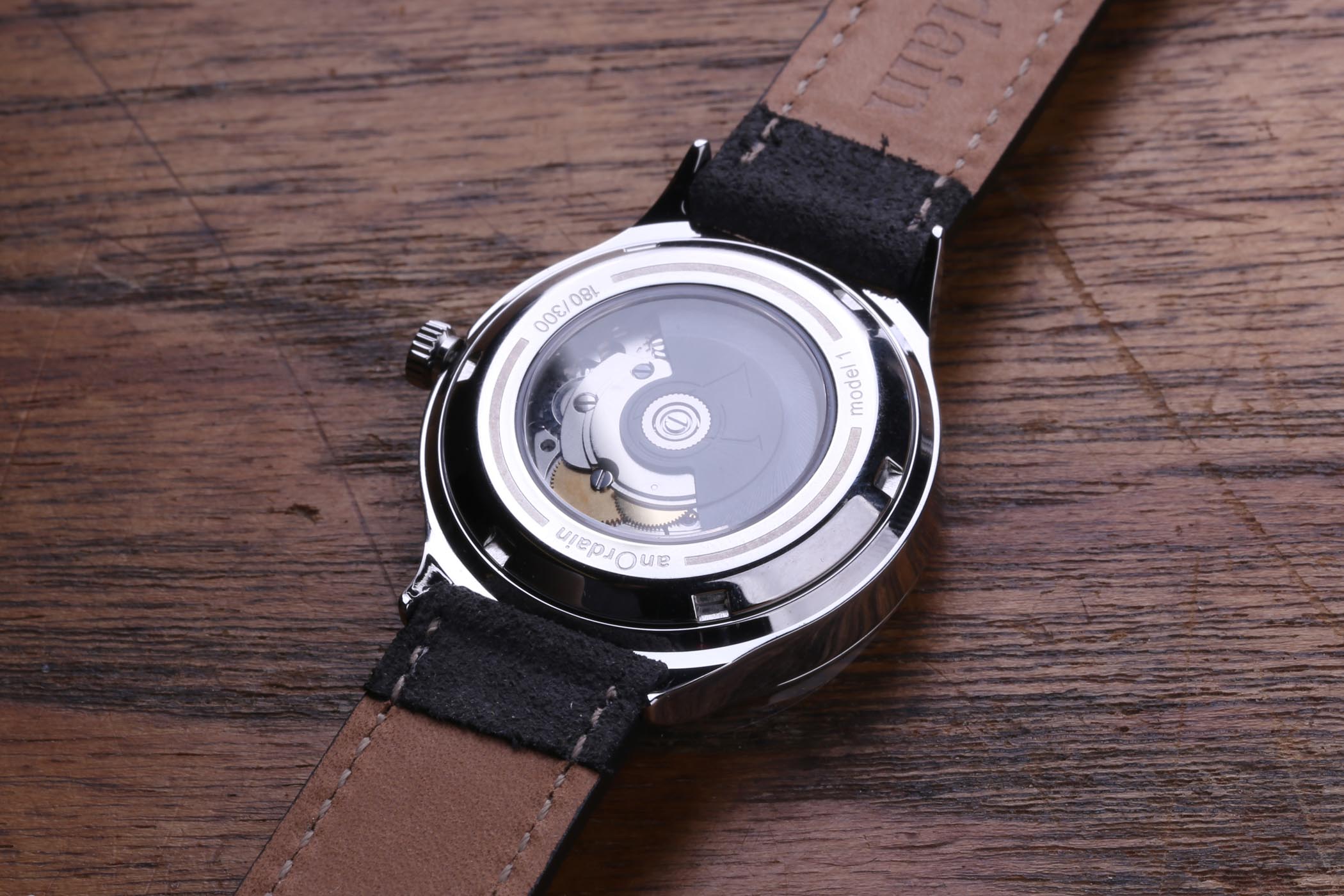 Turning the Model 1 over, we find a sapphire exhibition caseback. Underneath is a Swiss made Sellita SW200-1 automatic movement with Incabloc protection. It’s a time-tested movement used by a number of brands – established and newcomers alike – and offers a modest 38-hour power reserve. The movement is the only part of the watch that isn’t completely bespoke, although the anOrdain version does feature a custom blackened rotor.