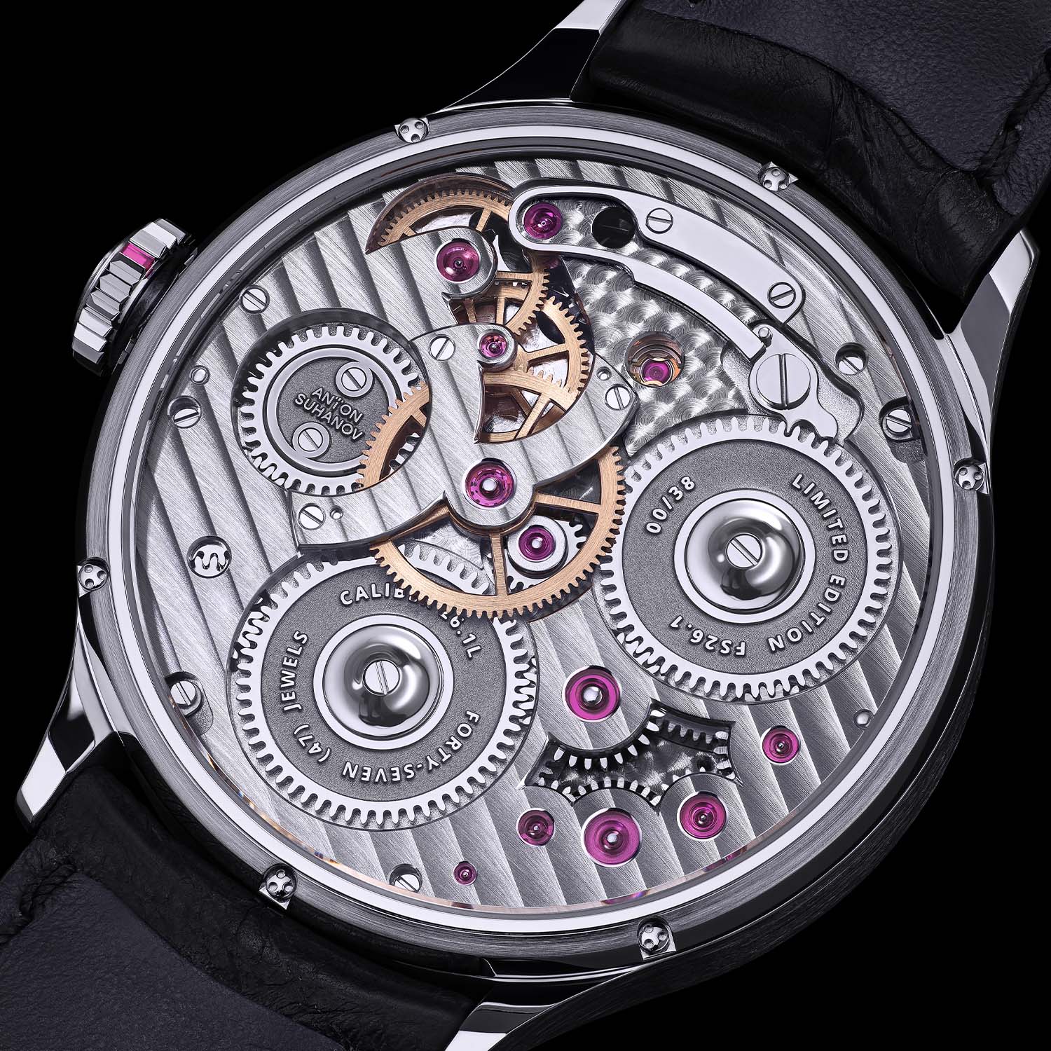 The Flamingo is powered by the in-house hand-wound calibre Su26.1L, developed over four years. The movement features twin barrels delivering an 84-hour power reserve. The architecture is open and deliberate, with a Y-shaped bridge referencing St Petersburg. Finishing includes perlage, Côtes de Genève, with hand-polished internal angles.