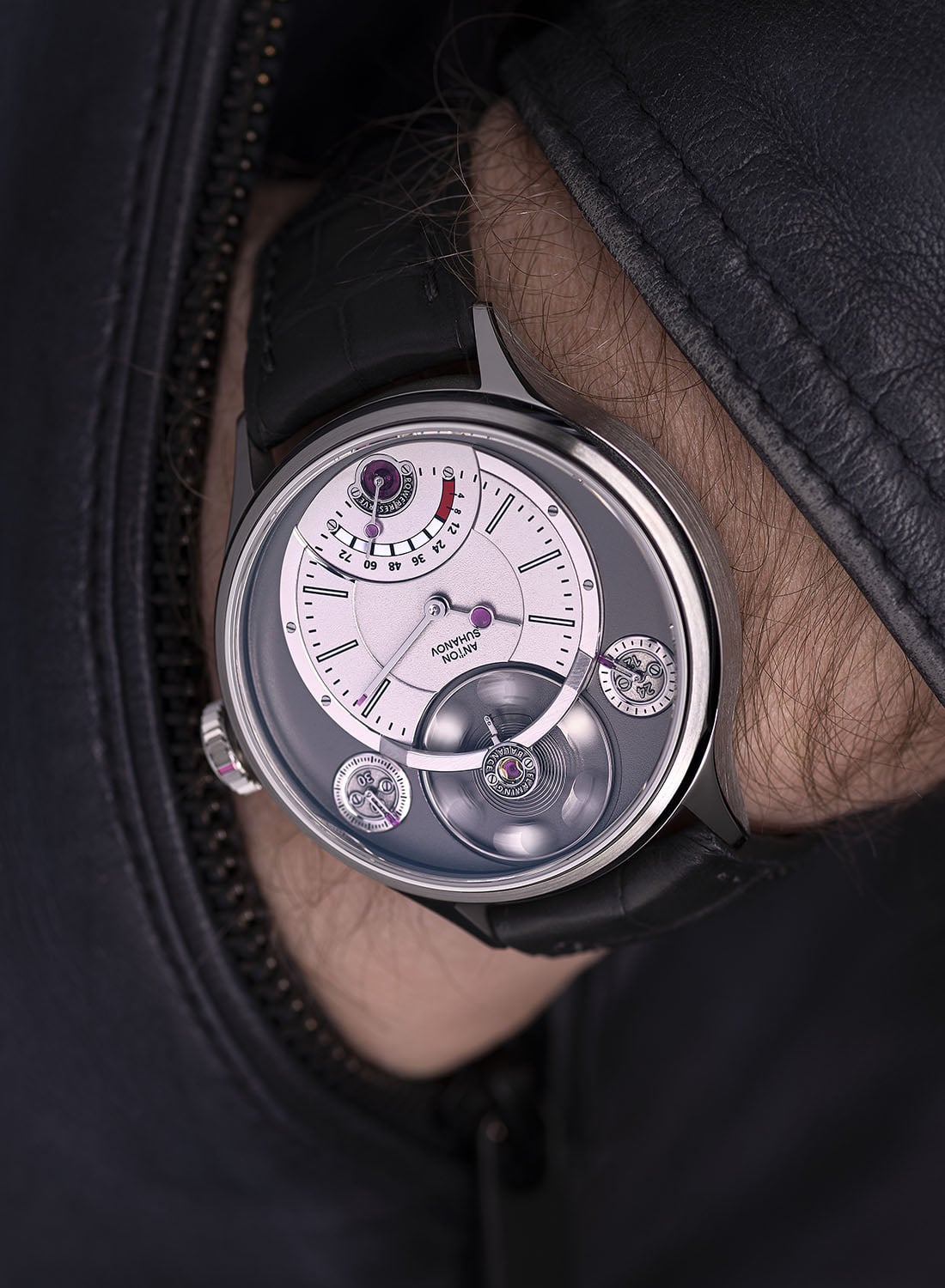 The Anton Suhanov Flamingo Wristwatch is worn on a grey alligator leather strap and a custom stainless steel pin buckle shaped like the balance bridge. The Flamingo is produced in a limited edition of 38 pieces; the price is upon request. For more information, please visit Anton-Suhanov.com.