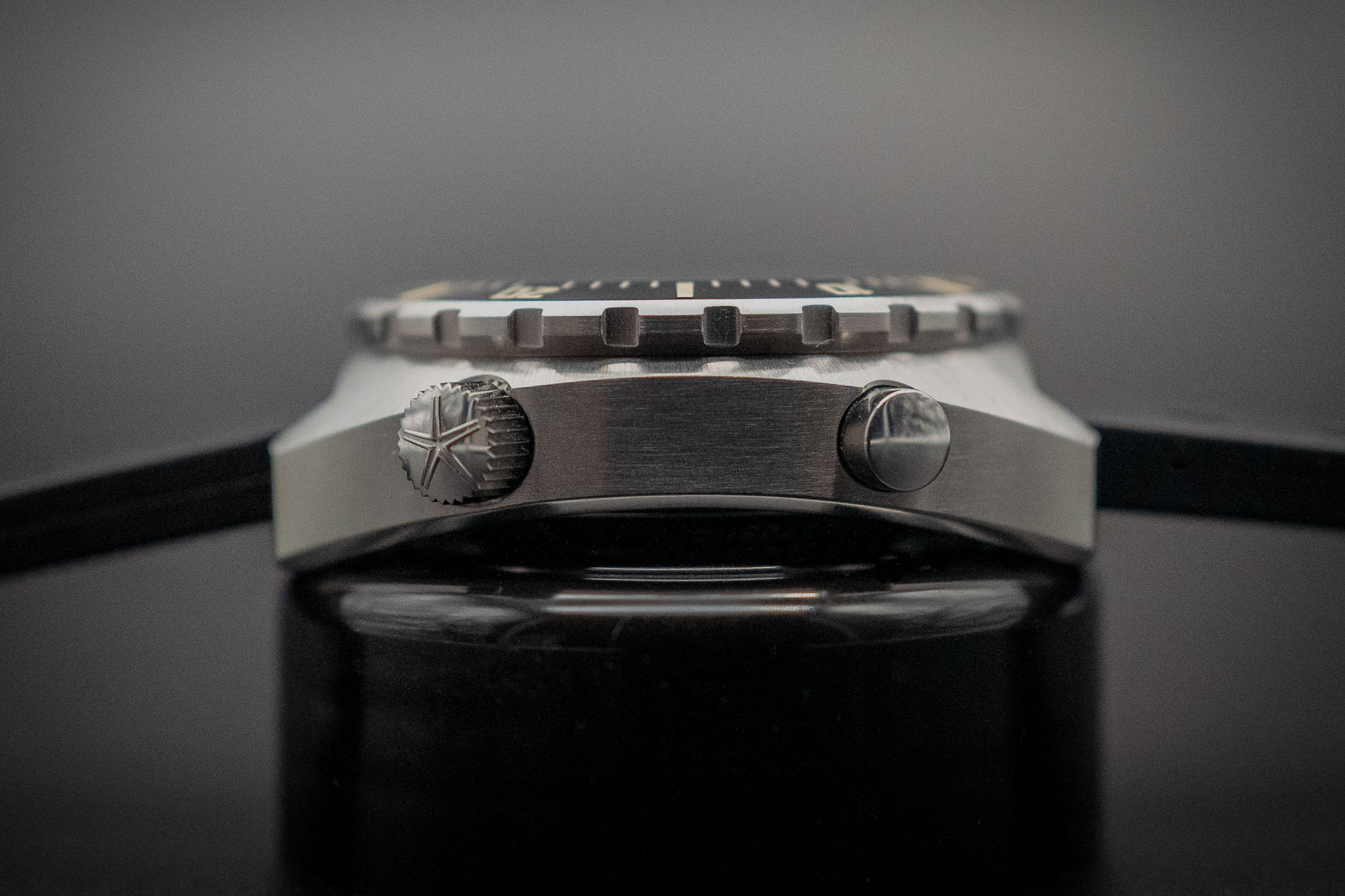 The unidirectional, 120-click ceramic bezel features lume-filled numerals and indices for low-light legibility. There is a screw-down crown that has been moved down to the 4 o’clock position from the 2 o’clock spot on the original. This puts the chronograph monopusher at the 2 o’clock spot which Aquastar says is a more natural position for easy actuation, and if basically every other chronograph in the world is to be believed, they might be right.