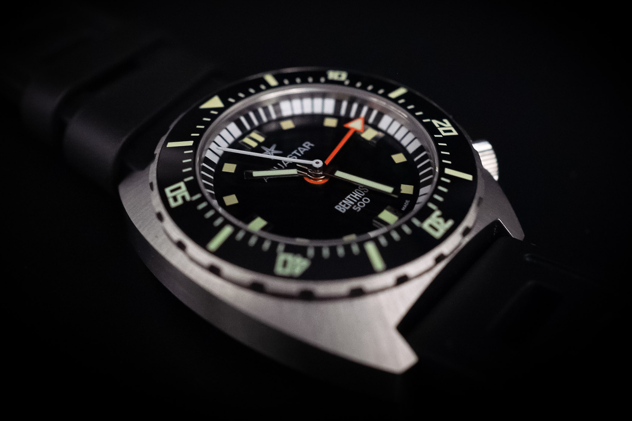 Over on the posterior, you will find a screw-down caseback engraved with the Aquastar logo and the word BENTHOS. Of note: the water resistance on this watch has been reduced to 200 metres from the namesake 500 metres of the original. Rick. Marei tells me this was to avoid adding another 3 or 4 millimetres to the thickness of the watch, which would have been required to hit that 500m number. While it would have been nice to see that 500 on there for the sake of historical accuracy, in the name of ergonomics and wearability this was probably the correct decision. Also, take into consideration that the likelihood of anyone diving this watch below 200 metres is basically nil. (Editor’s note: this is not to be considered a challenge.)