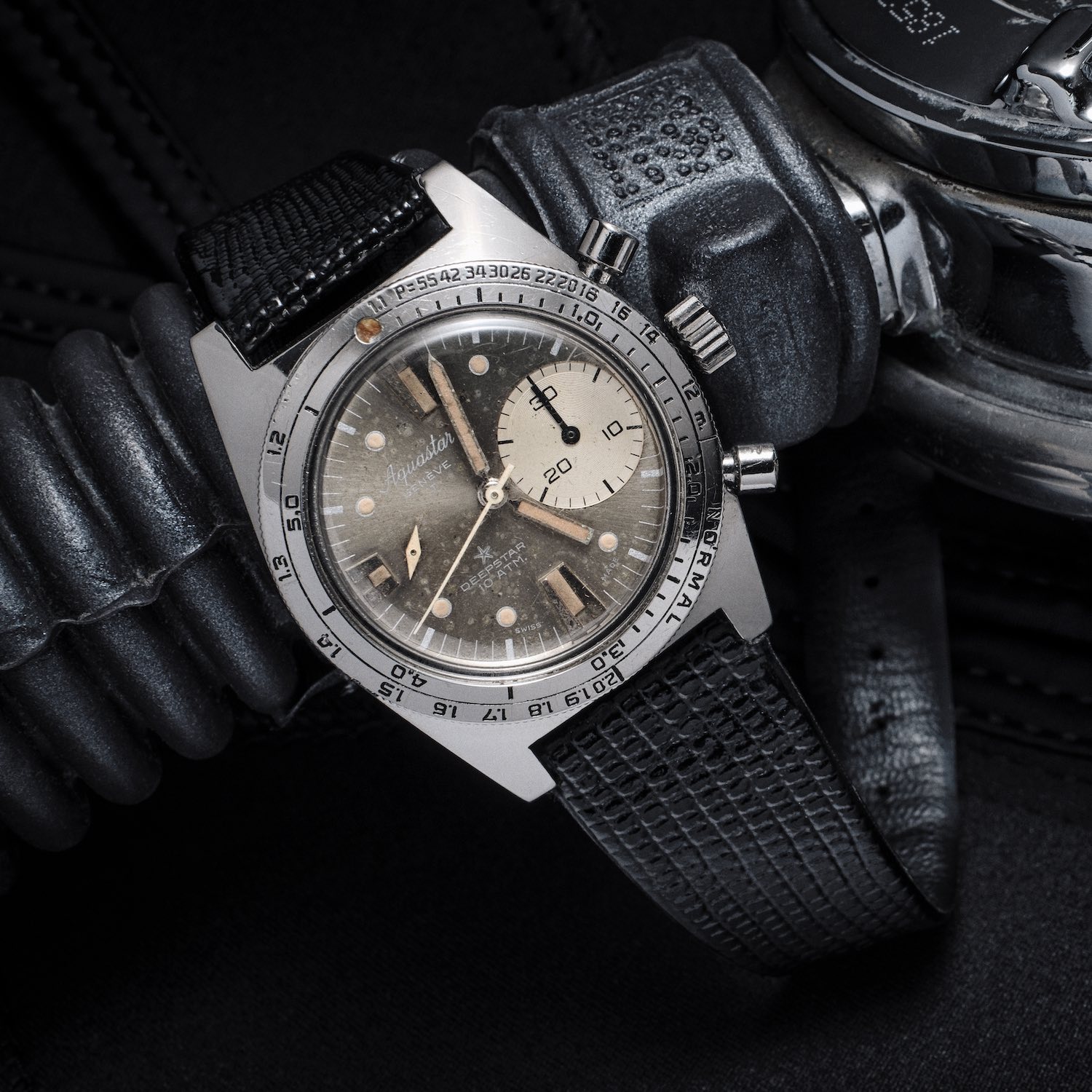 Most of the originality of the Aquastar Deepstar came from its hybrid combination of diving elements with a chronograph, as well as the unusual yet appealing layout of its dial – single contrasting counter and running indicator at 9 o’clock. The watch was powered by a hand-wound Valjoux 23, a 17-jewel column-wheel chronograph. The dial was available in dark purple and in this nice sunray-brushed grey colour.