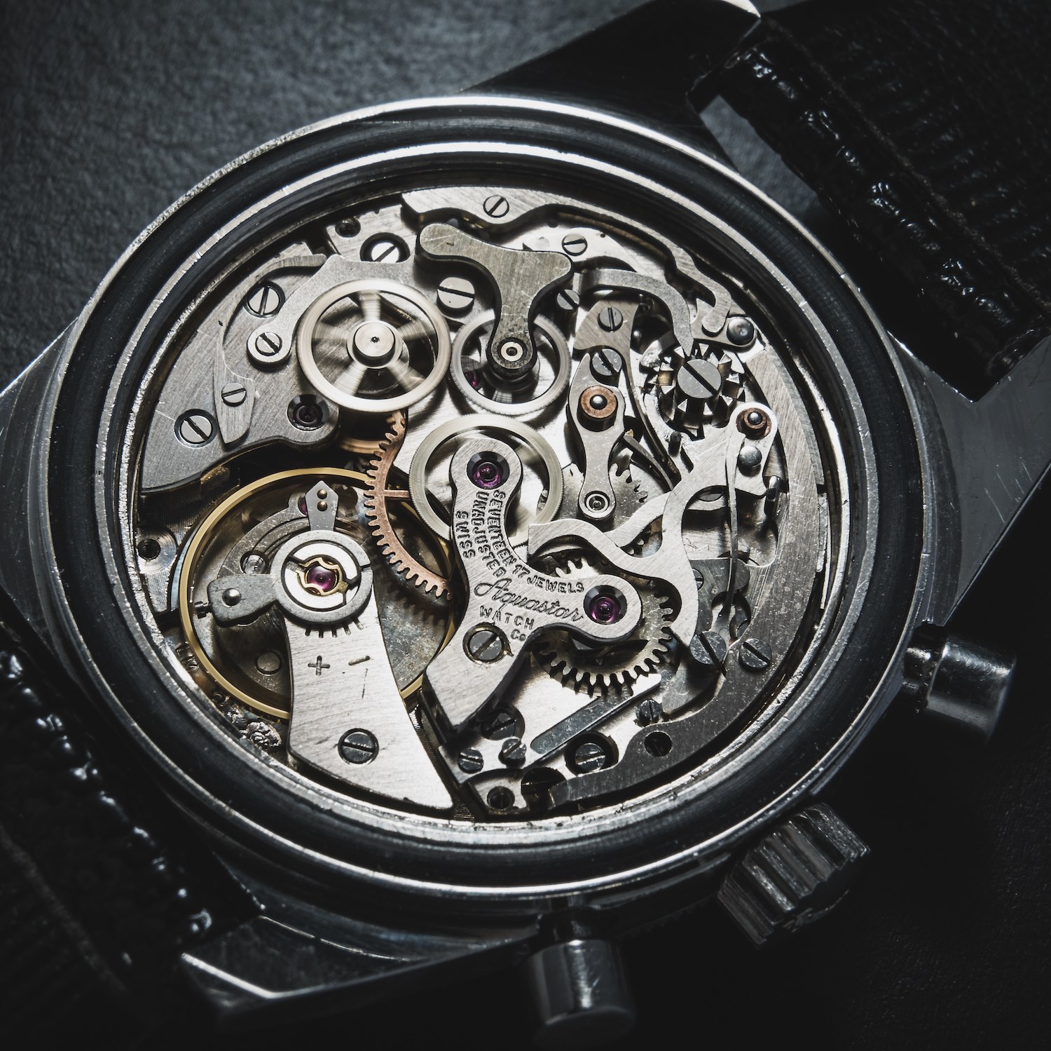 The most modern part of the watch is to be found inside the case. The original model was powered by a hand-wound Valjoux 23, which is of course not available anymore. But keeping in line with its sense of detail, the 2020 Deepstar Chronograph is equipped with a movement that stands out of the crowd of 7750-powered watches. Marei made the choice for an automatic chronograph with column wheel developed and manufactured by La Joux-Perret. Beating at 28,800 vibrations/hours, it boasts 55h of power reserve and, even though hidden behind a closed back, is nicely finished with blued screws, Geneva stripes and a personalized rotor. And thanks to the column wheel, actuating the pushers is far more pleasant than the firm click of a Valjoux.