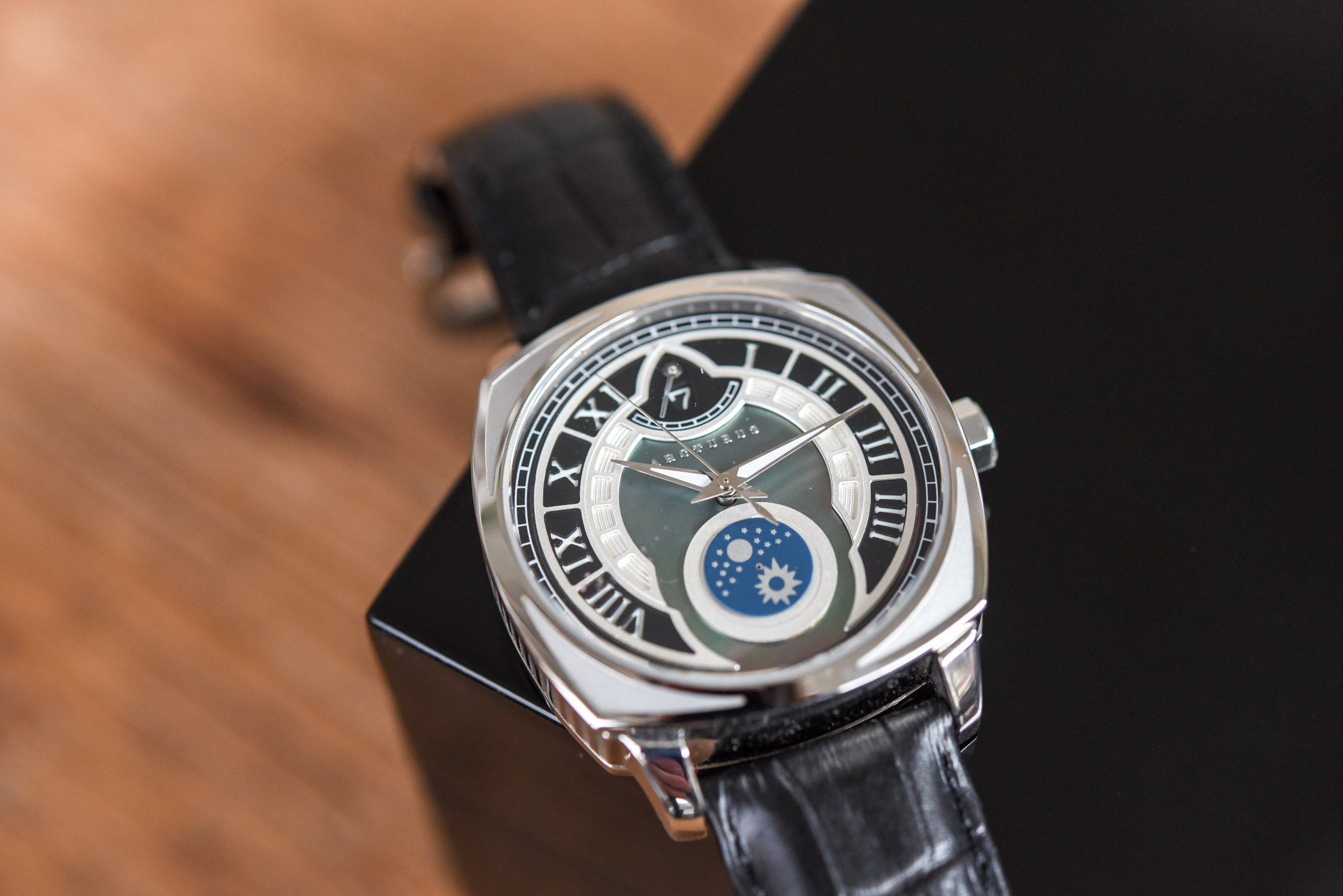 The dial of the Arcturus LC-1 is the main point of interest in this watch. Complex and based on several layers, it is clearly opulent and far from minimalist. Twelve individual components are used to create an effect of depth and an interesting contrast. The hour ring features cut-out Roman numerals, the minute track with concentric lines as well as the central part, is available in a choice of a textured (grained) central area or a mother-of-pearl plate. Each decoration is unique, with different patterns and reflections.