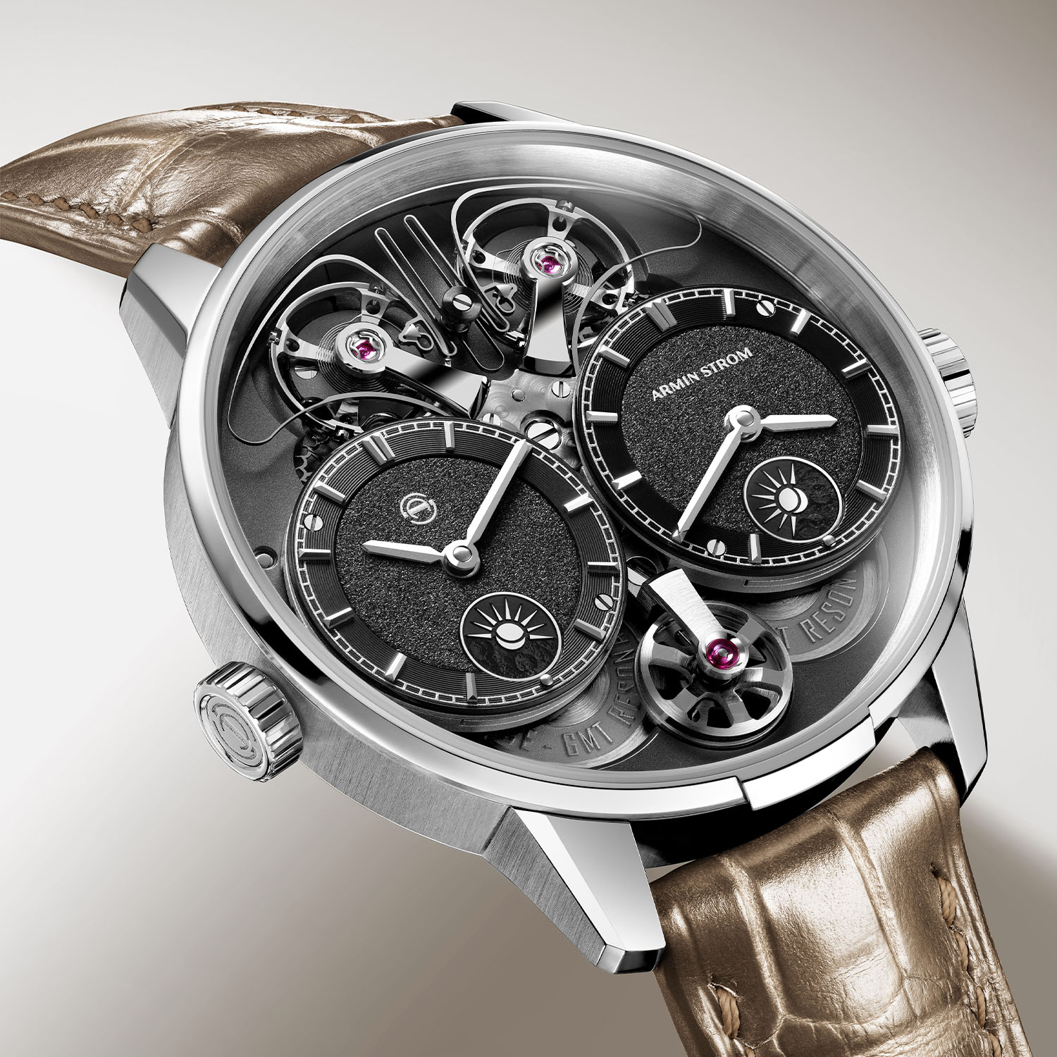 The Dual Time GMT Resonance Manufacture Black Edition is paired with a glossy taupe alligator strap and a steel pin buckle. It is a limited edition of 50 pieces and retails for CHF 95,000. More information at arminstrom.com.