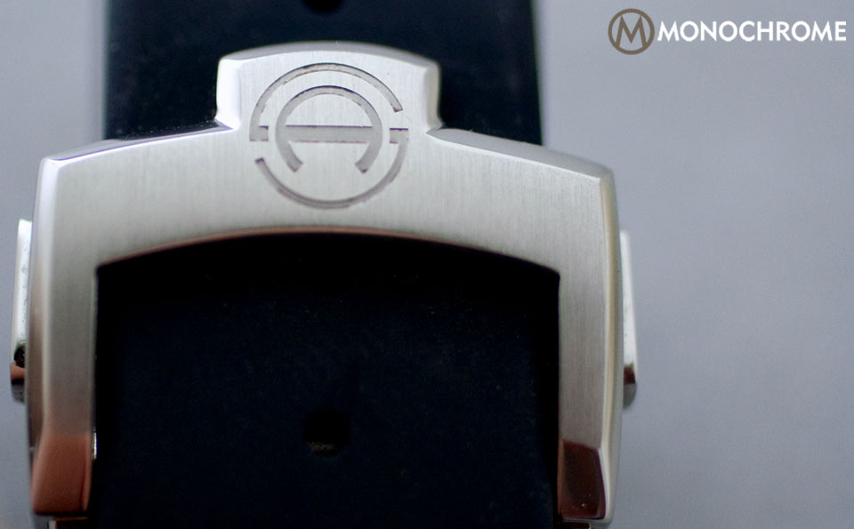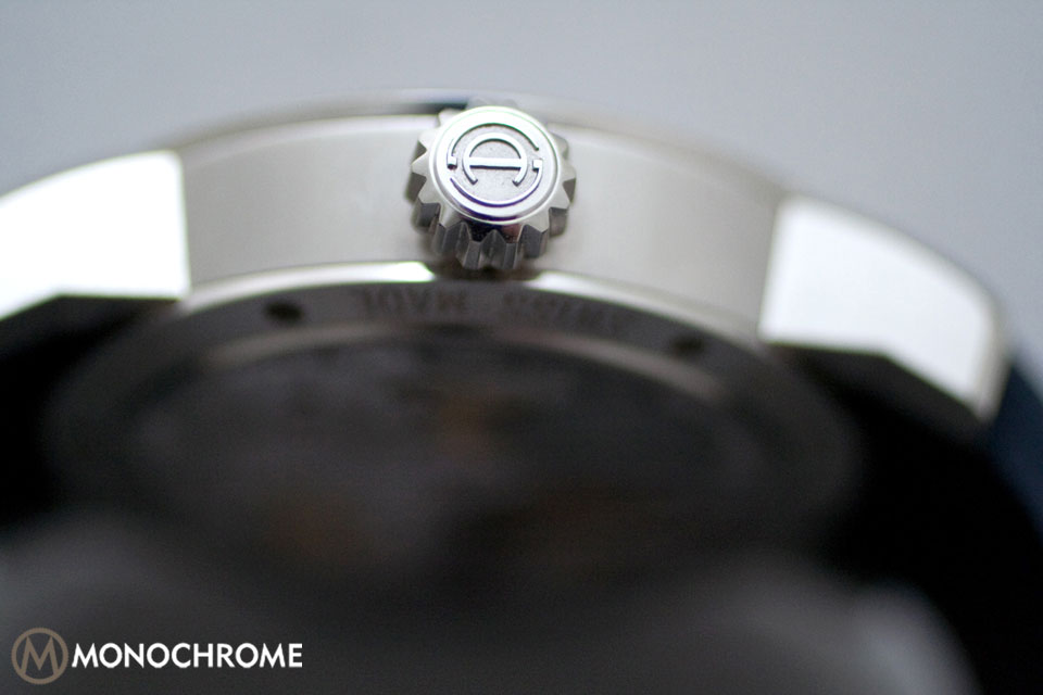 The dial is off-center. The design concept required the off-center placement, giving the watch a brand badge at 3 o’clock next to the crown. The etched logo is faintly colored white to match the chapter rings, but is unfortunately rendered nearly invisible by the shine of the steel. A dark navy blue or black might work better.