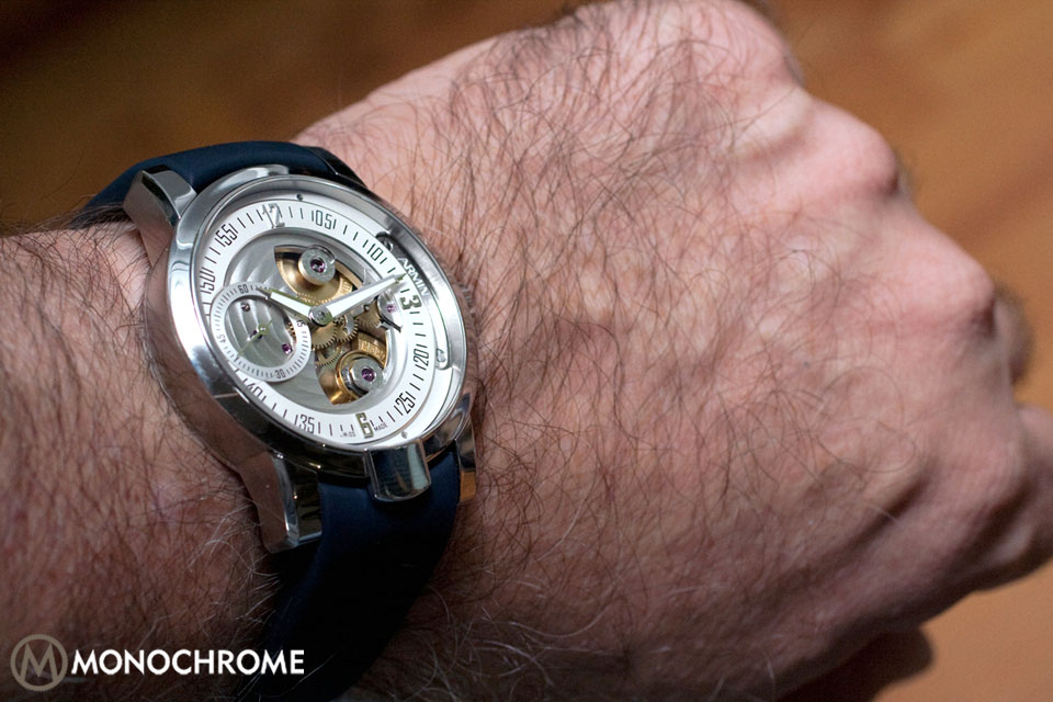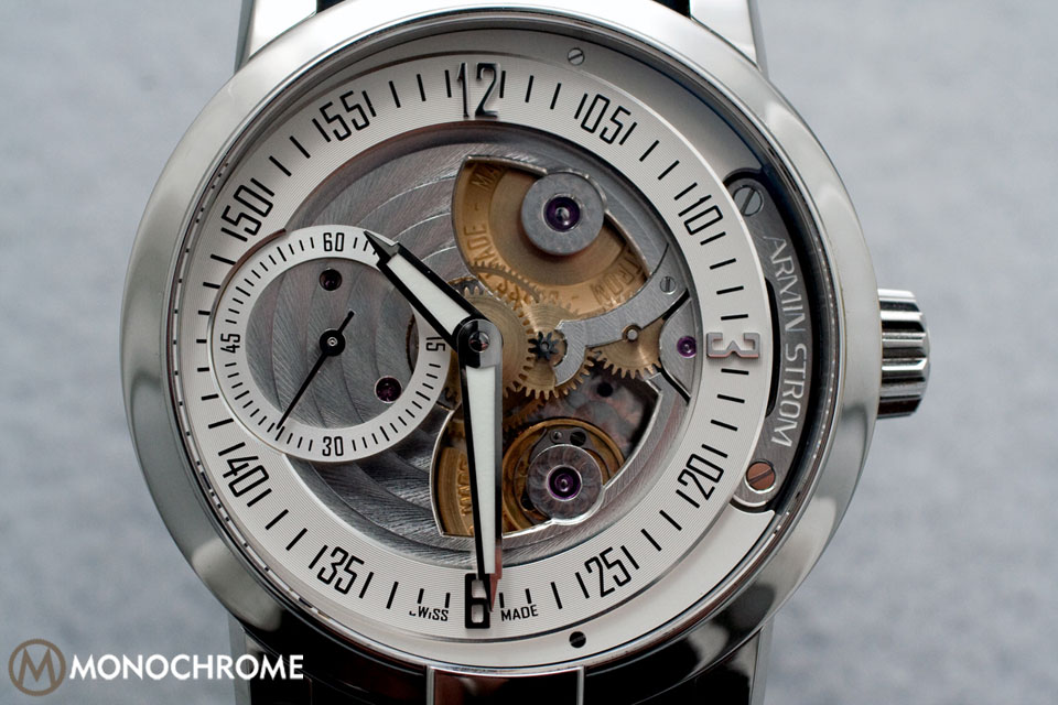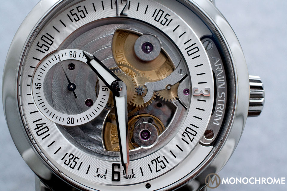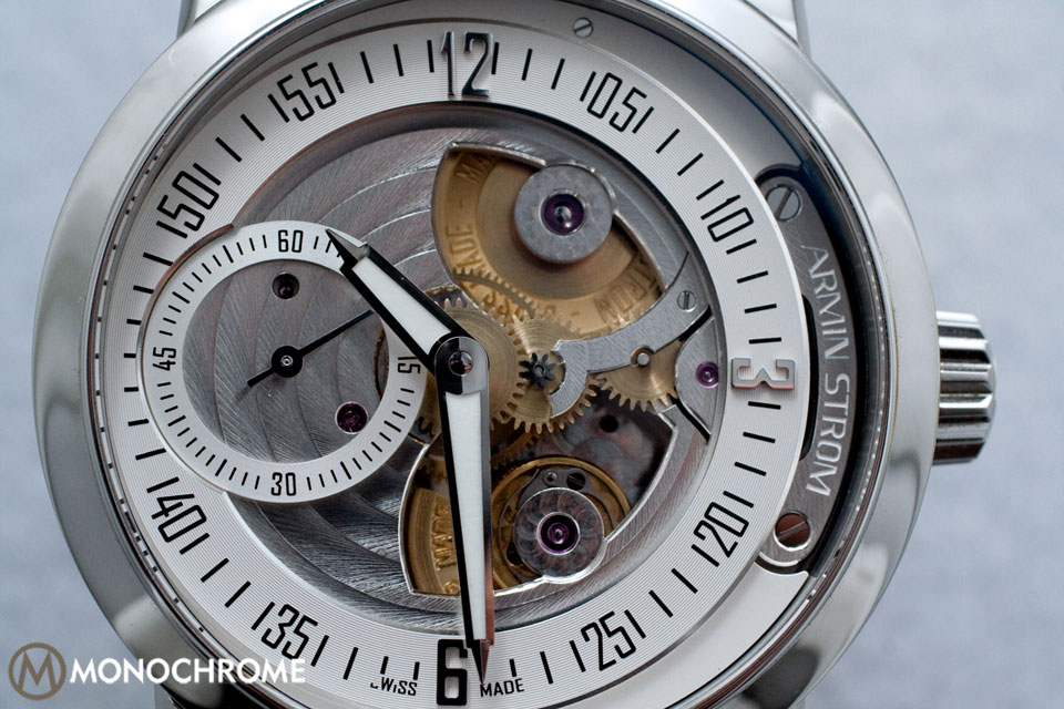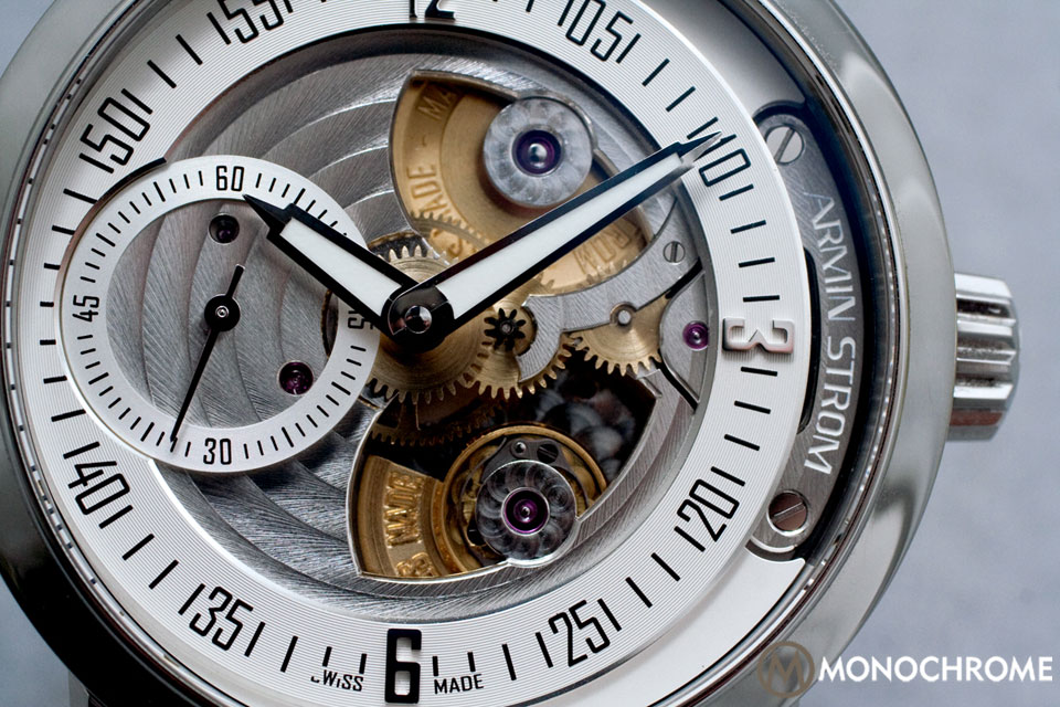 Finishing is an Armin Strom specialty, and there are no exceptions here. Mirror polish is an understatement of this watch’s dazzle, and since the hands and chapter ring display time in a contrasting white and black, there is no obfuscation; regardless of how brightly the watch shines, light never detracts from reading the time. On the front, the steel has some beautiful circular stripes, which continue through the small seconds sub-dial, and perlage around the jewels and lower bridges. On the back, hand-etched watch drops run along the bridge. This watch features craft, be it engineering or art, or both.