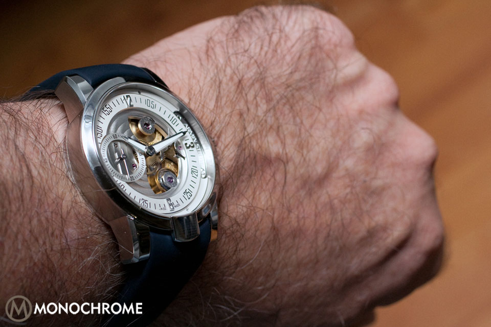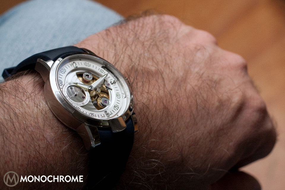 Our watch came with a blue rubber strap attached to the lugs (curved above, angled below), which are part of the case. Considering there is only 50m of water resistance, the rubber strap felt more like wishful thinking. We like the optional blue alligator horn-back strap better because the Gravity Water is more Haute Horology than it is a sport or dive watch, and confusion on this matter could result in heartache. Of note, the theme is that of water, but the strap is the only place blue appears; still, the silver does recall the shimmering effect of light on the water’s surface. Our rubber strap had the double-fold clasp.