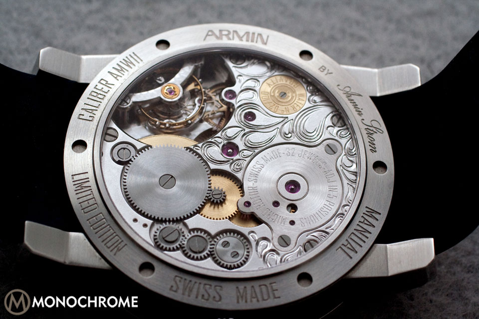 The movement Calibre AMR13, visible from the front skeleton dial and rear transparent caseback, is the prominent feature of the watch. Looking through the sapphire crystal on the front shows many different levels of wheels and bridges, creating a pronounced 3-D effect. The back offers a more artistic rendering, but also allows a revealing view of the escapement, which is with other watches all too often only a partial view.