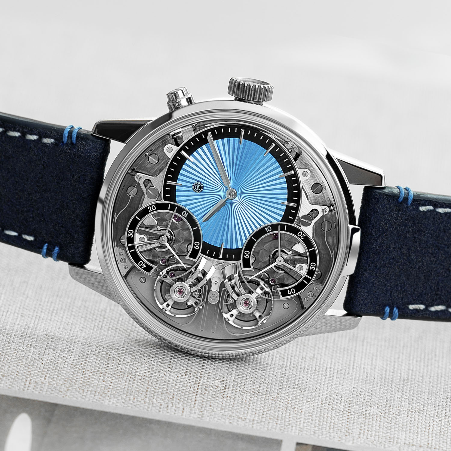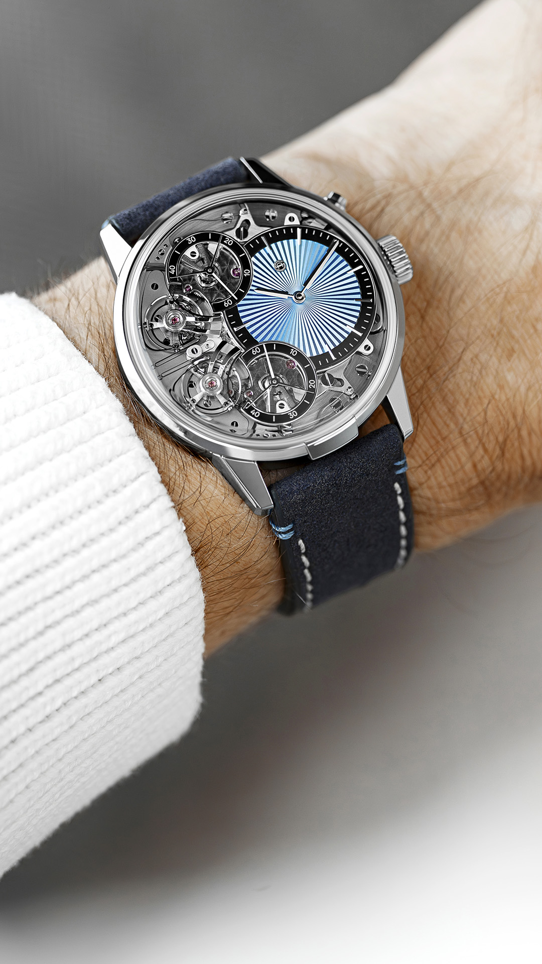 The watch is worn on a dark blue Alcantara strap with white stitching, adding a sporty, elegant touch, and is closed with a classic stainless steel pin buckle. Limited to 15 pieces, the Mirrored Force Resonance Ice Blue is priced at CHF 78,000. For more information, please consult arminstrom.com.