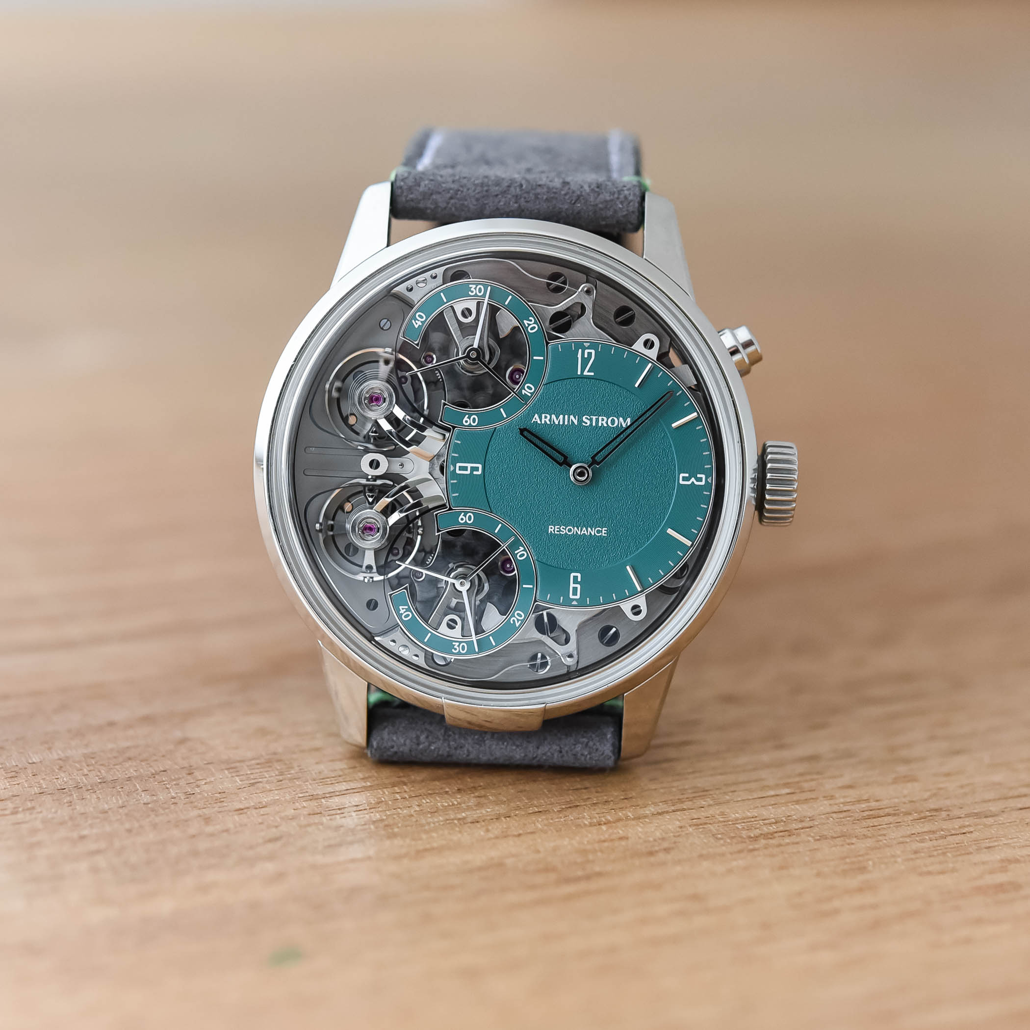 Armin Strom will produce only 50 pieces of the new Mirrored Force Resonance Manufacture Edition Green, offered on a grey Alcantara strap with white stitching and double folding clasp in stainless steel. The price for this watch is CHF 63,000 or EUR 70,000, which is by no means cheap, but compared to what it would cost you to buy a resonance watch from another watchmaker, should you find one available, this is a steal.