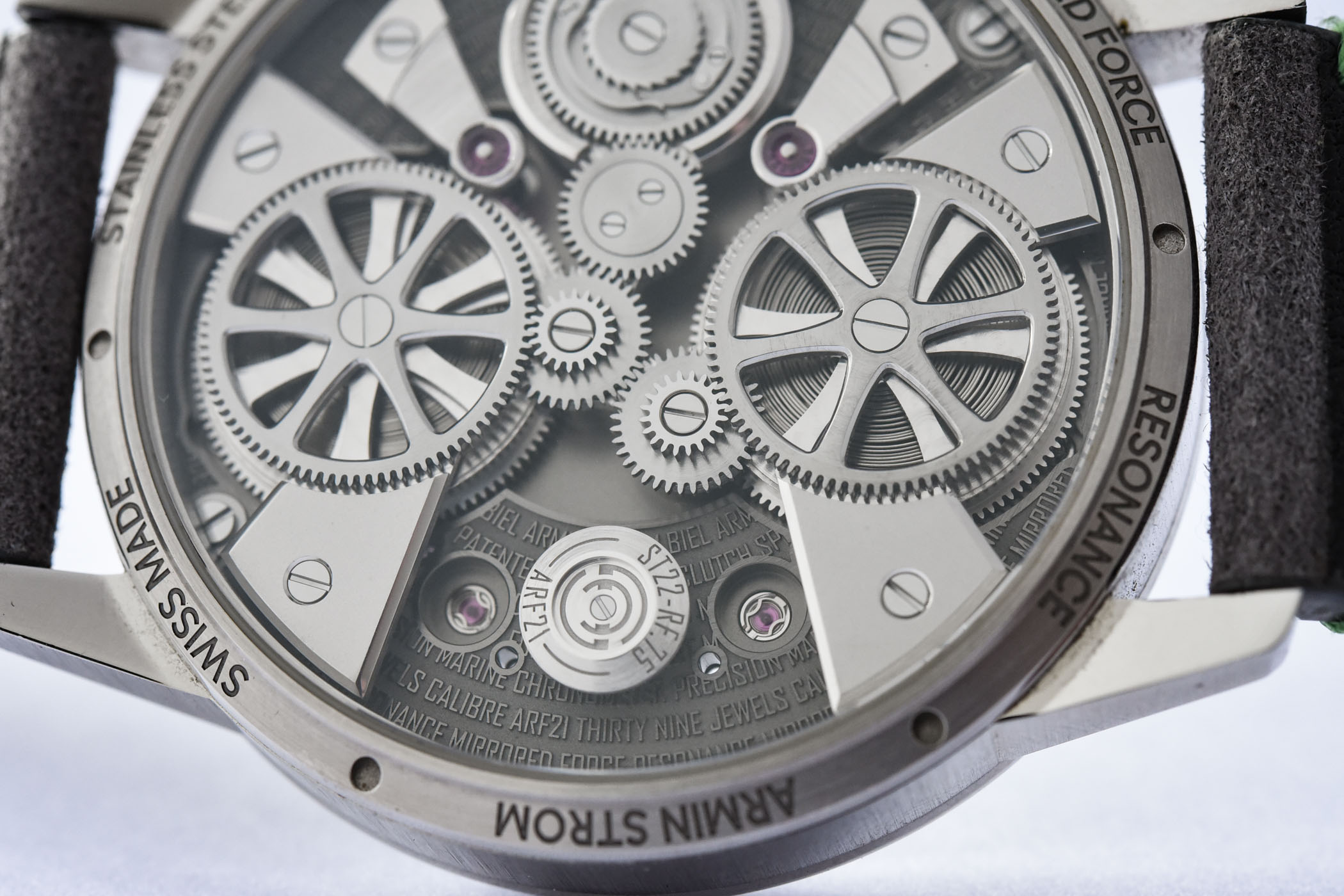 Turn the watch over, and you will enjoy the rear view of the calibre ARF21 with exposed components previously part of one main plate or concealed by bridges. There is depth, contrast and texture, enhanced by the fully engraved recessed plates with text as if to explain the watch and technology.