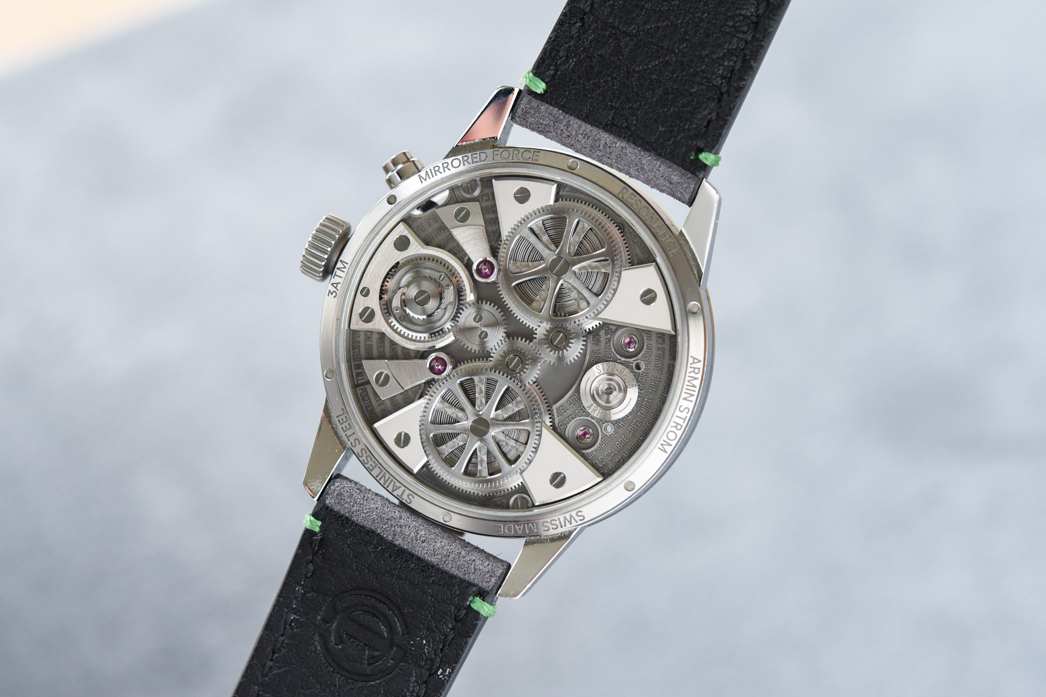The watch we are about to present today is the new variant of the upgraded 2022 Mirrored Force Resonance, first launched in 2016. It comes to market only a few months after the Armin Strom Mirrored Force Resonance Manufacture Edition Blue, with dial colour and the strap offered as the only difference between the two. Still, Armin Strom has secured a place in watchmaking history for developing an ingenious solution to exploit the great resonance phenomenon to benefit wristwatch accuracy. The new Mirrored Force Resonance Manufacture Edition Green is here to demonstrate the brand’s next generation of resonance timepieces.