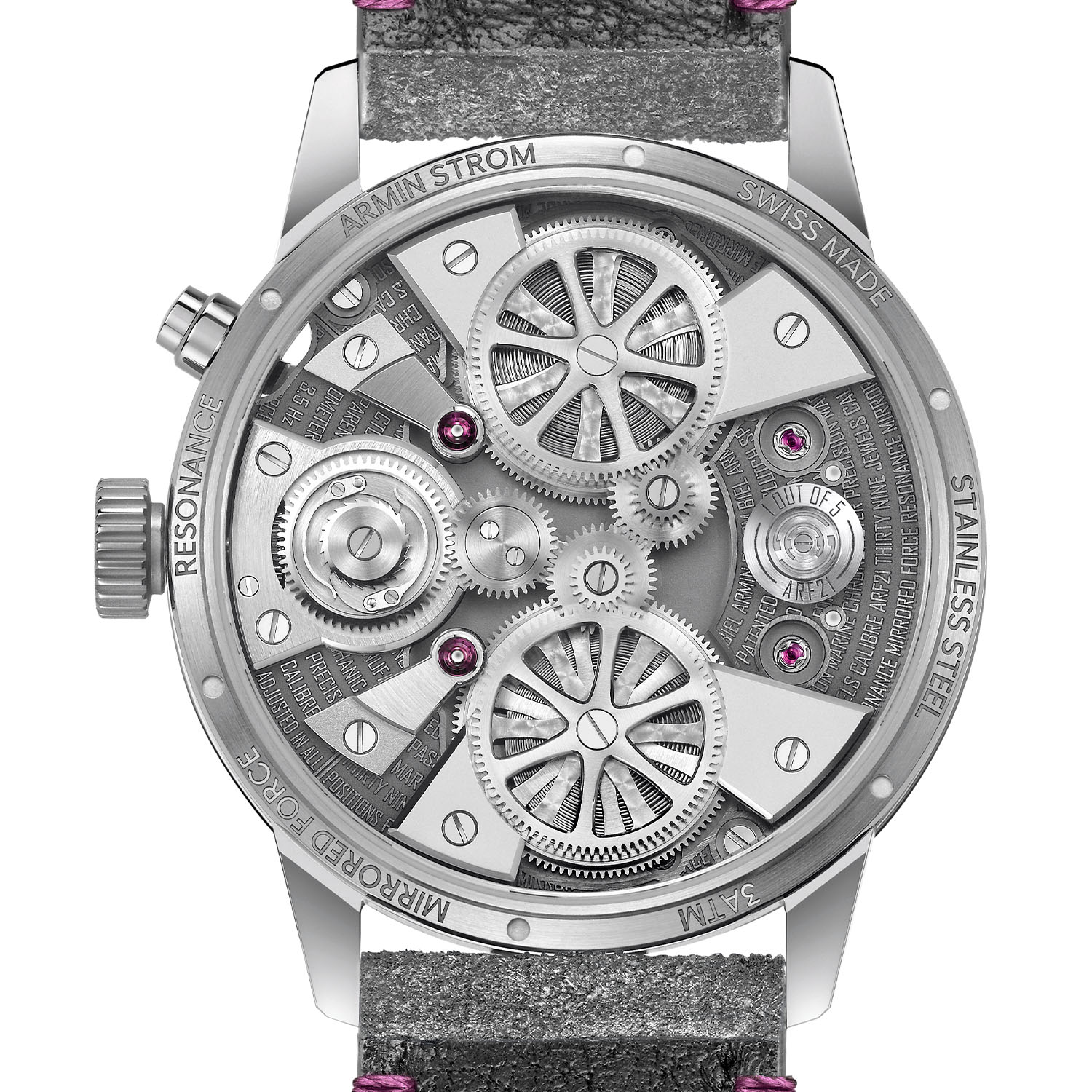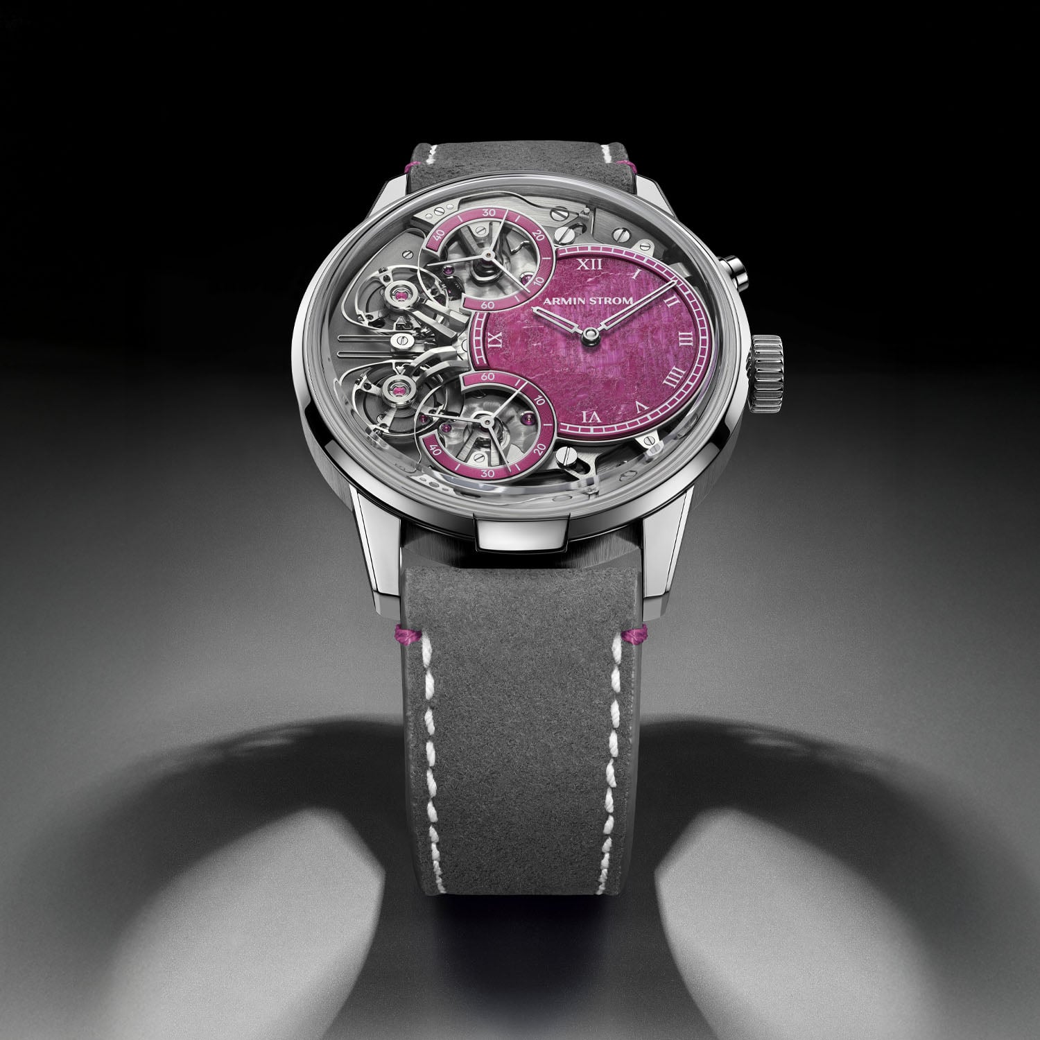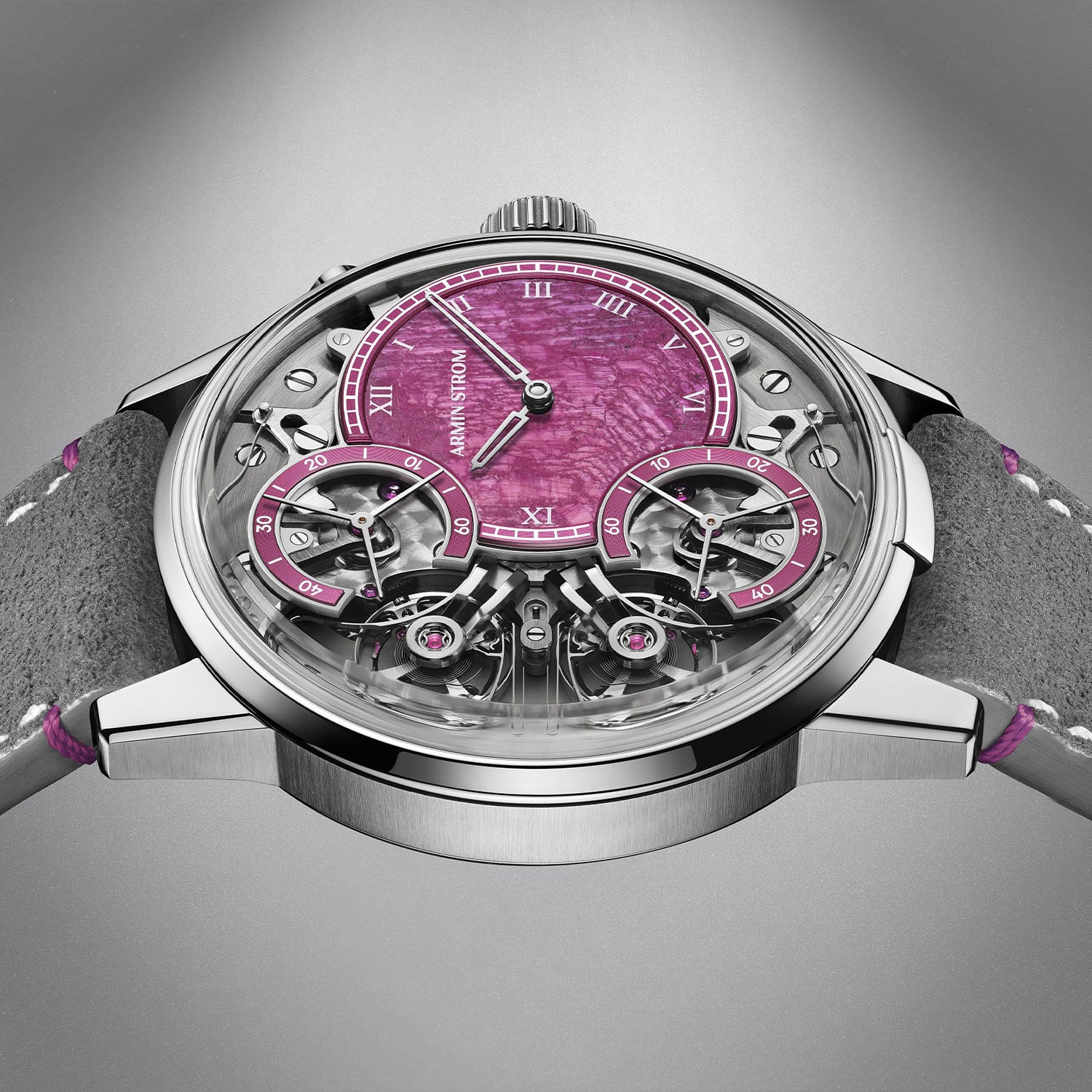 The Mirrored Force Resonance Ruby is paired with a dark grey Alcantara strap with white stitching and pink stitches below the lugs and a steel pin buckle. It is a limited edition of just five pieces and retails for CHF 85,000. More information at arminstrom.com.