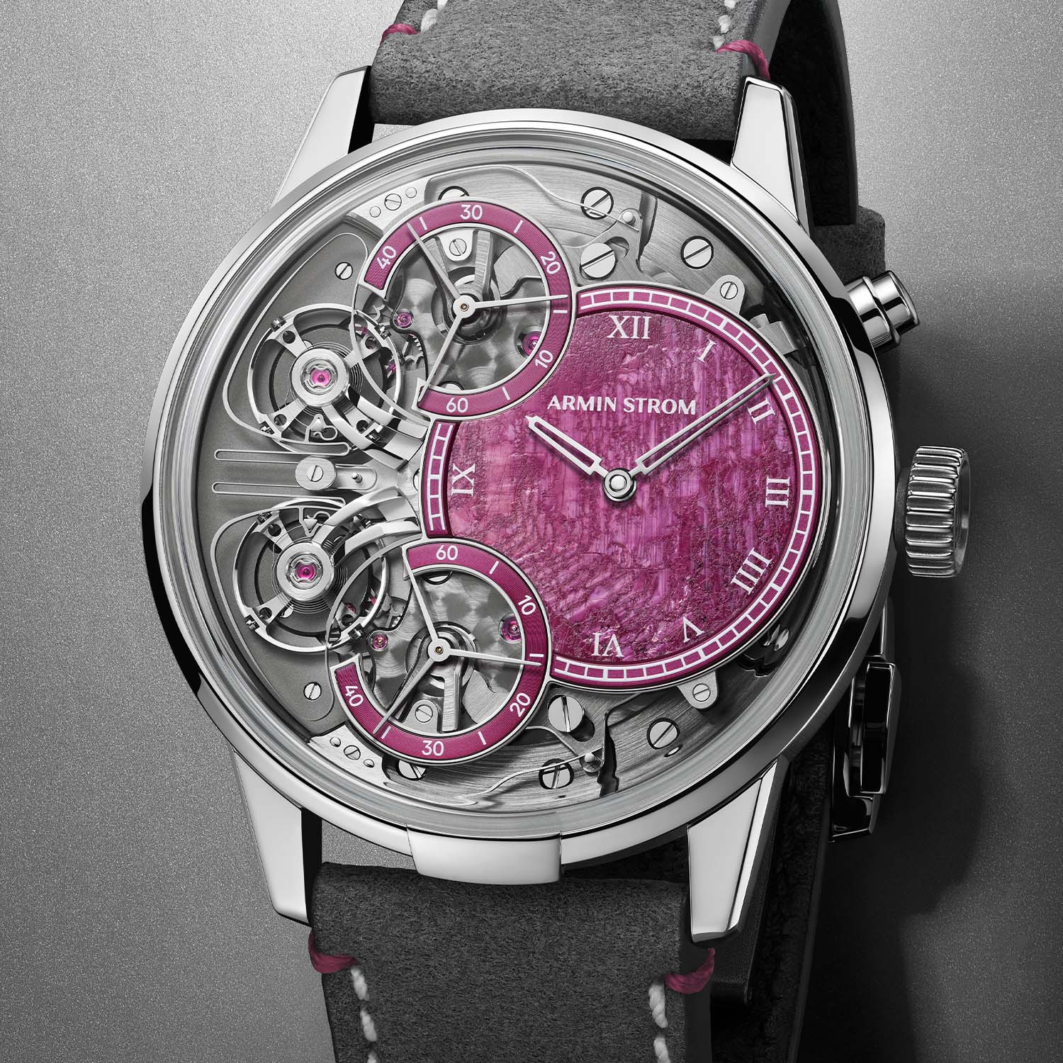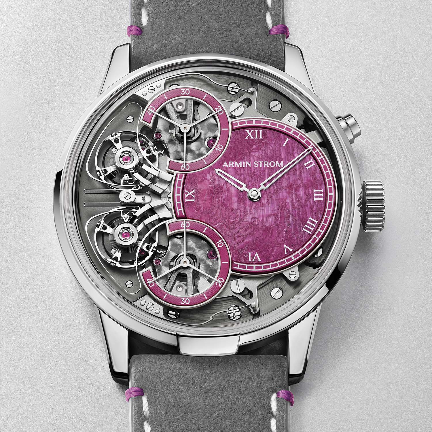 The Mirrored Force Resonance Ruby is paired with a dark grey Alcantara strap with white stitching and pink stitches below the lugs and a steel pin buckle. It is a limited edition of just five pieces and retails for CHF 85,000. More information at arminstrom.com.