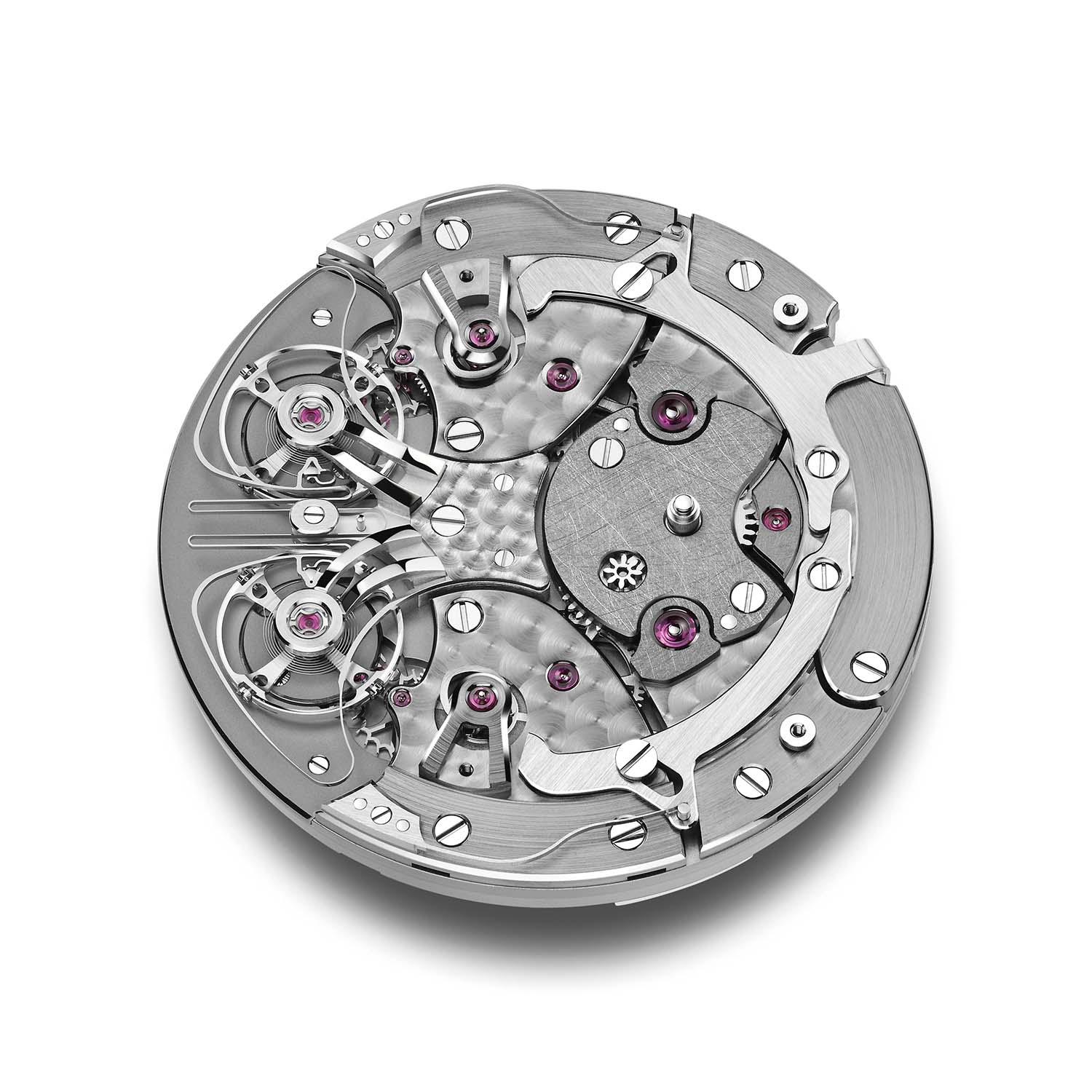 Punctuated by two synthetic rubies, the two balance springs on the left side of the dial, each with its own gear train and barrel, are linked by the patented resonance clutch spring that connects the two balance wheels like Huygens’ wooden beam. With their inlaid ruby-coloured and snailed tracks, the twin seconds indicators are linked to the regulating organ and can be reset with the pusher at 2 o’clock.