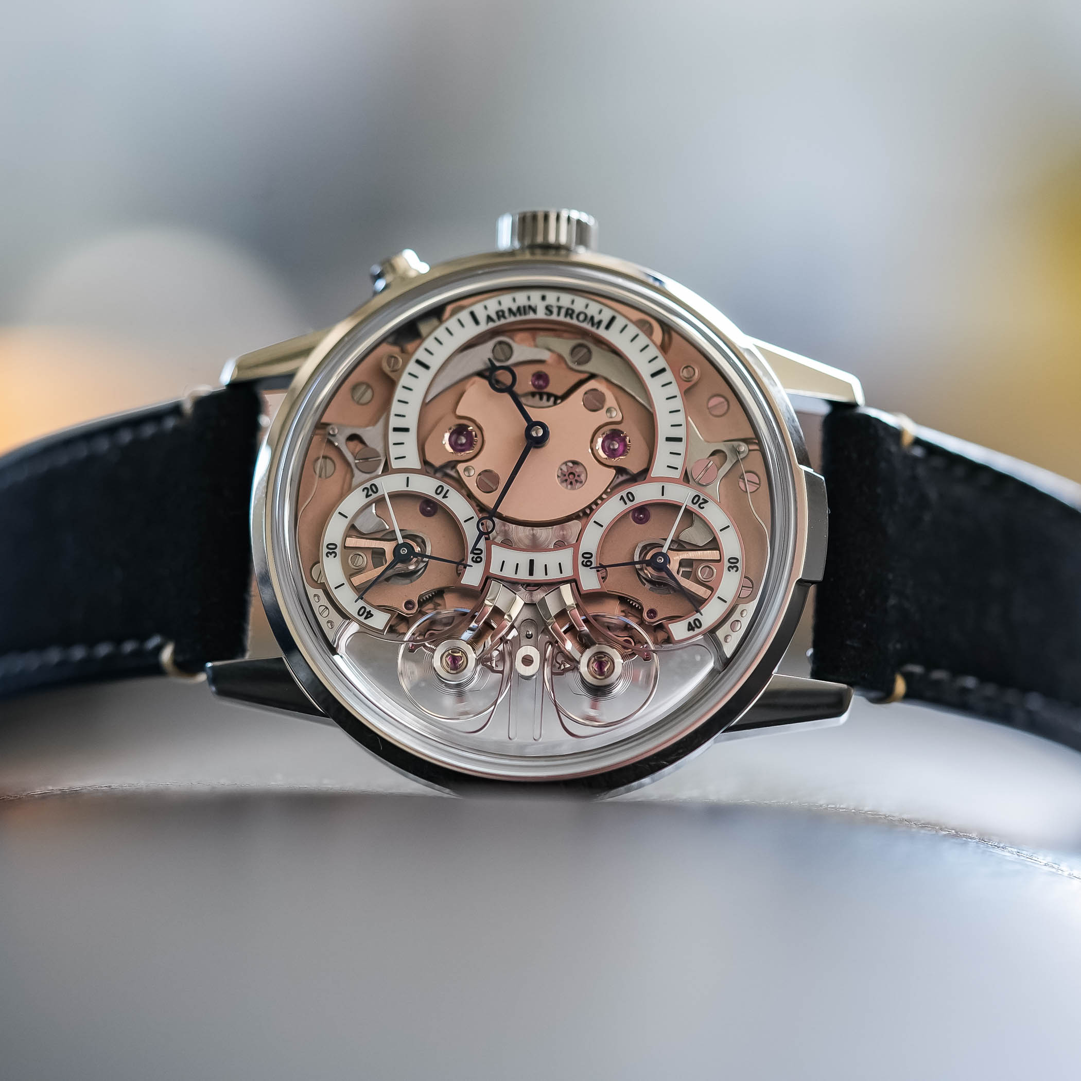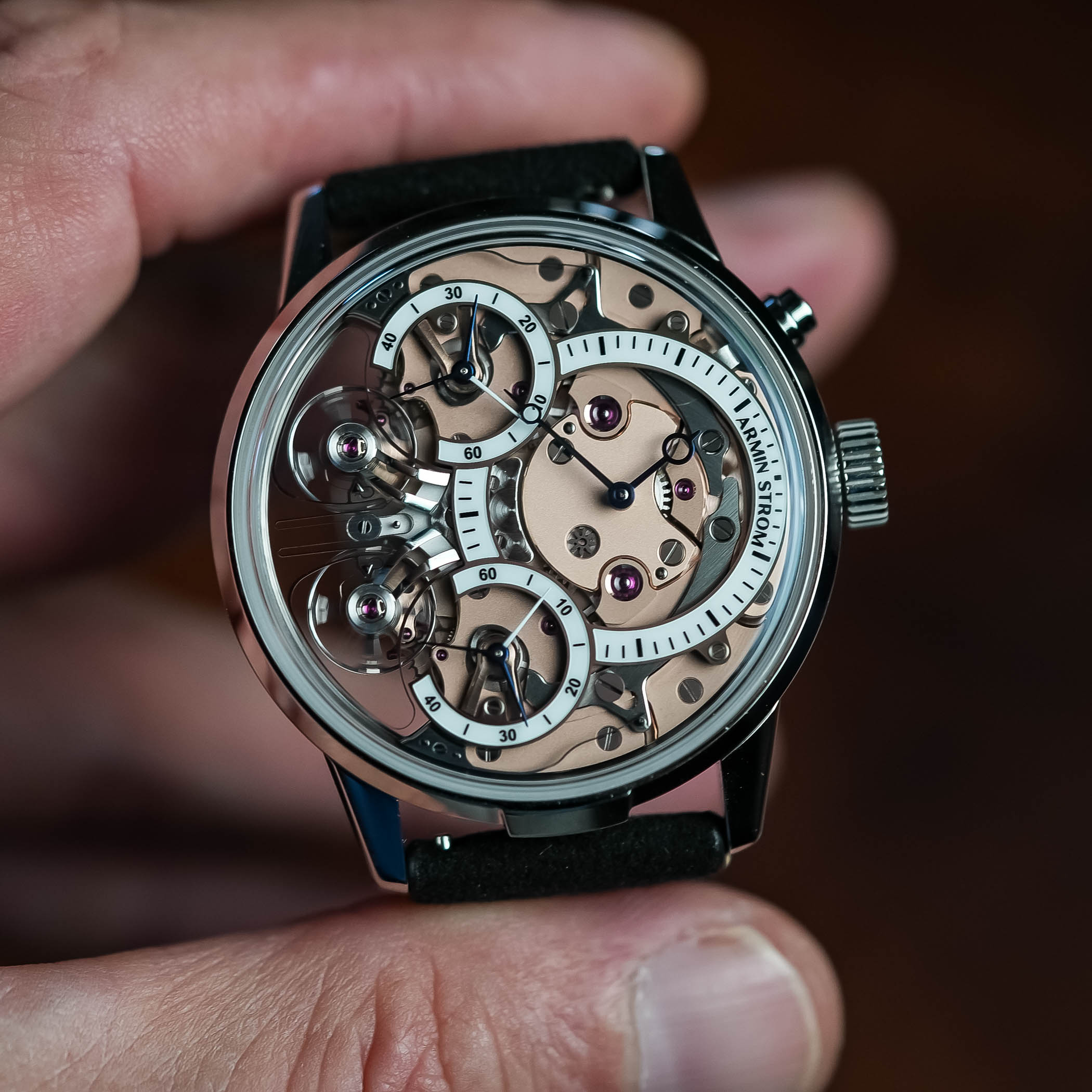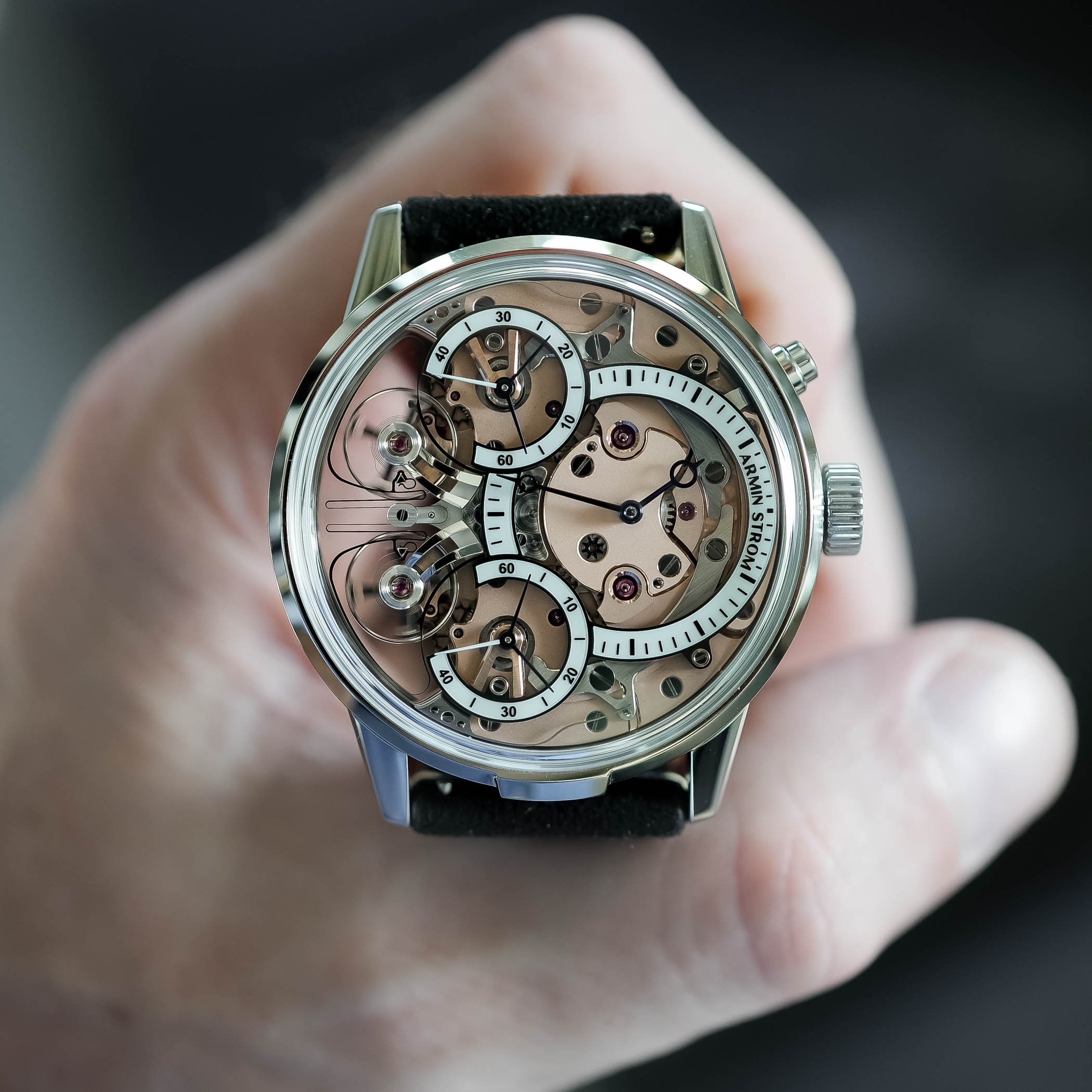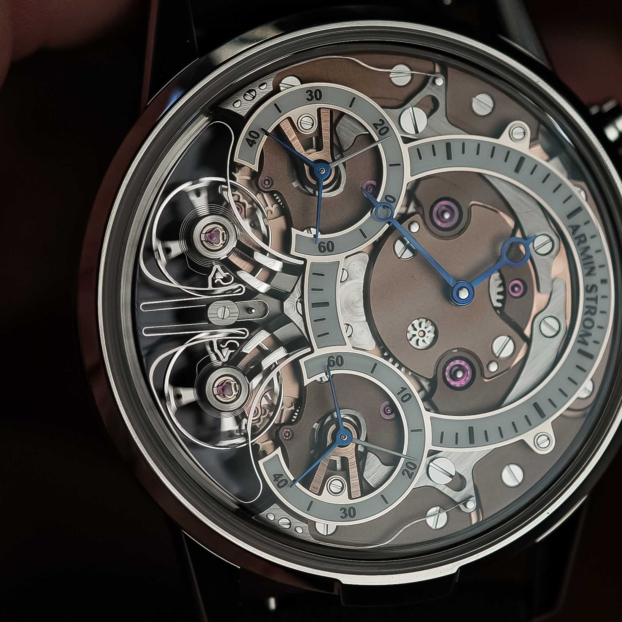 The two balance wheels are mounted on individual bridges, with the clutch spring swinging back and forth constantly. When the two run out of sync, it will show in the running seconds subdials. But a simple push of the button at 2′ will reset the two running seconds hands again. The movement itself runs at a rate of 25,200vph, which equates to 3.5Hz. Thanks to the two-barrel system, it delivers a power reserve of up to 80 hours. And, as we’ve come to expect from Armin Strom, everything is beautifully finished.