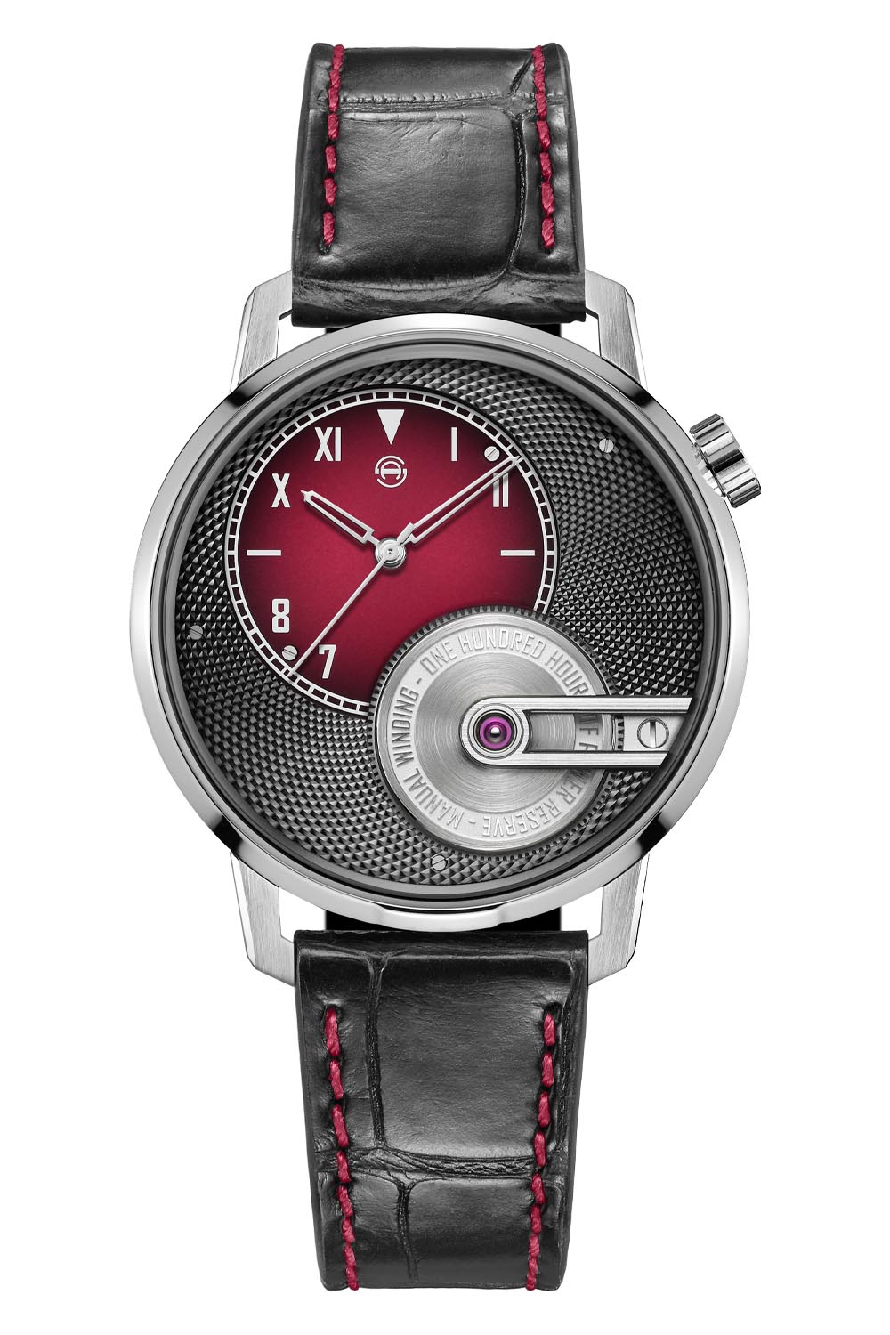 The signature off-centred hours and minutes dial is now available in five colours and limited to five pieces in each tone. The palette of the Armin Strom Tribute 1 California expands to offer dark blue, light blue, green, burgundy and grey dials with a gradient effect. Also known as fumé dials, the colour is lighter in the centre and becomes deeper and darker as it reaches the perimeter. The indices and the railroad seconds/minutes track are picked out in white, and the openworked hands are manufactured by Armin Strom in steel and finished by hand. The eye-catching black guilloché background on the dial was created by hand by Finnish watchmaker Kari Voutilainen at his Comblémine dial manufacture.