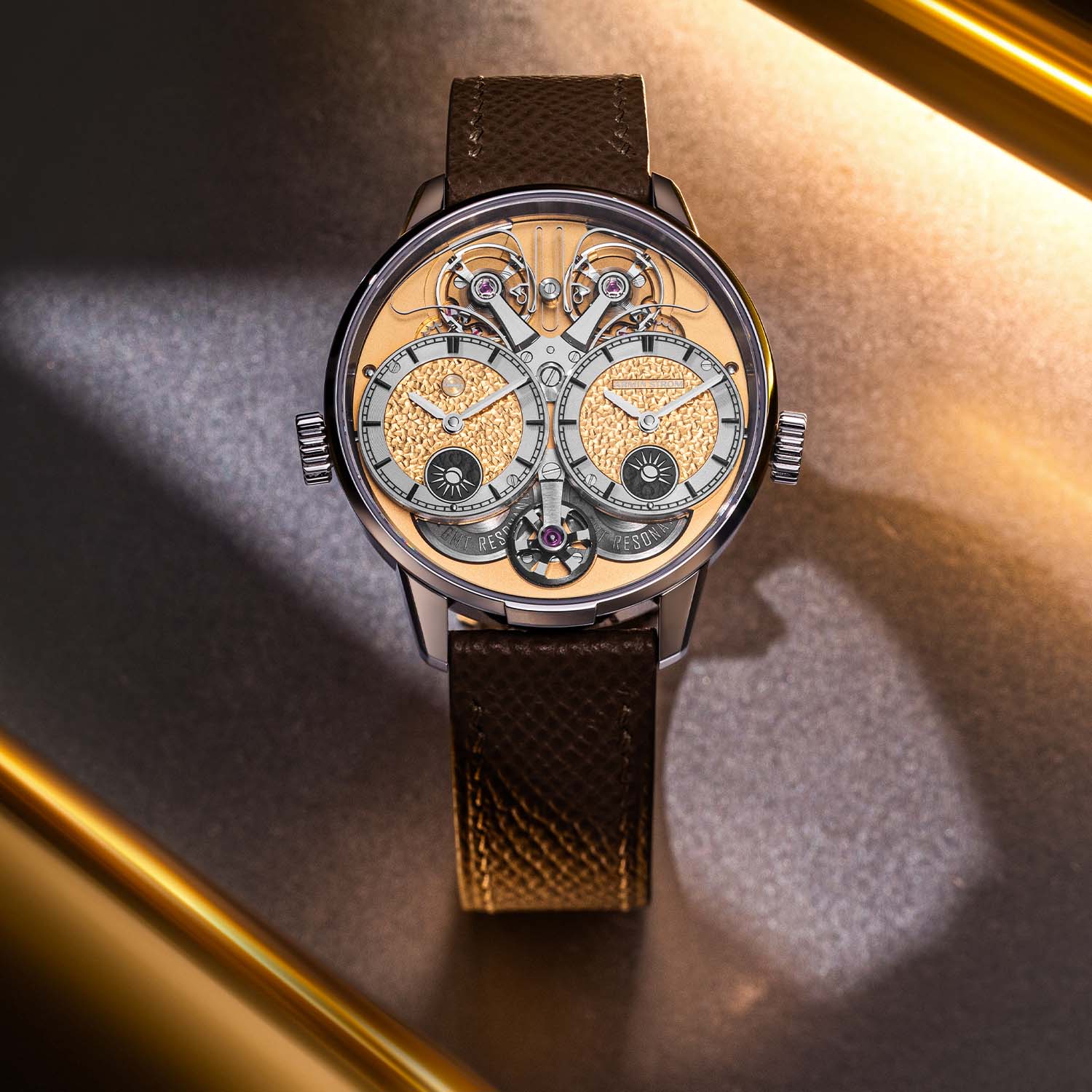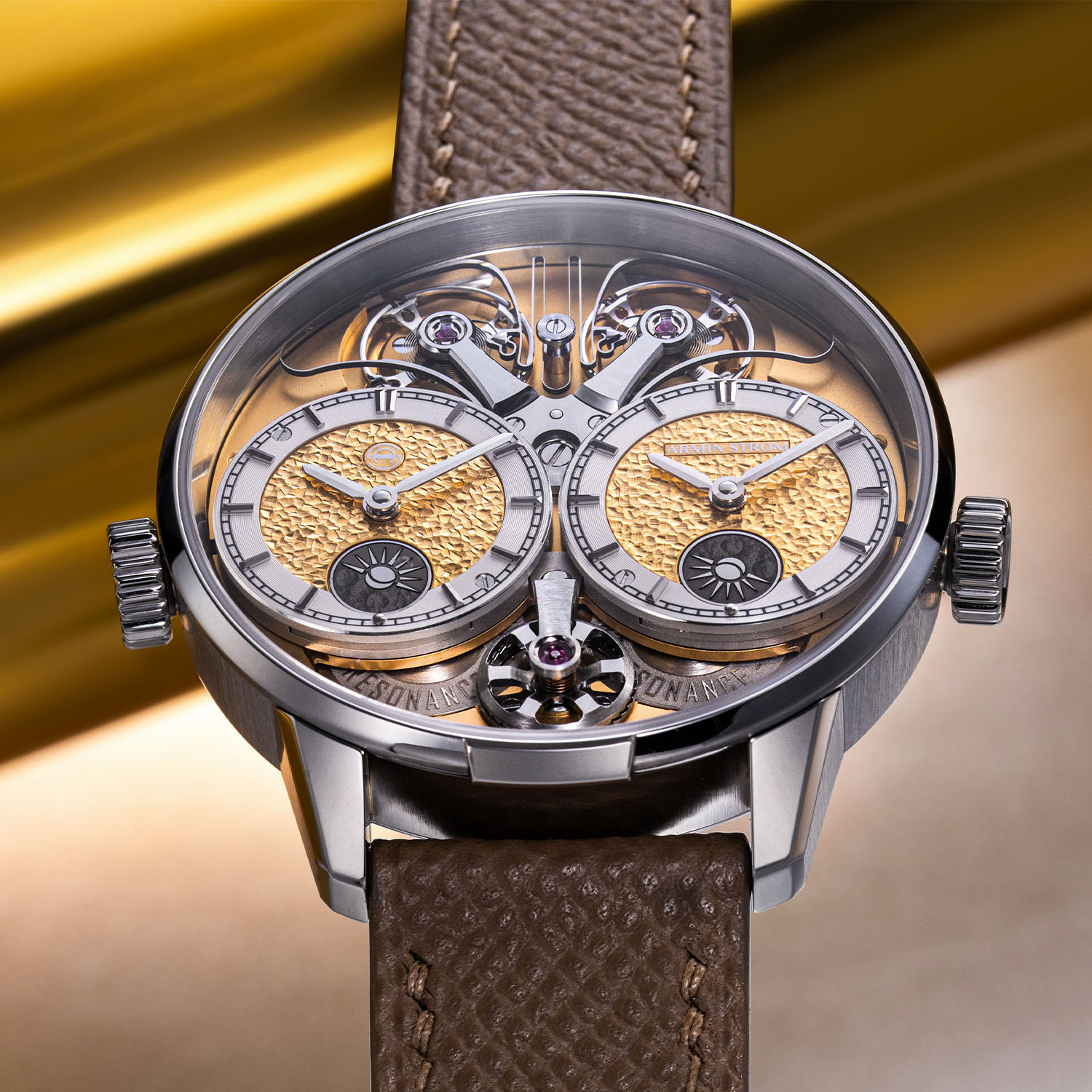 The phenomenon of resonance was discovered by Dutch scientist Christiaan Huygens in 1665 when he noticed how two independent pendulums attached to a wooden beam eventually synchronised. Armin Storm’s co-founder and master watchmaker, Claude Greisler, propelled Huygens’ concept into the 21st century with the groundbreaking Mirrored Force Resonance wristwatch of 2016. Greisler’s miniaturised version of the phenomenon, achieved by connecting twin oscillators with his patented resonance clutch spring, is considered a breakthrough in watchmaking.