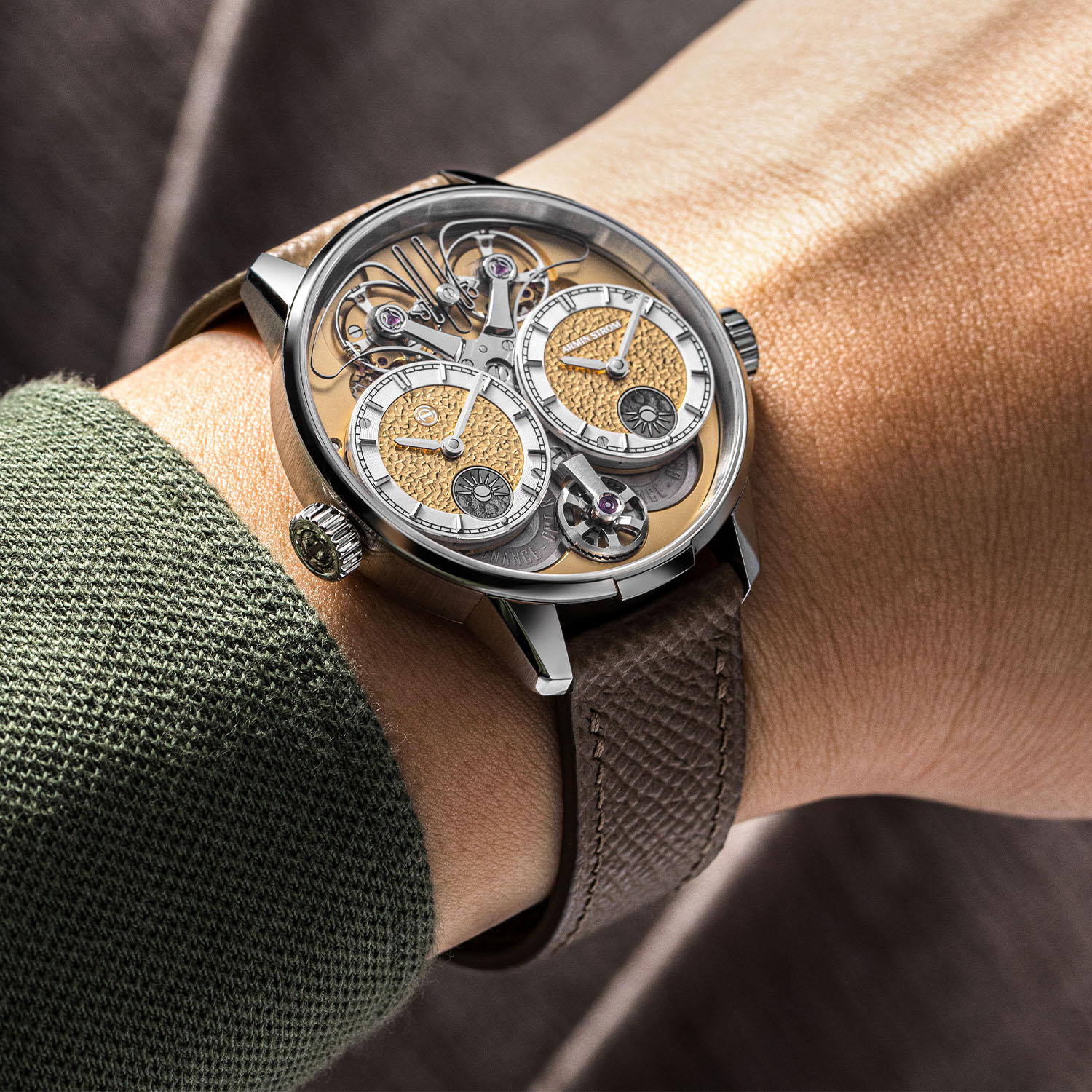 The reverse offers a view of the symmetrical and beautifully finished calibre ARF22, an in-house manual-winding movement with twin barrels and a 42-hour power reserve. While the separate crowns are used to adjust the time of the individual dials, the crown on the right is also used for winding. Two openworked black-polished steel bridges, inspired by those found inside marine chronometers, reveal the laser-engraved specifications.