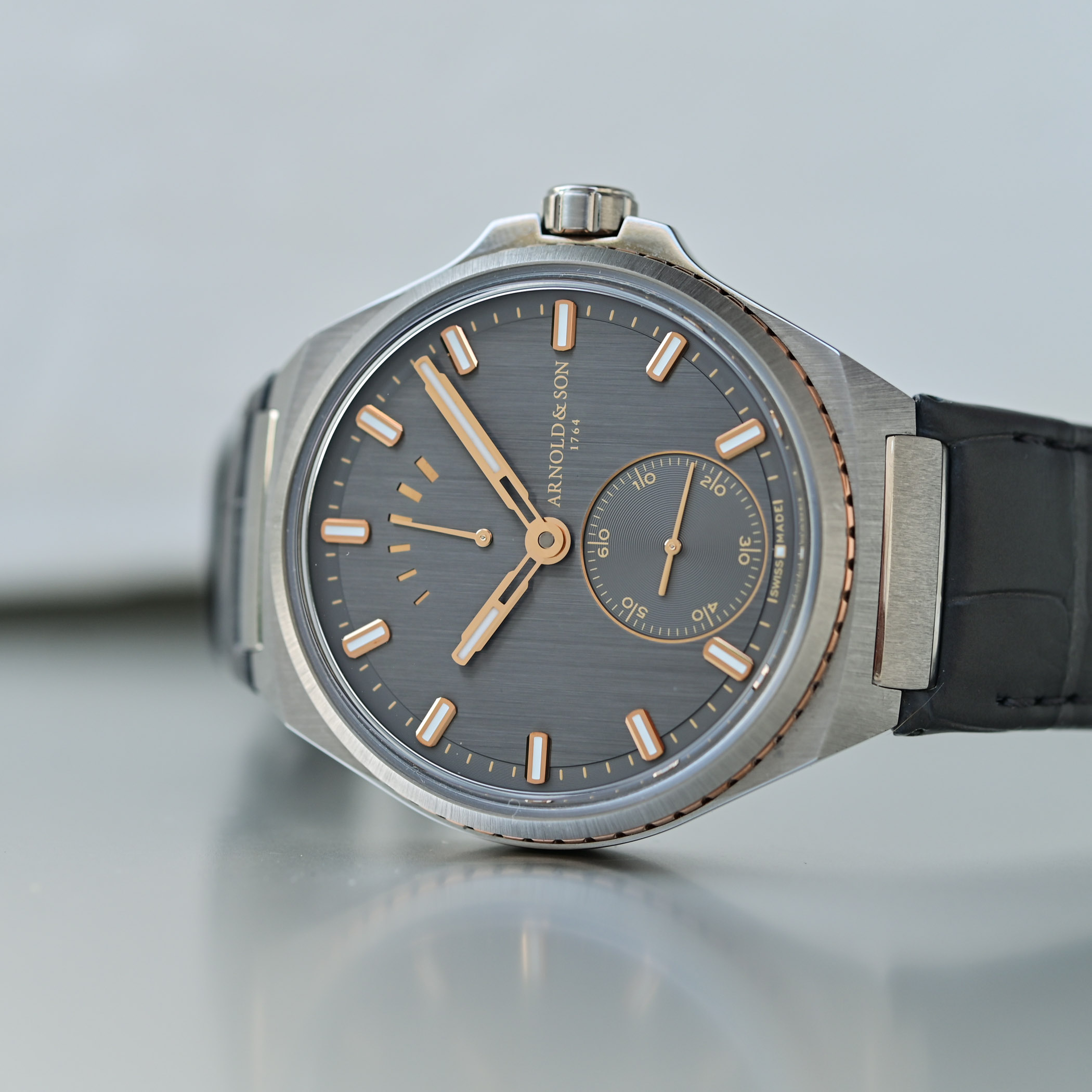 The dial has a vertically brushed satin finish in what Arnold & Son calls Lizard Point Grey, referencing the southern tip of Great Britain. A power reserve indicator sits at 12 o’clock with an arc of six cutouts that increase in size, while a recessed sub-dial at 6 o’clock has the small seconds. This vertical arrangement recalls the classic layout of early John Arnold marine chronometers. The applied golden indices and open-worked hour and minute hands have Super-LumiNova inserts, while the outer minute track shares the texture of the sub-dial’s snailed pattern.
