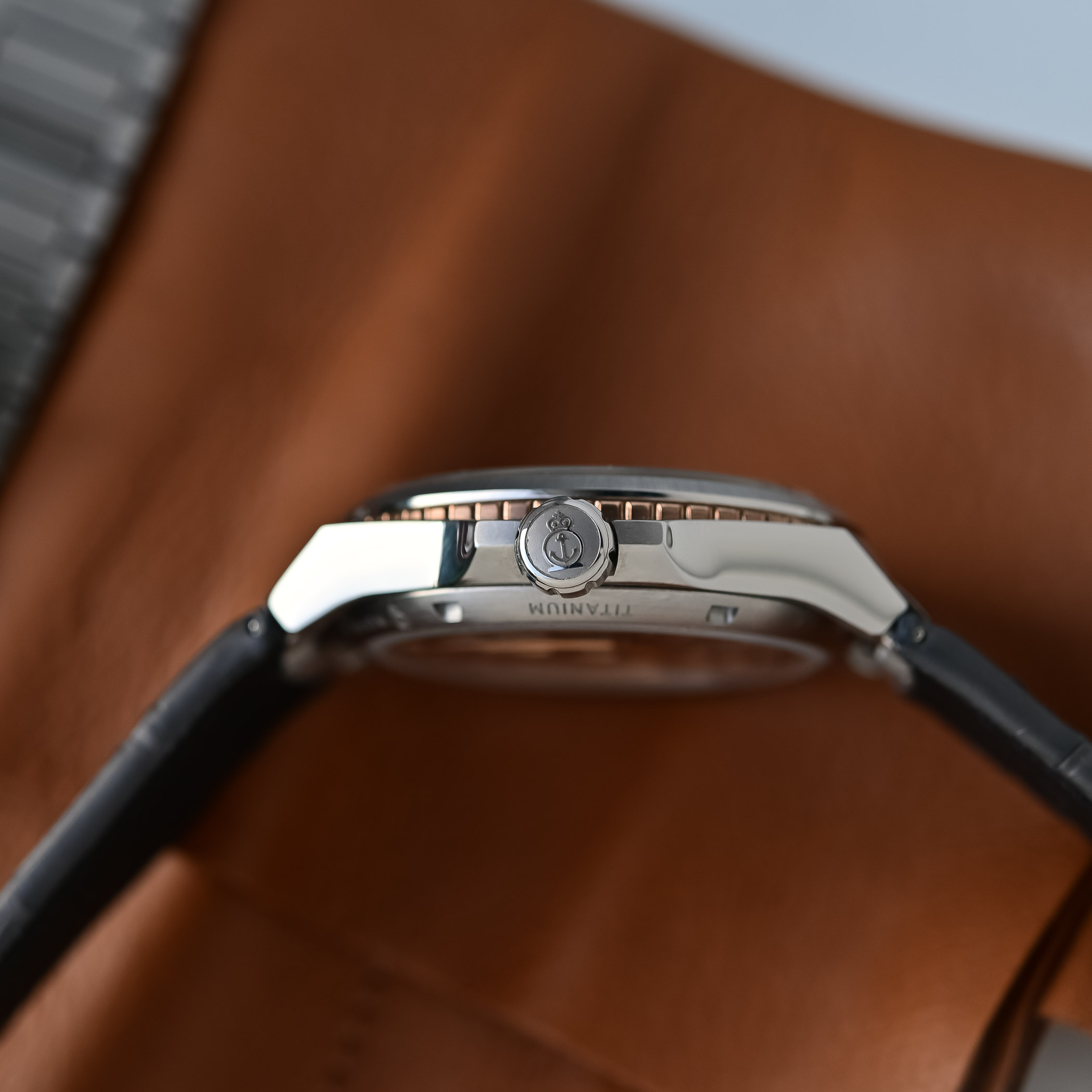 The grade 5 titanium case is unchanged from earlier Longitude Titanium models, with a large diameter of 42.5mm and a height of 12.25mm. The screw-down crown is again partially guarded and water resistance is rated at 100 metres. A standout feature this year is the 18k red gold notched ring between the bezel and case band, which was titanium before. It highlights the removable bezels of old marine chronometers and adds a bit of bling. There are AR sapphire crystals on both sides, with the slightly concave exhibition case back reminiscent of a boat’s keel. The watch comes with a slightly rounded, polished and vertically brushed integrated titanium bracelet with H links and a folding clasp, while an anthracite grey alligator leather strap with a titanium pin buckle is also included. Both have an easy interchangeability system.