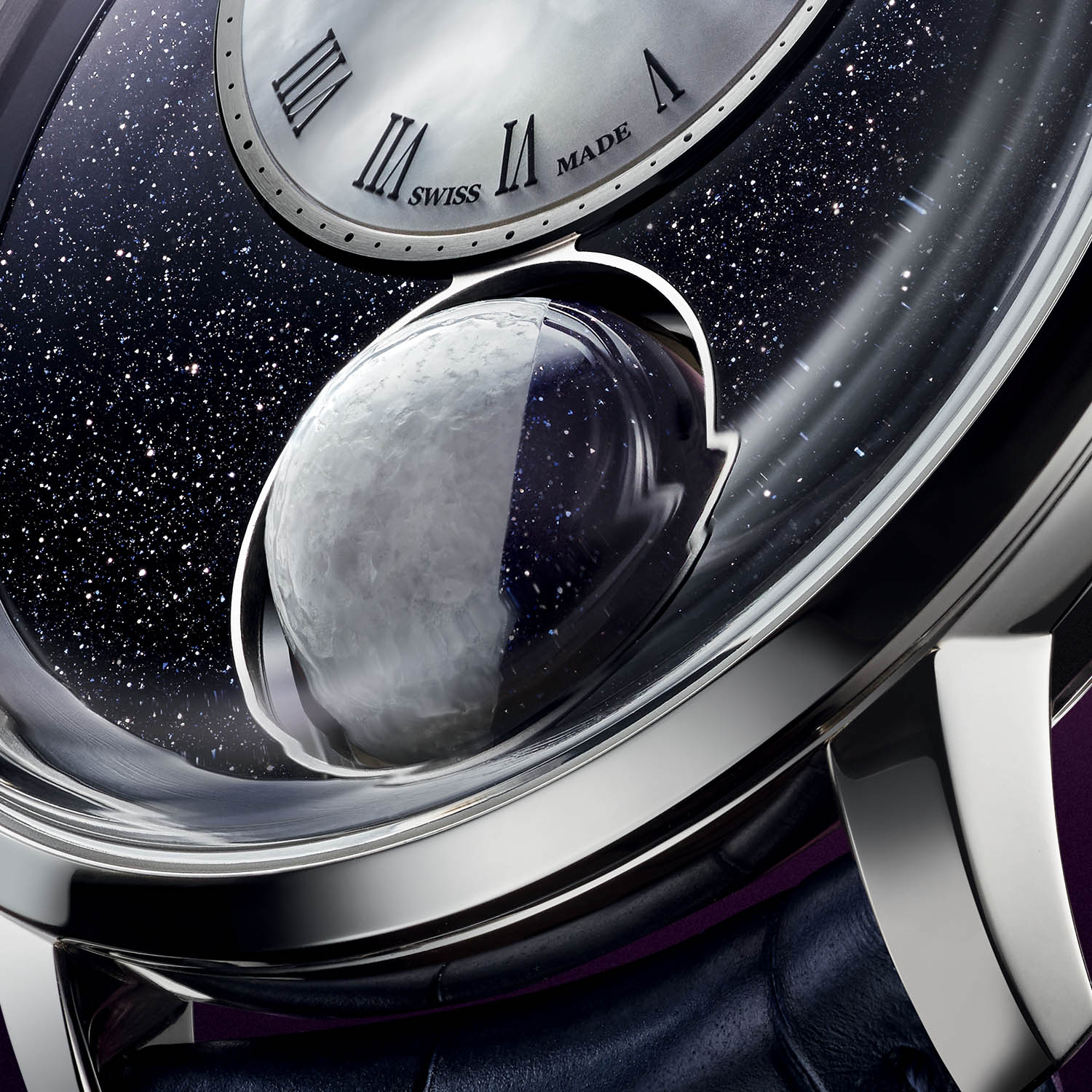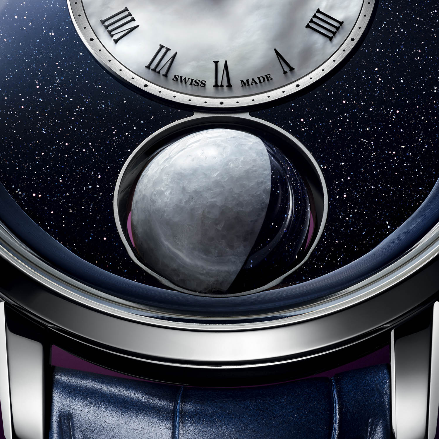 A large round aperture on the dial at 6 o’clock houses the 12mm sphere representing the Moon. Composed of blue aventurine glass and grey marble, the Luna Magna is one of the largest 3D moons ever incorporated on a wristwatch. The grey area of the Moon is realistically rendered with patches of darker grey areas to suggest craters; the aventurine half of the Moon sparkles like a beautiful night sky. The ever-changing nature of the Moon is well captured with the chiaroscuro effect produced by the contrasting blue aventurine and grey marble.