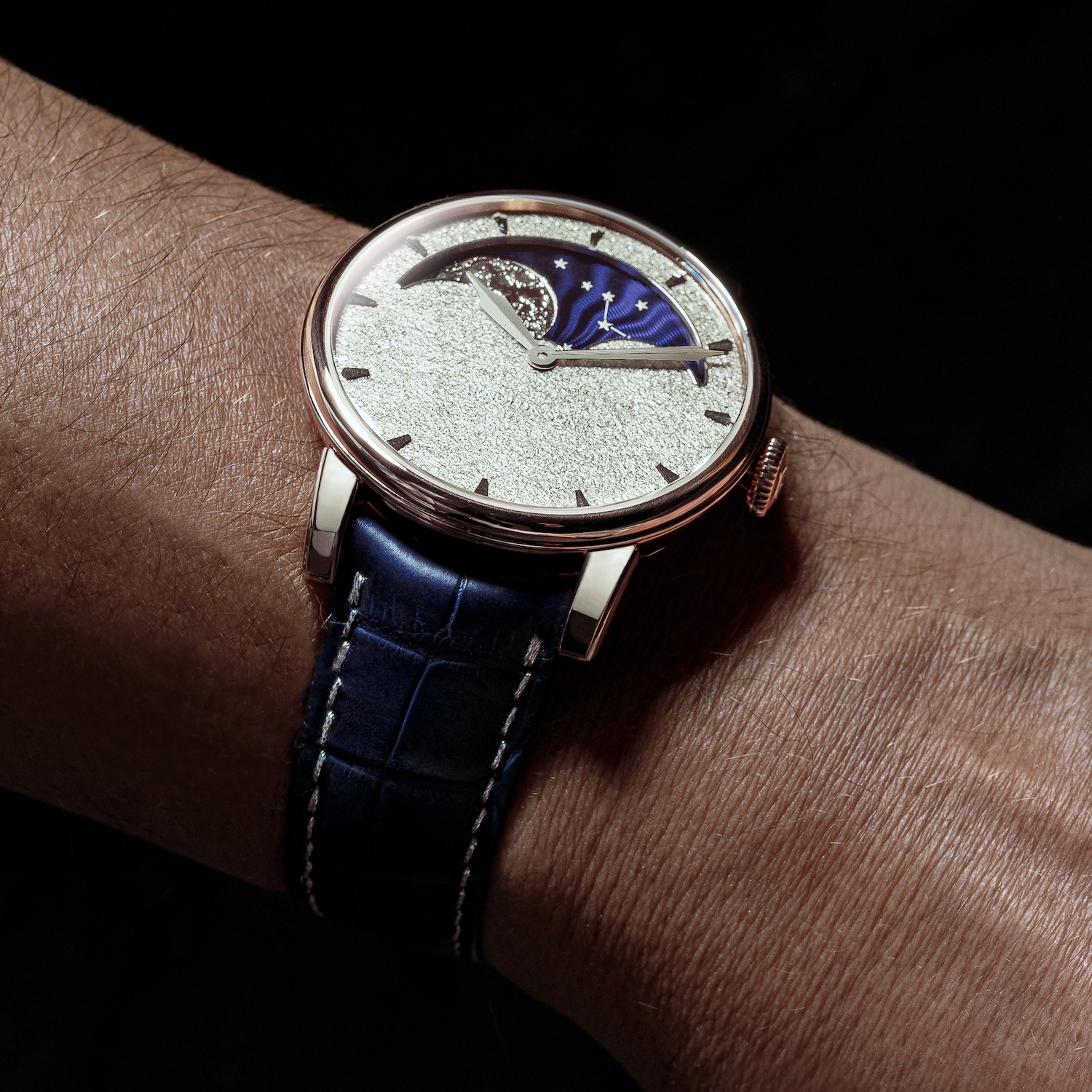 To match with the colour of the stone dial, the Arnold & Son Perpetual Moon Obsidian is housed in 18k red gold. The case measures 42mm in diameter and 11.4mm in height, with a thin bezel offering an unimpeded view on the dial and the moon indication. Its surface is mostly polished, with stepped lugs featuring a brushed plaquette on the side. For nice colour contrast, the alligator leather is dark blue with silvered stitching, and closed by a gold pin buckle.