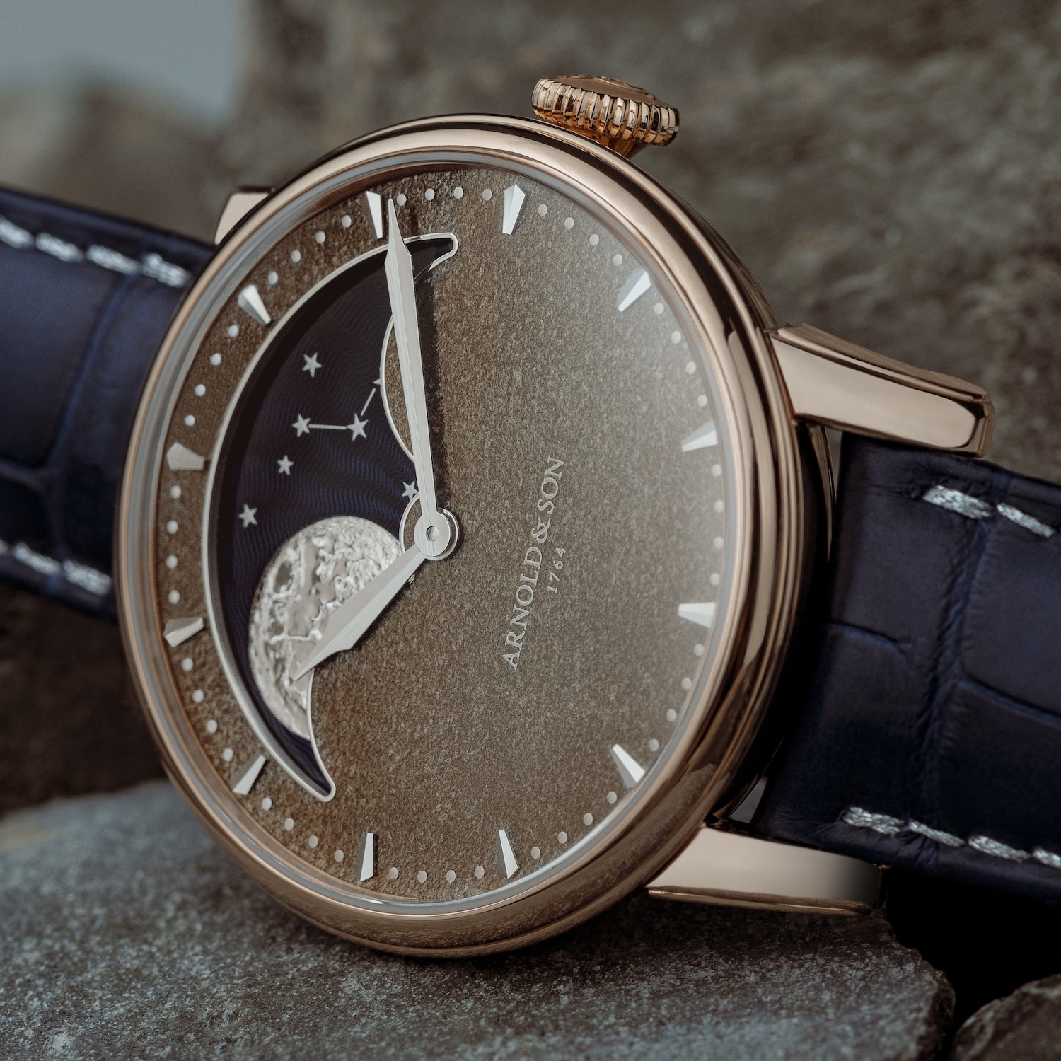 While not a new watch, the Arnold & Son Perpetual Moon remains one of the most fascinating moon-phase watches on the market, thanks to its oversized lunar indication – certainly one of the largest currently available. In addition to this prominent astronomical complication, the Perpetual Moon has often been used to display beautifully crafted dials, such as enamel of aventurine. For its 2020 collection, the brand releases its lunar watch with a material rarely seen in watchmaking, with a dial made from Mexican obsidian, resulting in a golden-bronze uneven surface. Meet the Arnold & Son Perpetual Moon Obsidian.