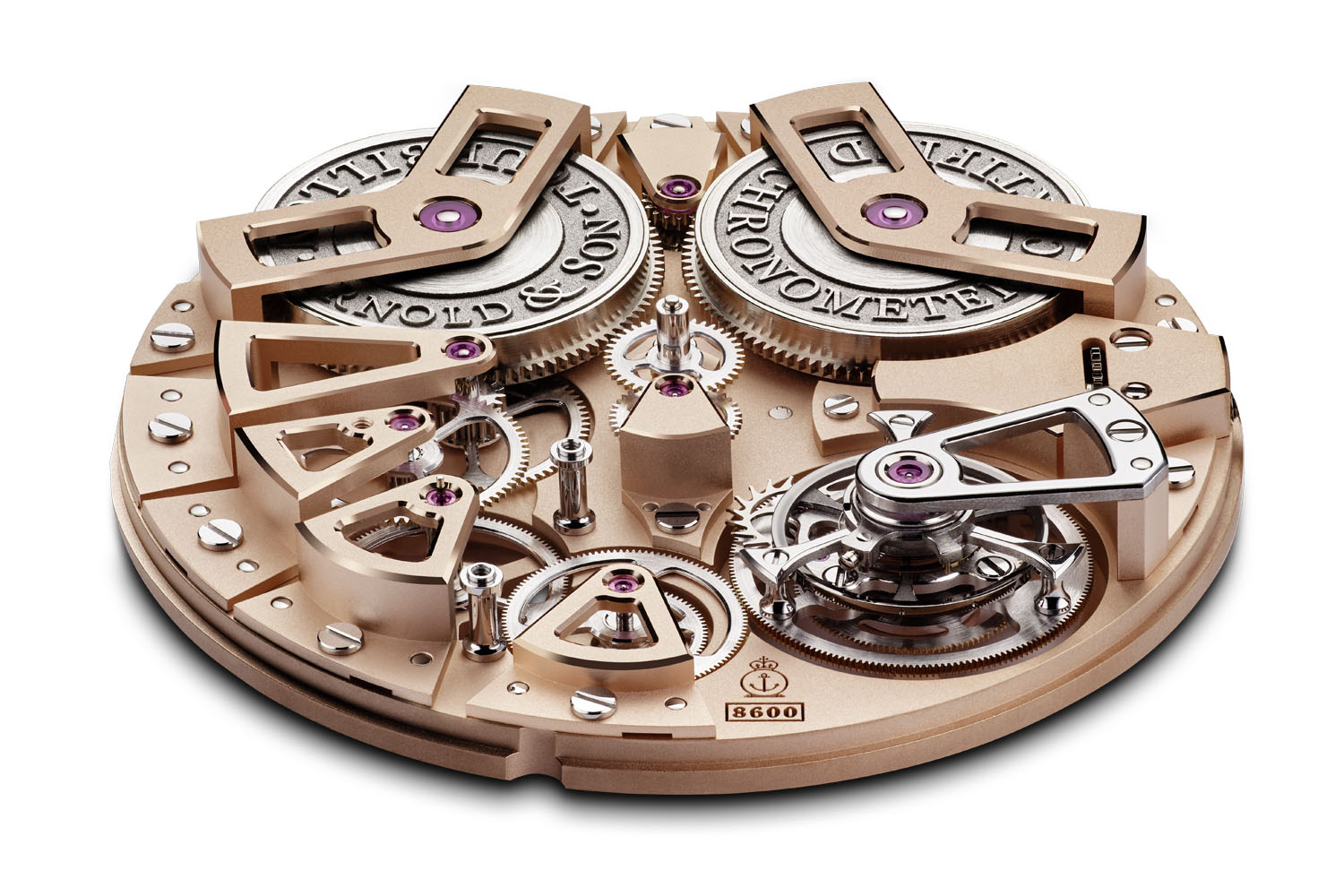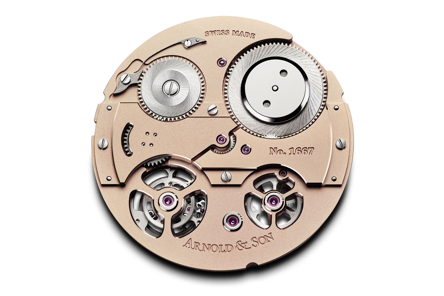 Following the classical codes of traditional English chronometer movements, the main pivoting elements such as the wheels, barrels, the tourbillon, and others are each mounted on their own bridge. The triangular, multilevel bridges (no less than thirteen) are mostly skeletonized, providing a more contemporary sense of three-dimensional depth to the entire timepiece. The movement is finished in a particular way, with smooth sand-blasted main plate and bridges, and with chamfered and polished edges. The main plate and bridges are treated with a golden coating. The movement of the Arnold & Son Tourbillon Chronometer No. 36, as all watches of the brand, is entirely developed and manufactured in-house, and exclusive to this watch.