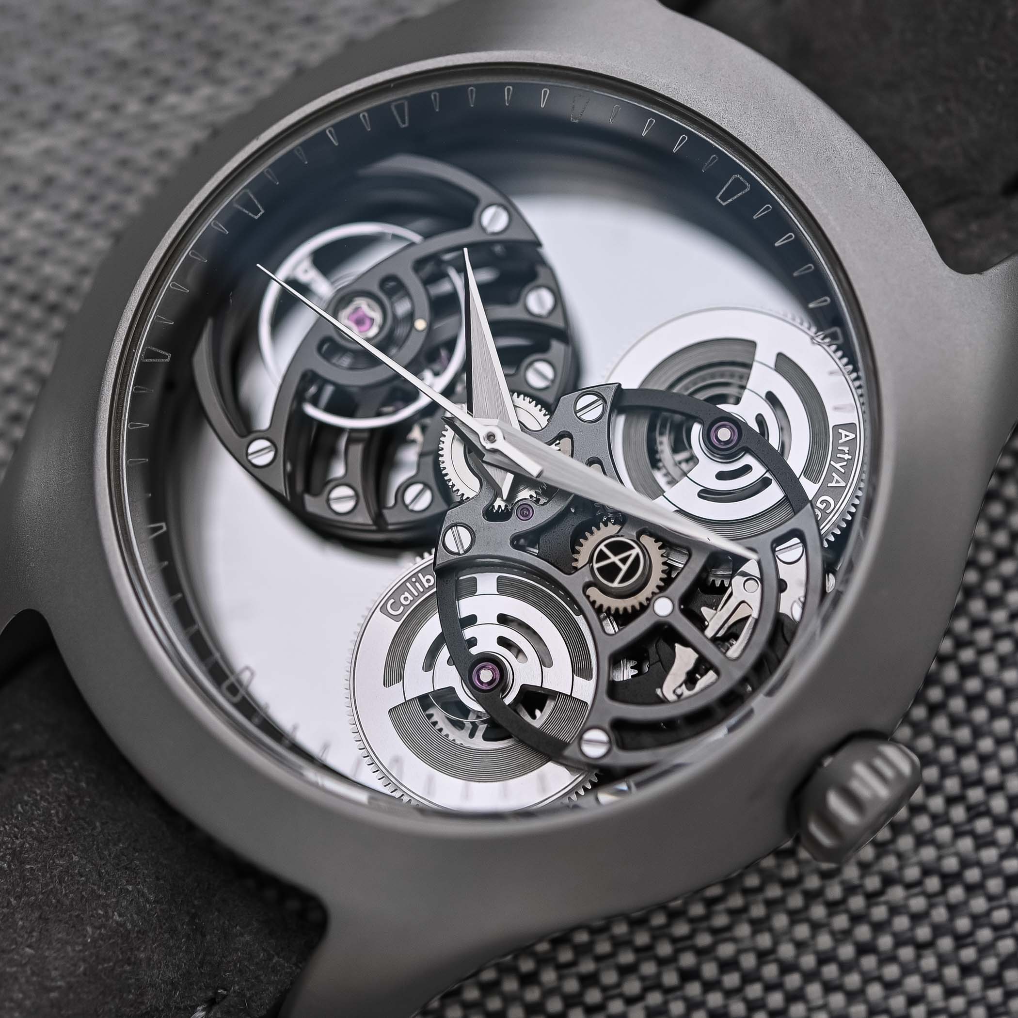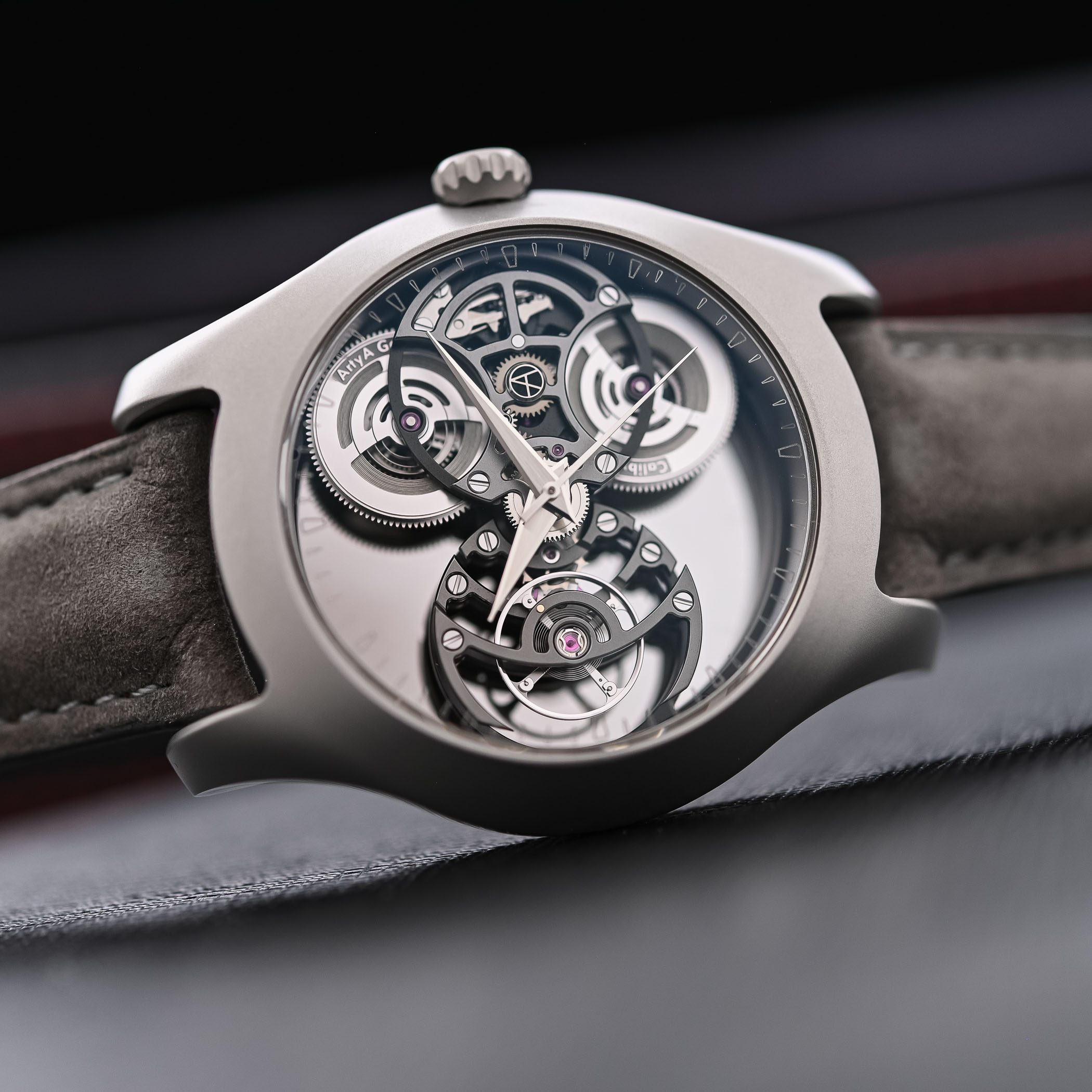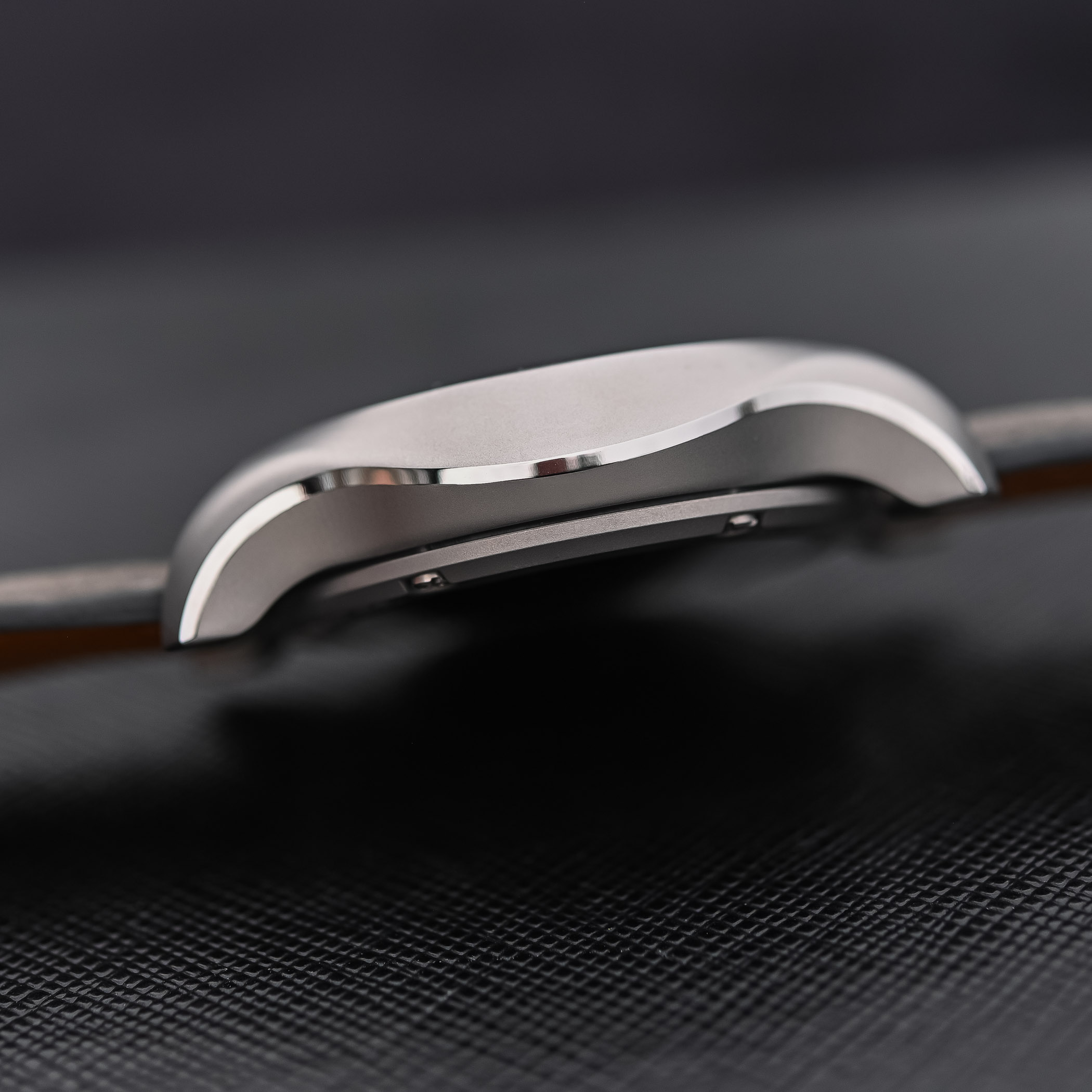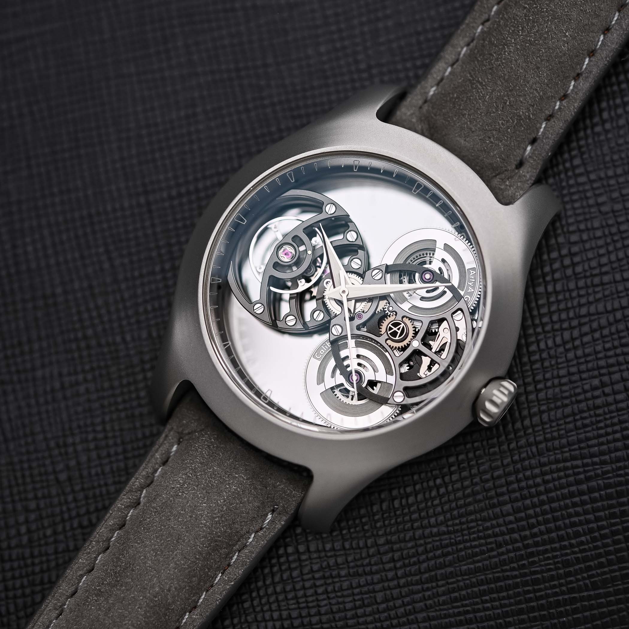 Time is read with the sword-shaped central hands, and the minutes and hours are laser-engraved on the underside of the sapphire crystal. The Purity Wavy Titanium Mirror is a limited edition of 99 pieces. It can be ordered with an alligator or nubuck leather strap and comes with an ArtyA pin buckle.