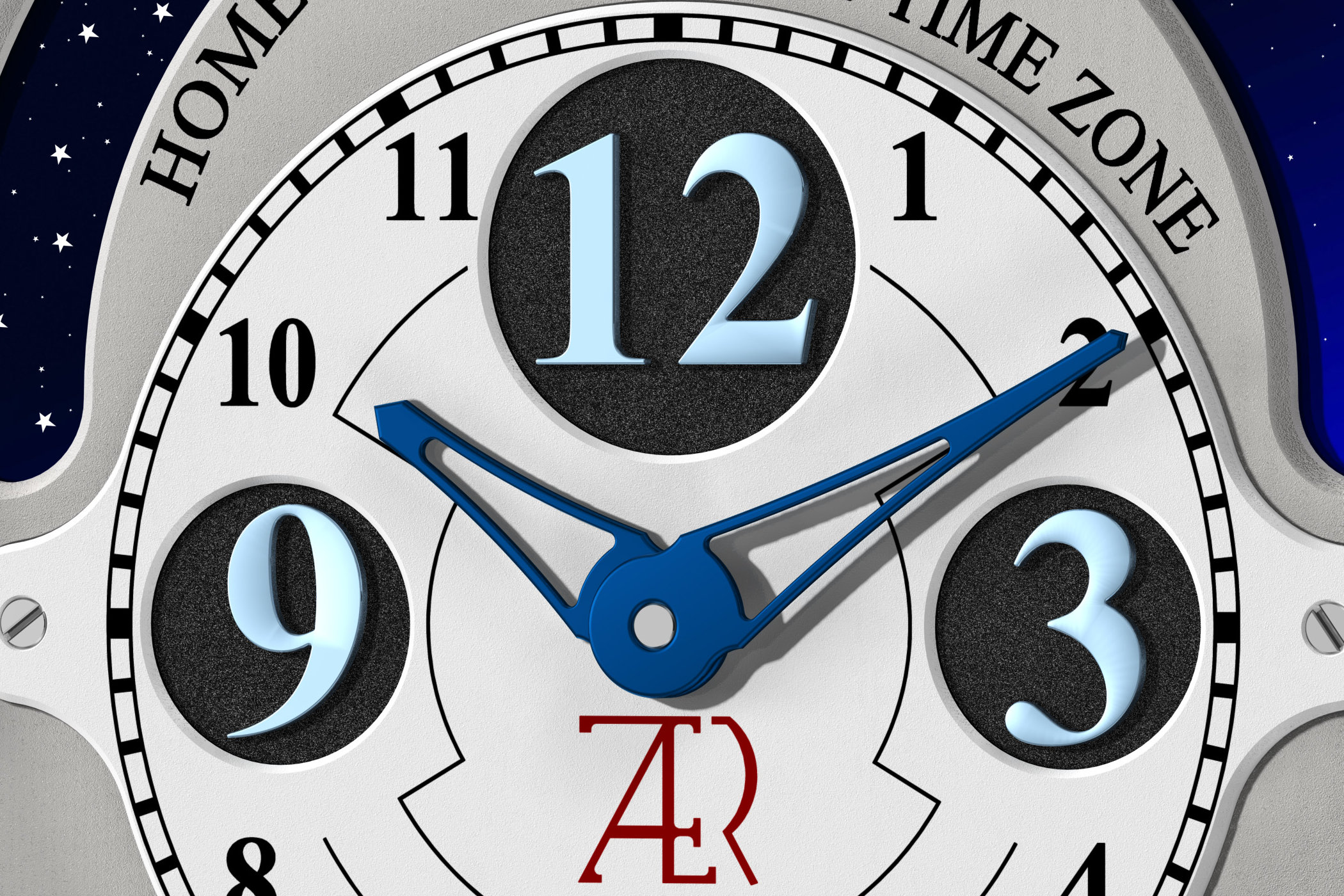 Some specs and details are known, though, so we can share a little more with you. The case, which clearly shows the influence of his former employer, is made of steel and measures 41mm in diameter and 9mm in height. Sandwiched between two sapphire crystals is a dial and movement we’ve never seen before. The Dual Time will feature an offset local time dial with an additional home time display in the top half of the watch. This area indicates the time at home with a day & night disc running underneath an arched aperture. The polished and blued hands for the local time rotate over a dial with large numerals for 3/6/9/12.