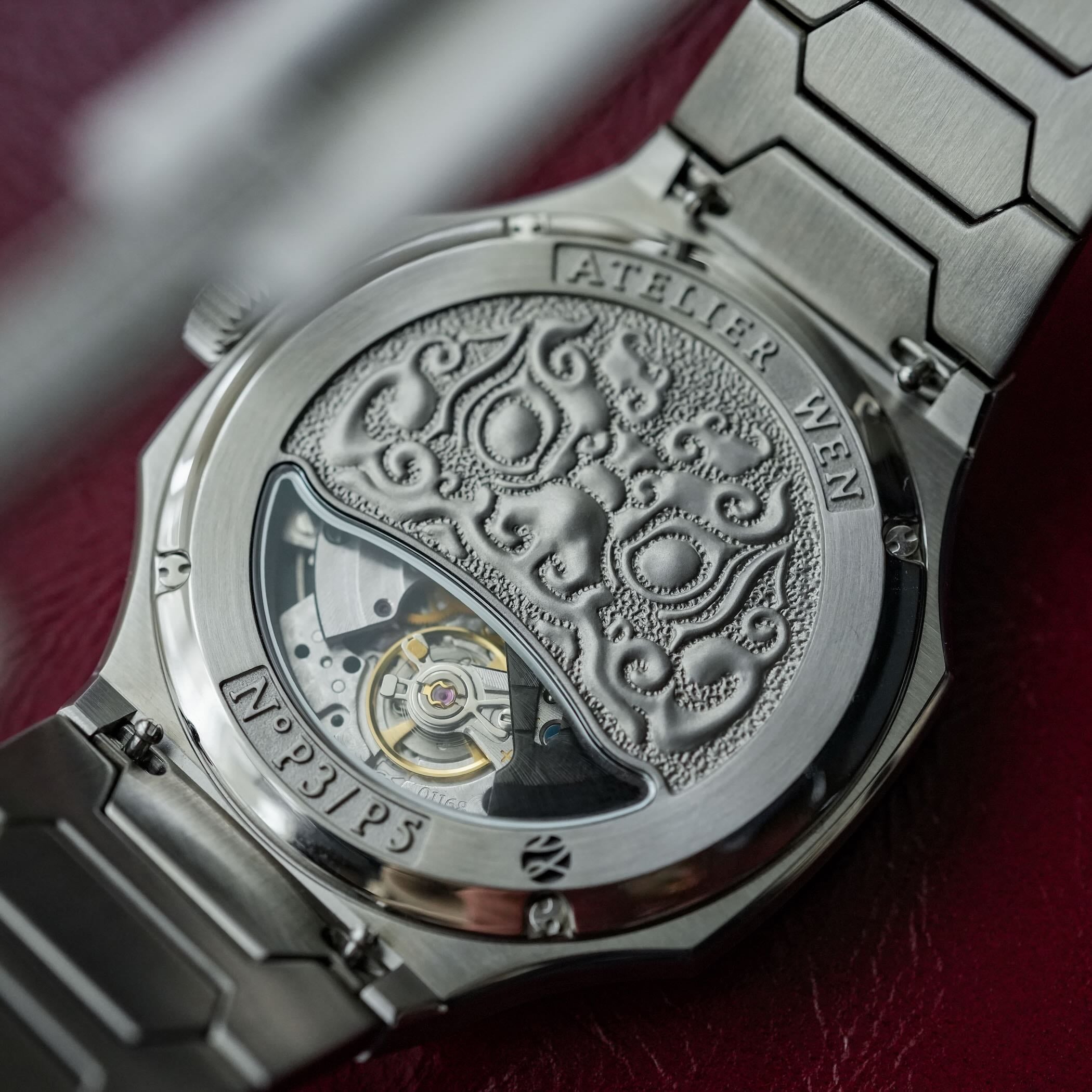The Millésime 2025 edition case retains the familiar Perception construction, crafted from 904L stainless steel, with alternating brushed and polished surfaces. Measuring 40mm in diameter, 47mm lug-to-lug and just 9.4mm thick including the crystal, the case has a slim, well-balanced profile. It is topped with a double-domed sapphire crystal with extensive anti-reflective coating. The semi-display caseback, decorated with a hammered texture and Atelier Wen’s signature stone lion motif, allows a partial view of the mechanism. Water resistance is 100m.