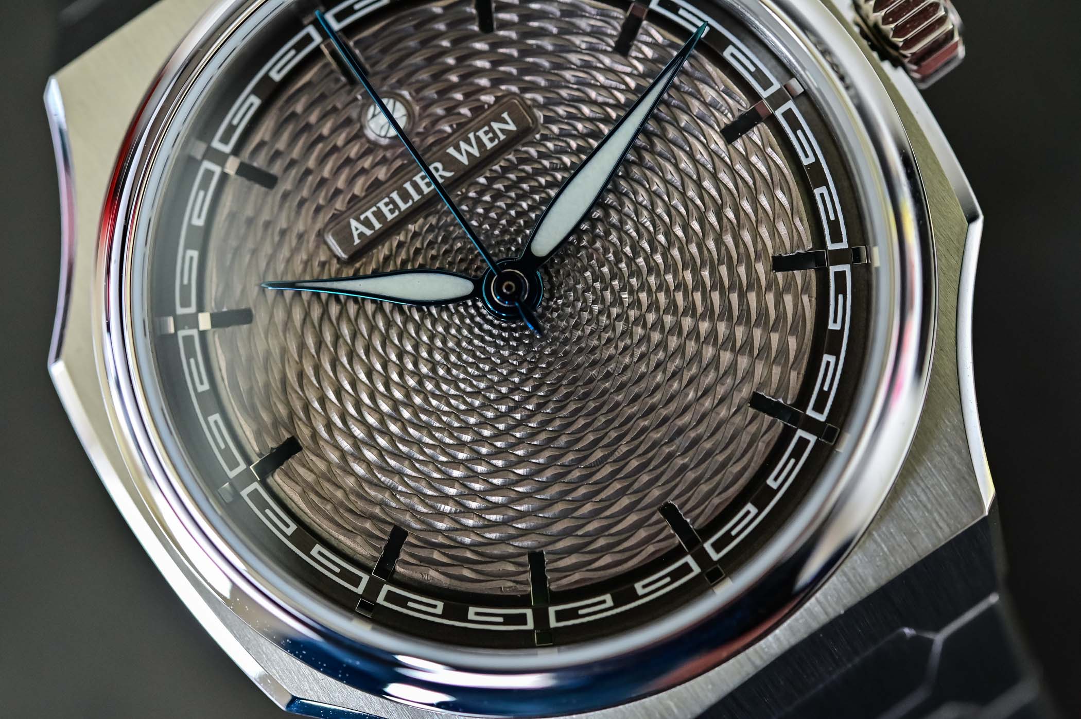 The overall concept behind the Atelier Wen Perception is clearly taking cues from the trendy luxury sports watch category, with its thin, shaped case and an integrated bracelet. The case itself is impressively made, with a real sense of detail. The base, with some scalloped edges, is made from 904L stainless steel and is delicately finished, with a combination of vertically brushed surfaces and strong, contrasting polished accents on the sides of the case, and on the concave, circular bezel. The proportions of the case are spot-on, with a modern yet relatively compact 40mm diameter and pleasant slenderness, with a 9.4mm height. The case features all the necessary equipment, including a sapphire crystal on top with an anti-reflective coating, a screw-down crown and 100m water-resistance. And although the watch you see here is an early prototype, the definition of the parts is already very satisfying – and will be better once the watches enter production.