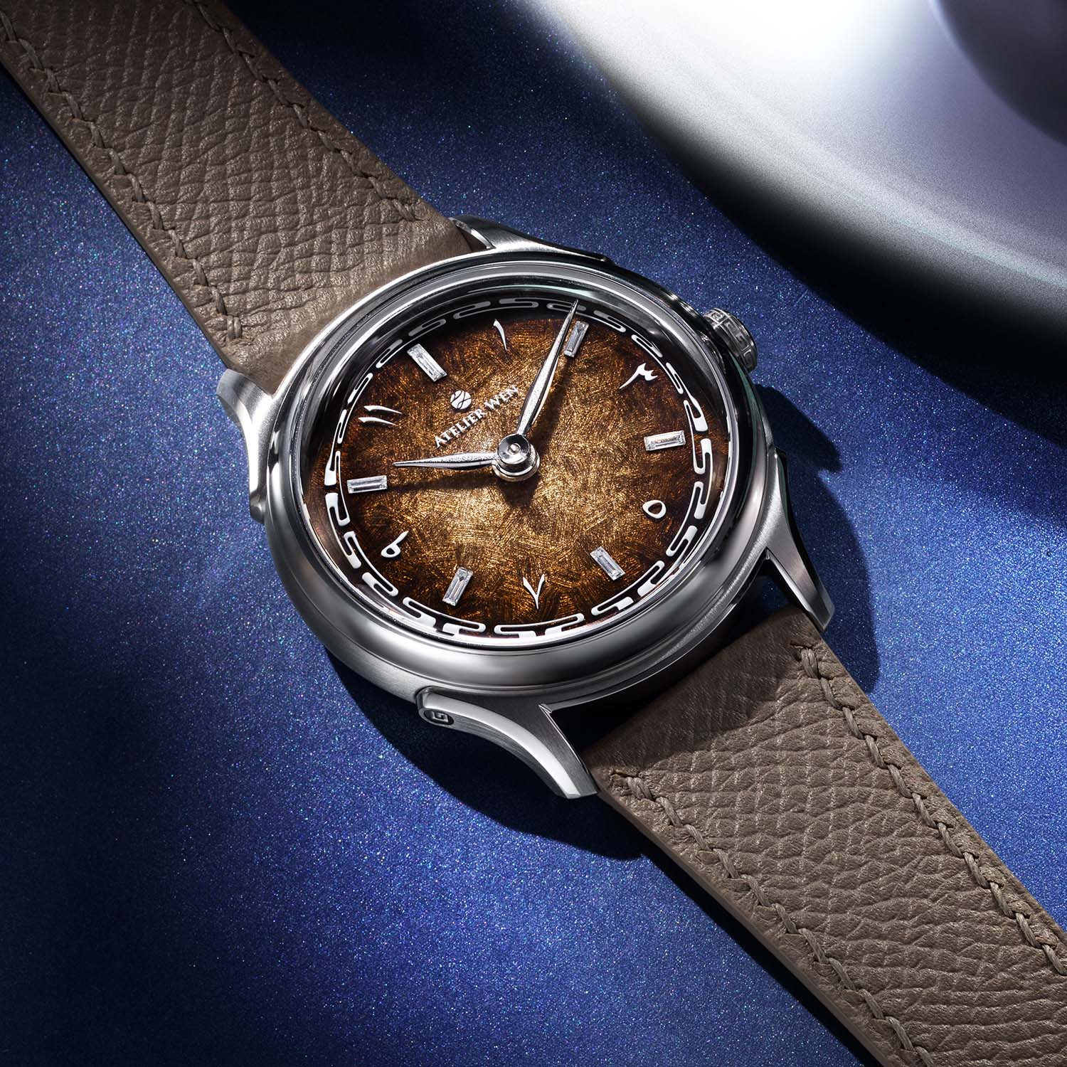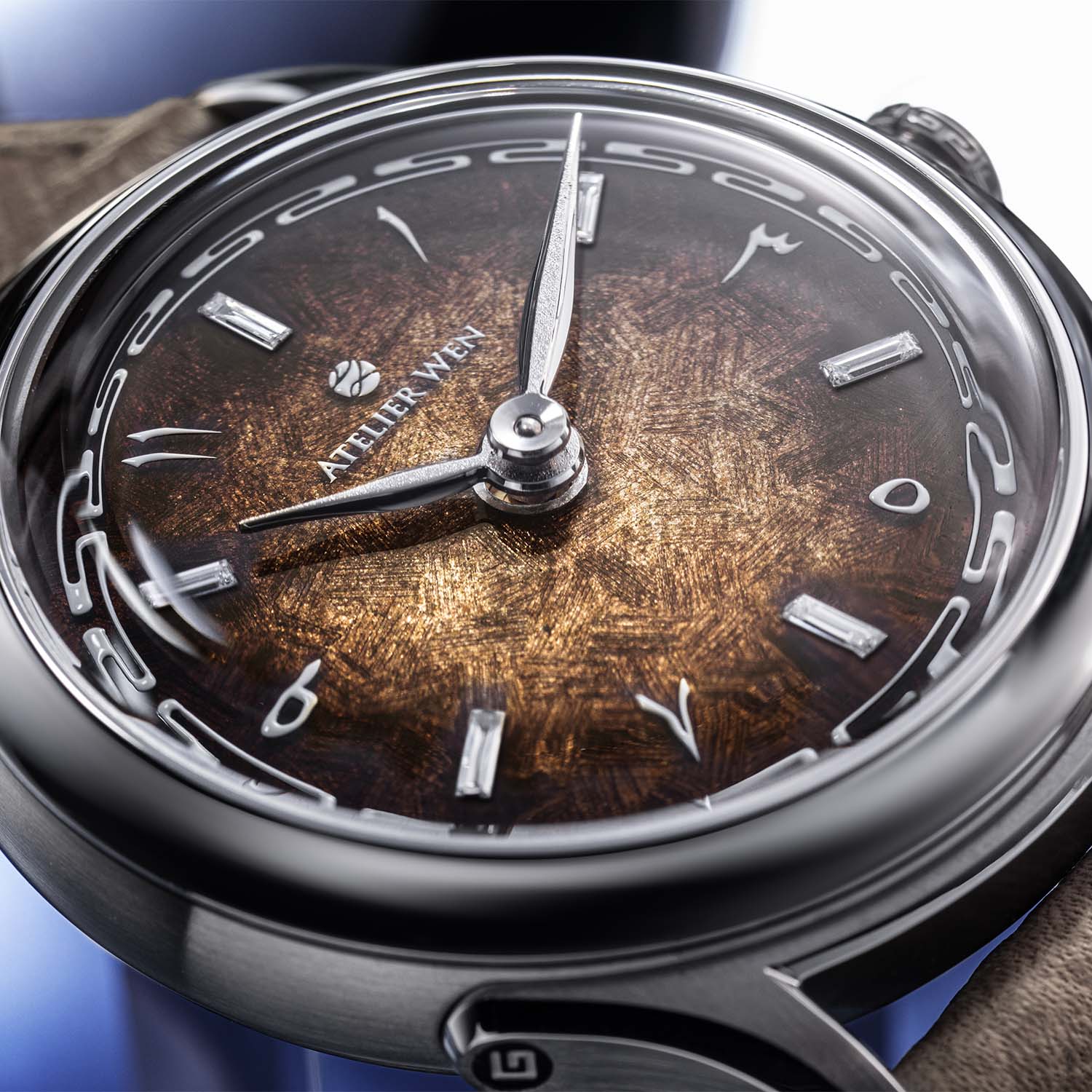 The dial is where the “Silk Road” narrative comes alive. Crafted by Kong Lingjun’s Beijing atelier, it starts with a hand-worked 925 silver gratté base, its fabric-like texture created not with sandpaper but with a custom eight-bladed engraving tool. Over this, layers of translucent fumé grand feu enamel shift from light sand in the centre to dark chocolate at the rim – colours chosen to echo desert landscapes and the earthy tones of the Middle East.