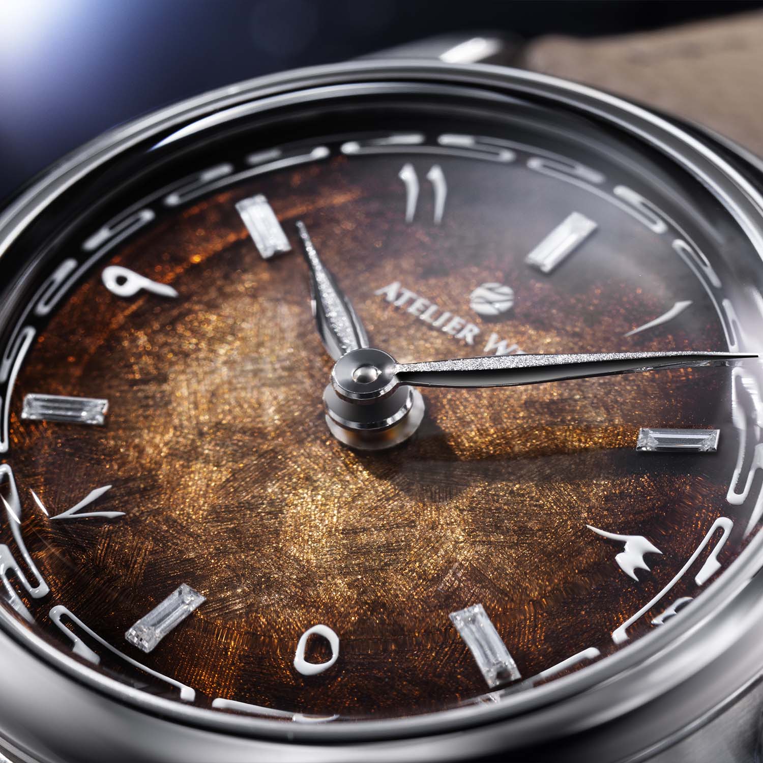 Hour markers alternate between Eastern Arabic numerals (odd hours) and lab-grown baguette-cut diamonds (even hours). Rhodium-plated, tri-planed hands continue the play of light and a micro-hammered mid-plane flanked by sharply polished concave facets that shimmer as the watch moves.