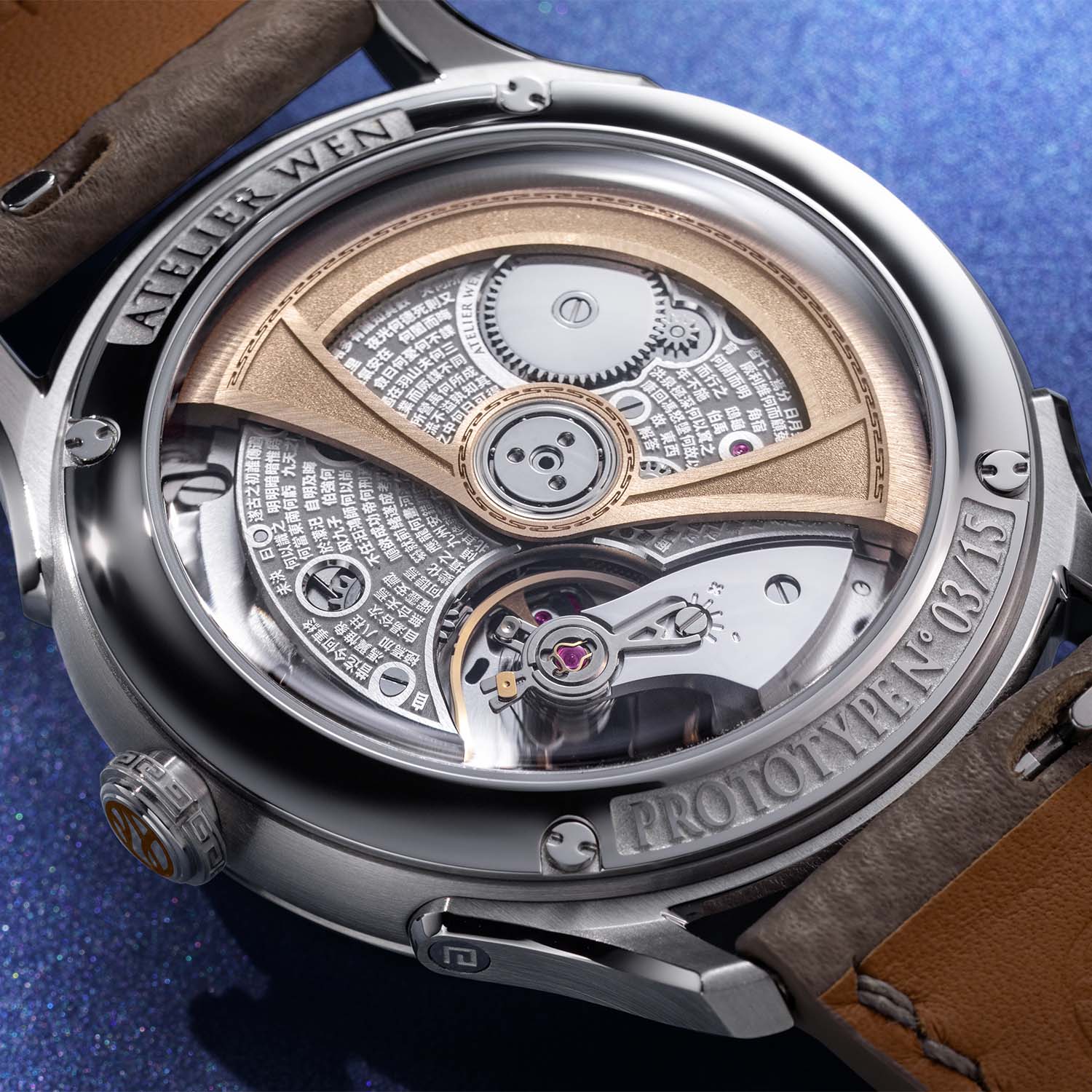 The Atelier Wen x Revolution Ancestra is powered by a customised Pequignet EPM03 automatic movement, visible through the back. The three-quarter bridge is deeply micro-etched with lines from Questions to Heaven. Finishing is very considered: black-polished balance bridge and ratchet-return wheel, a rotor combining snailing on the raised edges, frosted recesses and a perimeter motif of hui wen. The calibre operates at 28,800 vibrations/hour, offers a 65-hour power reserve, uses bi-directional winding and is regulated in six positions and three temperatures to exceed chronometric standards.