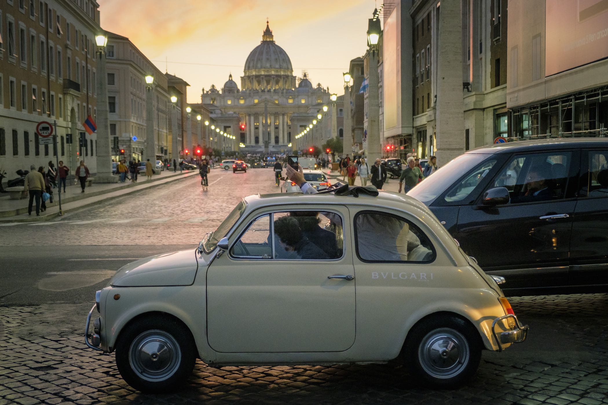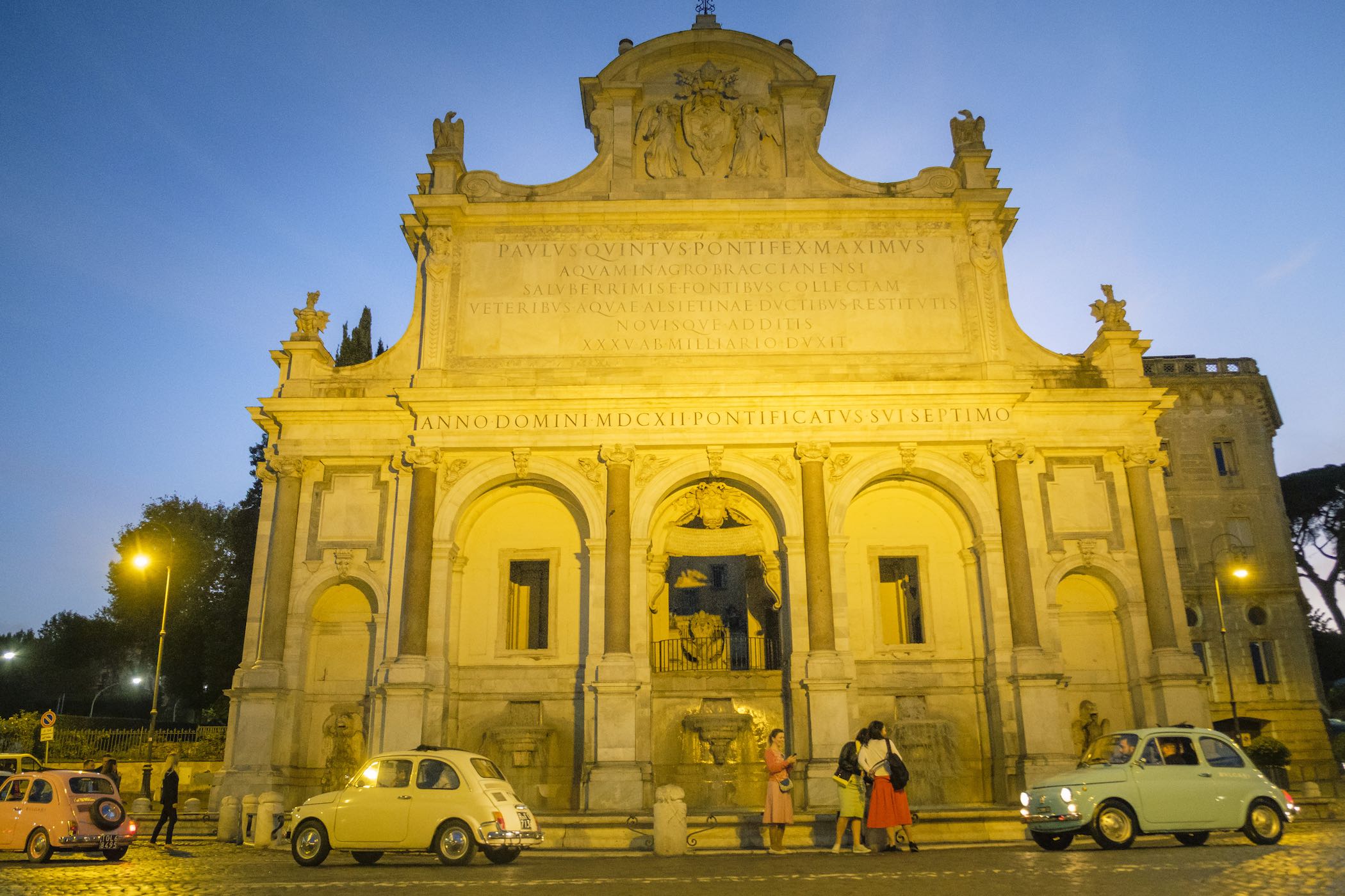After we left the boutique and climbed to the top of the Spanish steps, we met our tour guides for the evening; a series of colourful Fiat 500’s, driven by even more colourful characters. As you might imagine, eight little Fiat 500’s driving around Rome in a mini-convoy and being pursued by a photographer on a bright yellow Vespa caused somewhat of a spectacle, with many tourists and locals alike stopping to take photos.