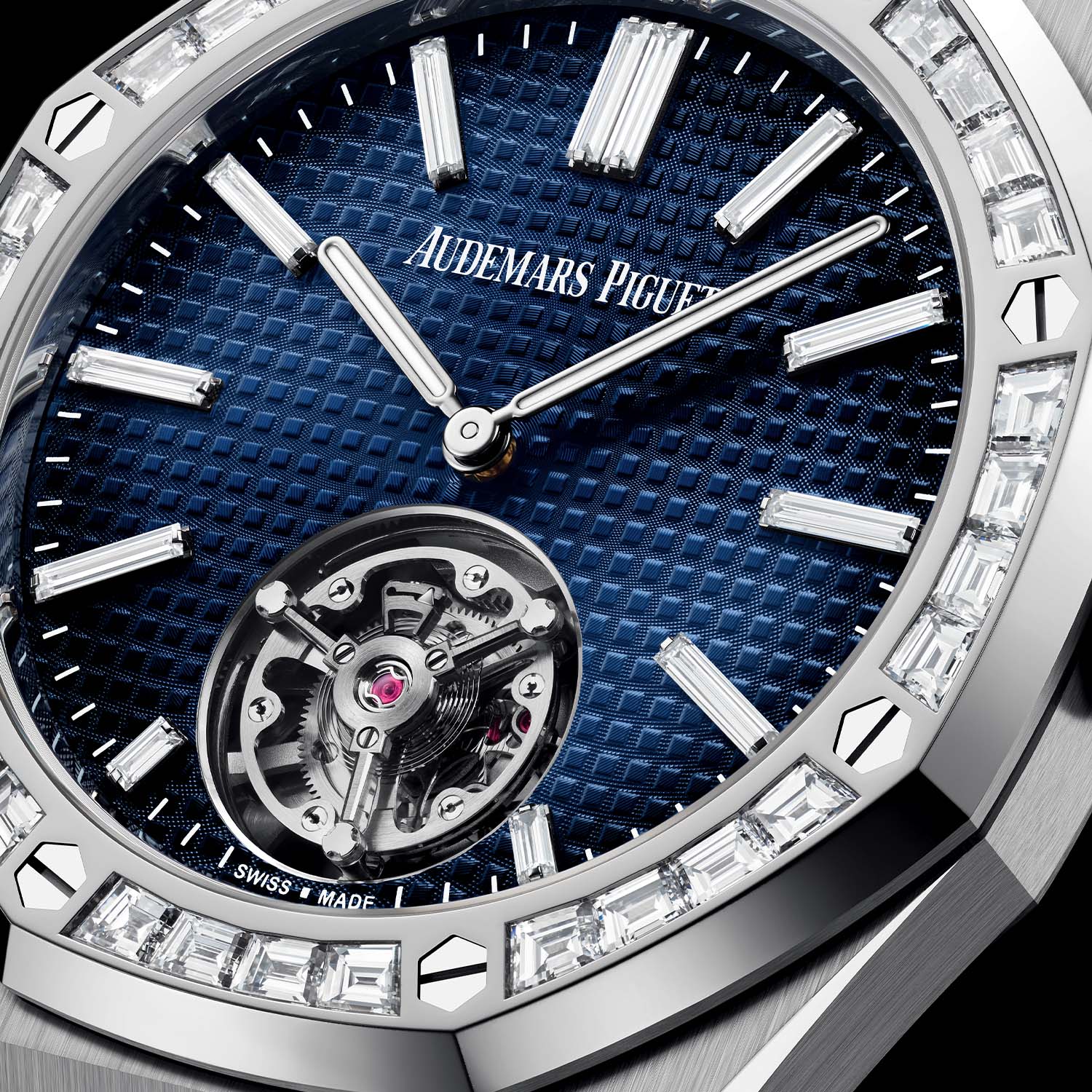 Also new to the 37mm range is the smoked blue dial colour obtained by PVD (physical vapour deposition). The smoked or gradient effect on the periphery is produced by spraying black varnish while the dial is rotating. The classic Petite Tapisserie pattern plays beautifully with the light, and the original Royal Oak bathtub-shaped hour markers are now represented by 12 gleaming baguette-cut diamonds. The original bathtub-shaped hands of the Royal Oak are featured here and filled with luminescent material to assist legibility in low light conditions. Performing its rotations at 6 o’clock, the titanium flying tourbillon cage completes the picture with its rhodium-plated balance wheel placed at dial level.