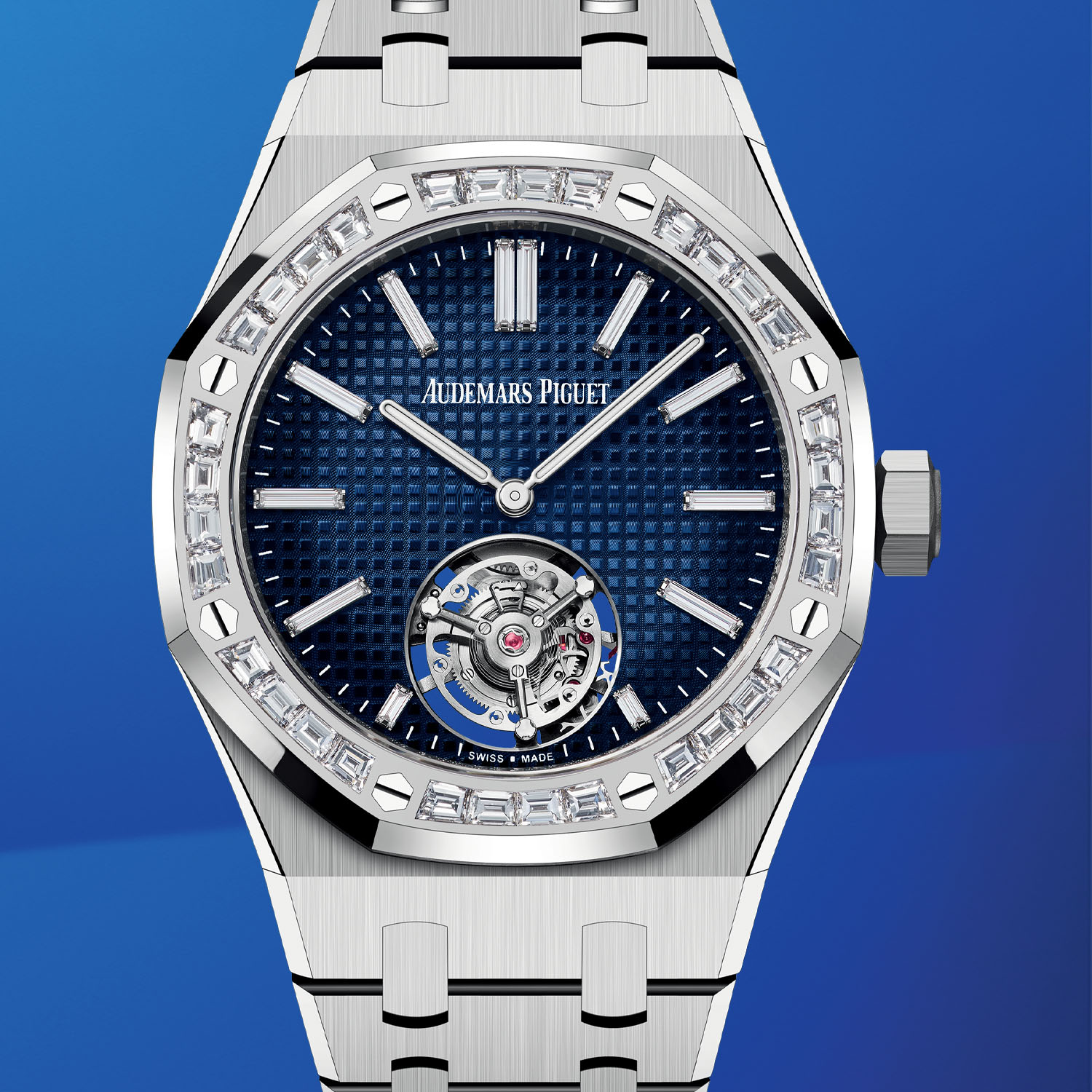 A luxurious white gold version of AP’s extra-thin flying tourbillon with a sprinkling of baguette-cut diamonds and a dark blue smoked dial.
