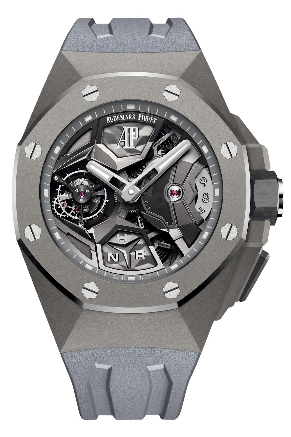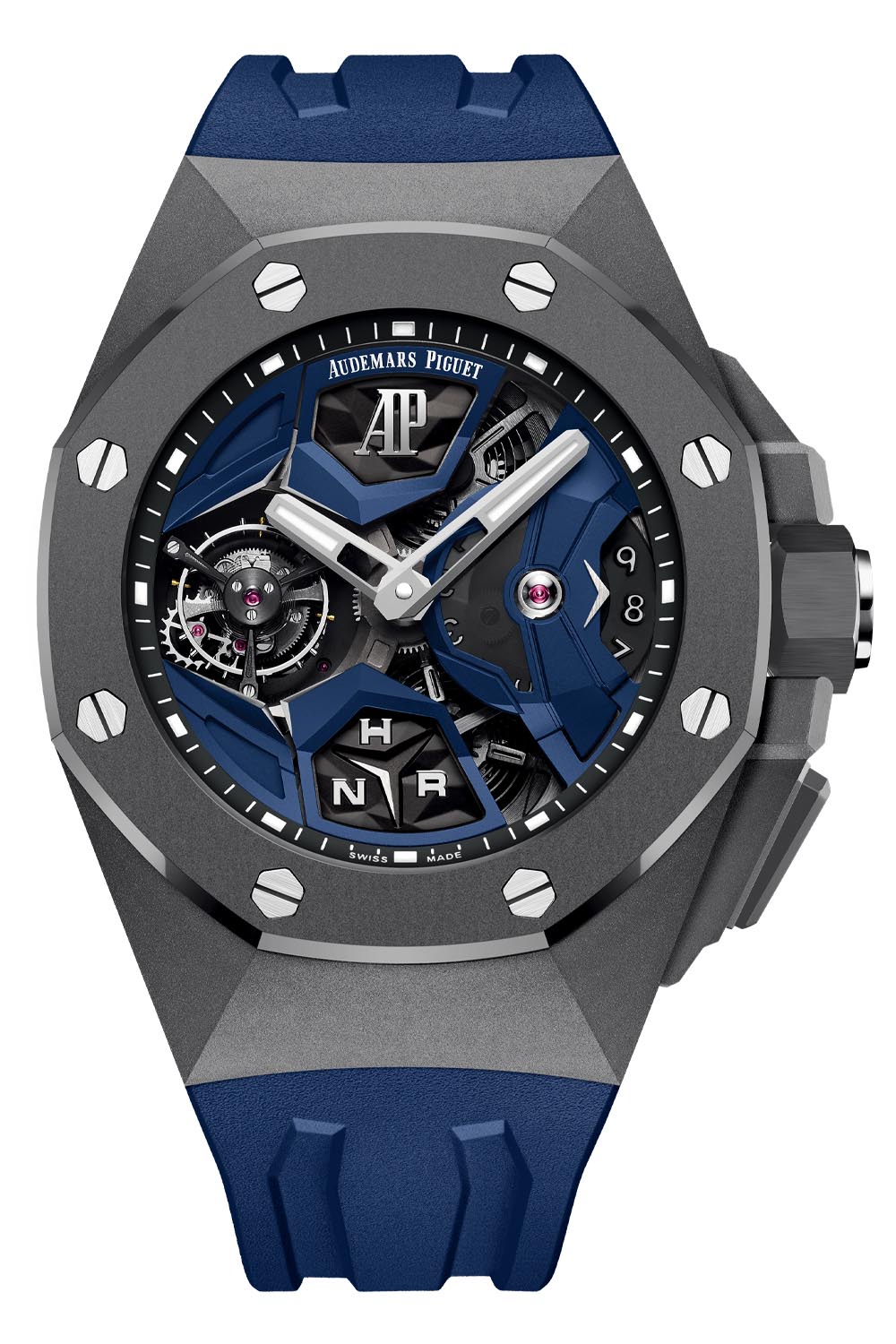 The blue Royal Oak Concept Flying Tourbillon GMT (ref. 26589IO.OO.D030CA.01) comes with a blue rubber strap with a sandblasted titanium folding clasp and an additional black rubber strap and retails for USD 198,400. The grey model (ref. 26589TI.GG.D006CA.01), however, is a limited edition of 30 pieces and comes with a matching grey rubber strap and an additional grey alligator leather strap.
