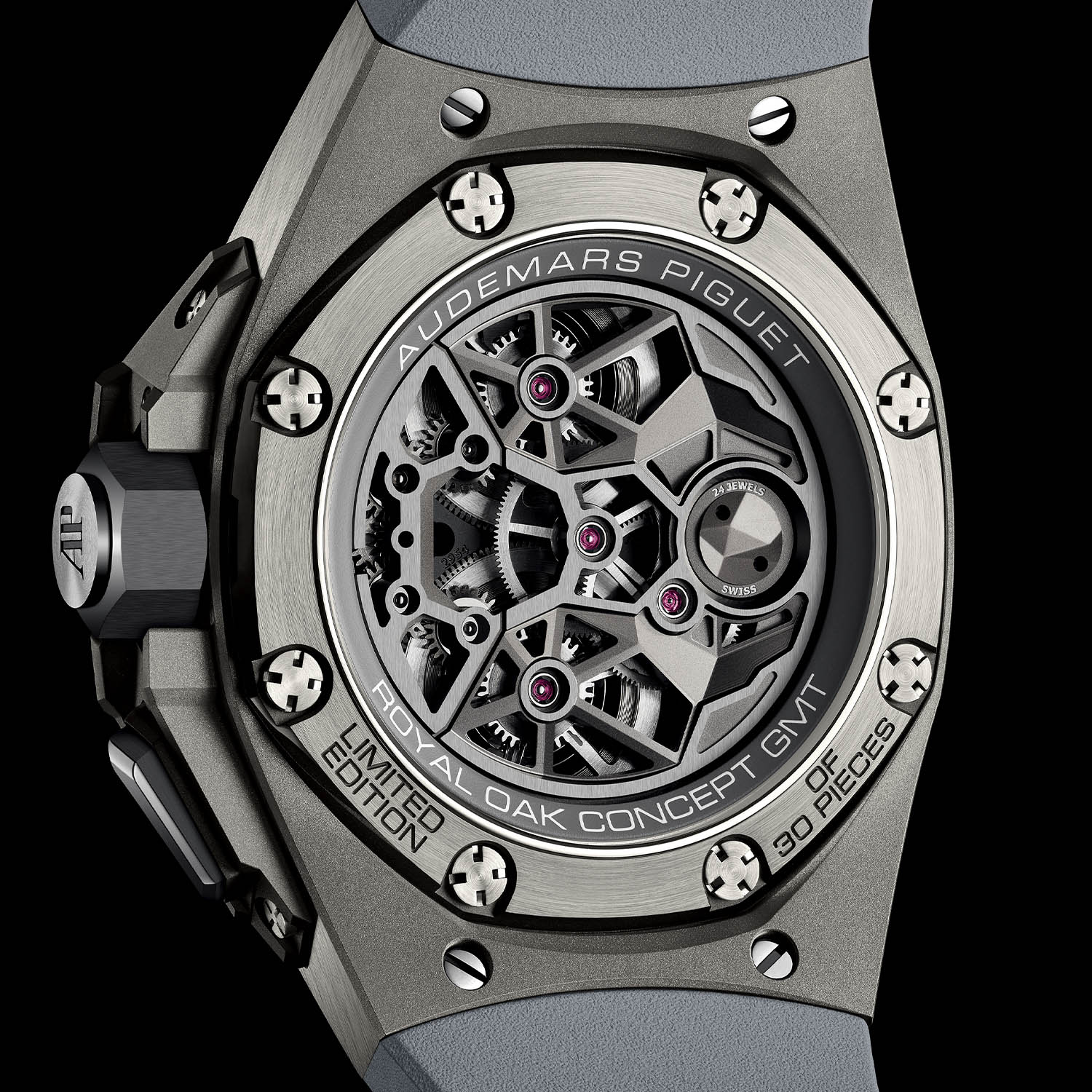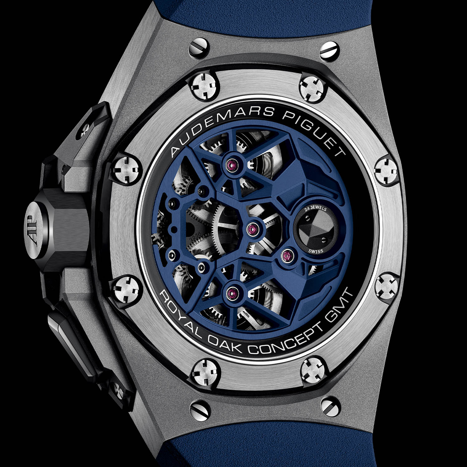 One of the prevailing concepts behind the Royal Oak Concept collection is the integration of all the elements; the case and the grey or blue rubber strap, for example, flow seamlessly into one another and the boundaries between the dial and the movement dissolve.