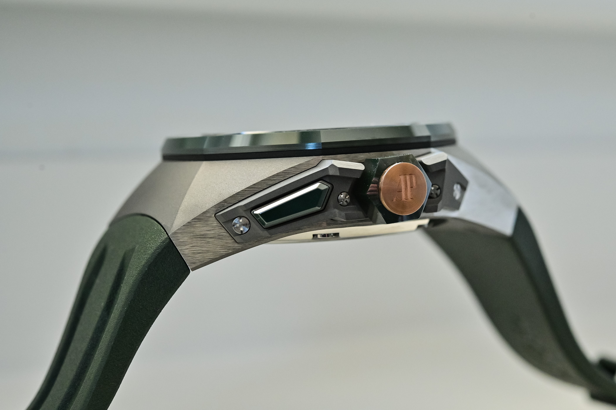 Matching the bezel and accents on the dial and case, a green rubber strap with a sandblasted titanium AP folding clasp completes the package.
