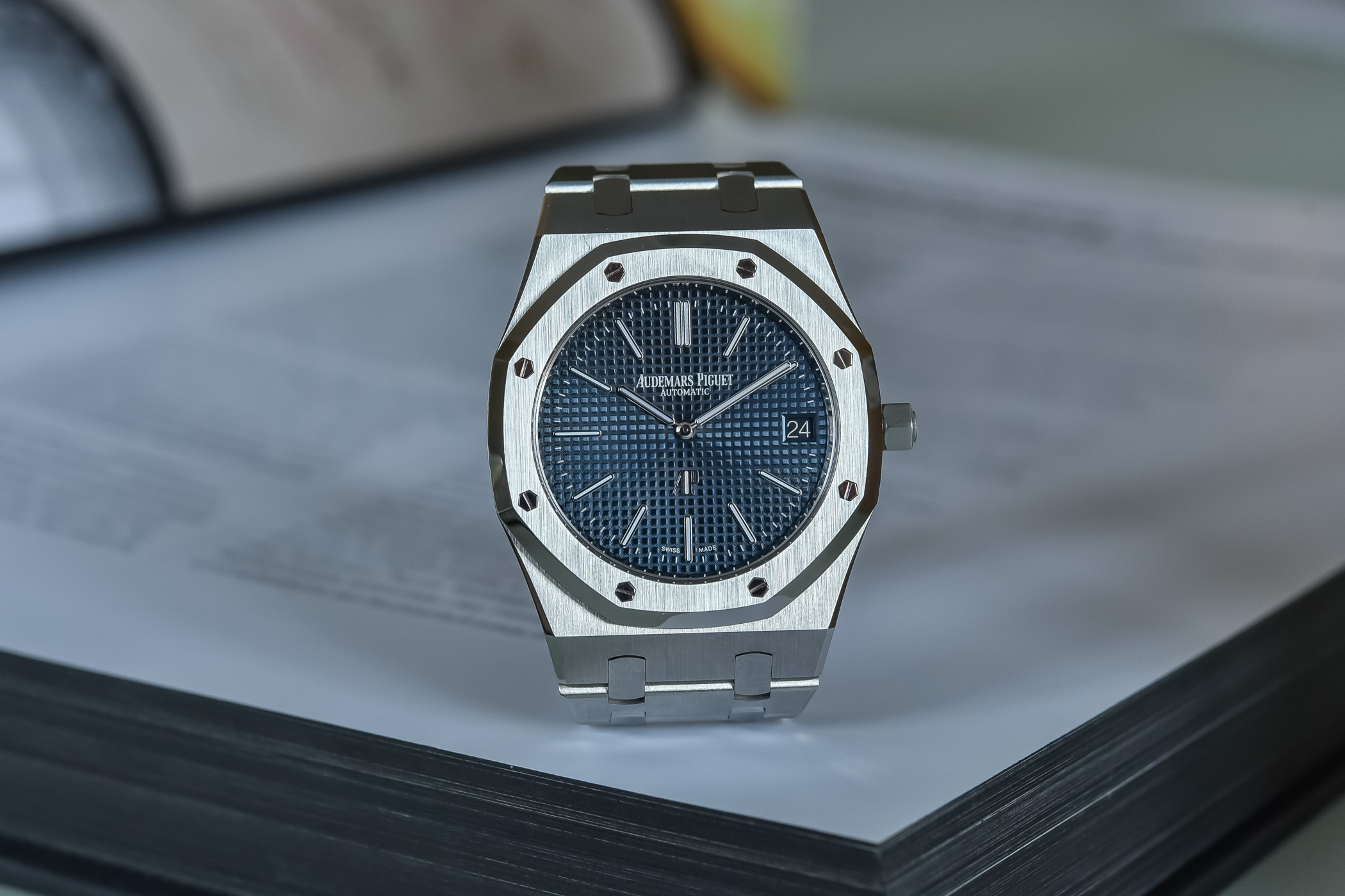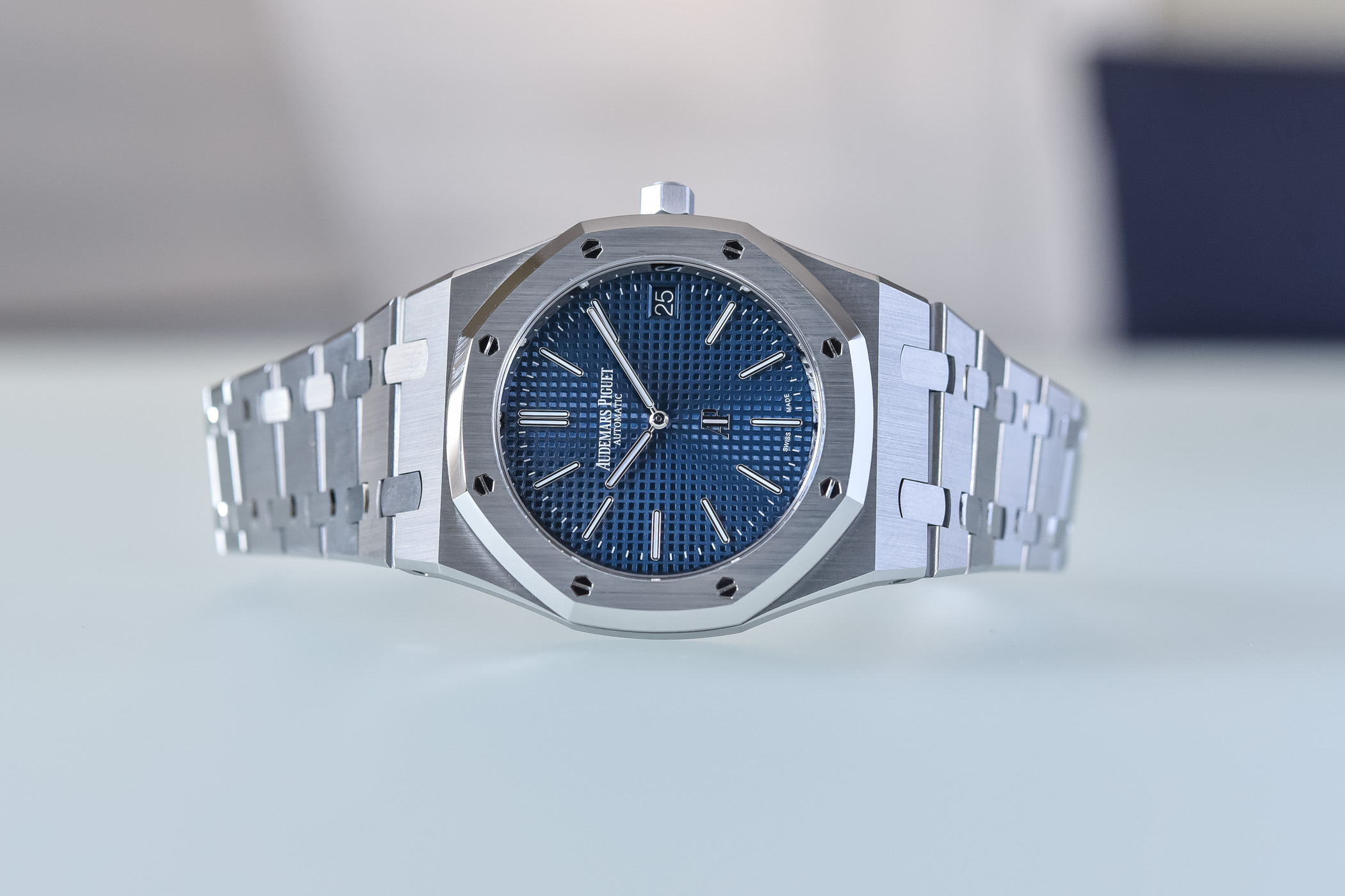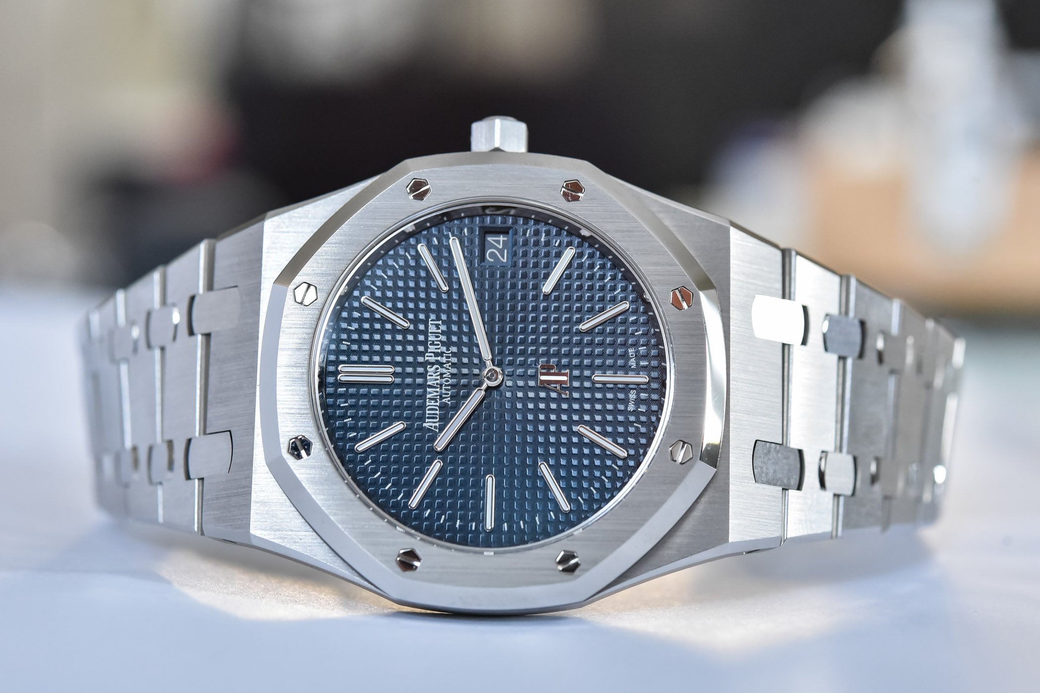 Other factors that did not change are the dial, the markers and the hands. The dial colour remains the same blue, which Audemars Piguet calls Bleu Nuit, Nuage 50 – which, translated to English, is “night blue, cloud 50”. Also, the hour markers, the minuterie (minute markers), the applied AP logo, the “Audemars Piguet automatic” printing and the date window are all the same. Although it is almost impossible to see, the date window has been moved a fraction of a millimetre towards the edge of the dial.