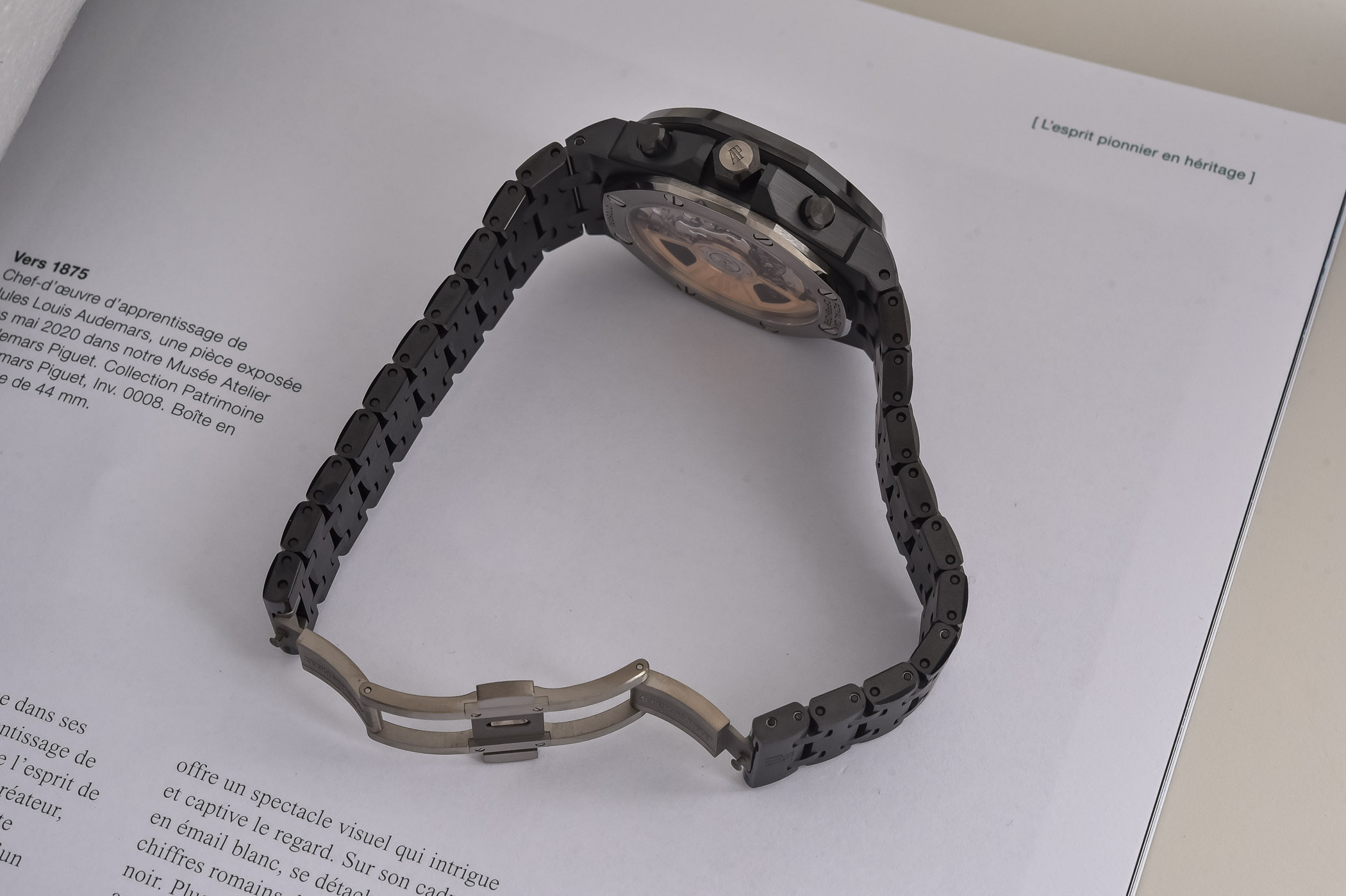 Talking about materials, the ROO has always been at the forefront of innovation. Initially released in steel with rubber inserts, AP quickly imagined variations around The Beast in titanium and forged carbon, as well as multiple models with ceramic parts. But, to my greatest surprise (I actually never thought about it), the ROO collection never featured a watch made entirely of ceramic, bracelet included. Actually, full ceramic watches aren’t that old at Audemars Piguet and first materialised in the Royal Oak collection in 2017 with the Black Ceramic Perpetual Calendar.