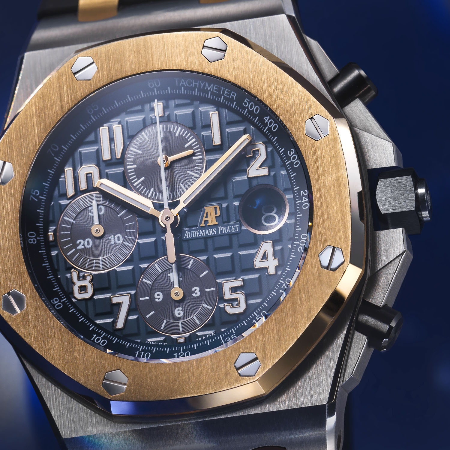 The deep blue “Méga Tapisserie” dial features the larger squared pattern of the Royal Oak Offshore line, differing from the smaller and tighter “Petite Tapisserie” from vintage models and “Grande Tapisserie” that falls between the two. A large circular date window sits at 3 o’clock with white print on a black background and is framed in gold. The chronograph layout has the small seconds at 12 o’clock, 12-hour counter at 6 o’clock and 30-minute counter at 9 o’clock, and all sub-dials have a snailed pattern. The applied gold Arabic numerals and hour and minute hands have white Super-LumiNova inserts. An internal tachymeter sits over the patterned dial in matching blue, while the applied AP logo and name are on a flattened section of the dial to the left of the date.